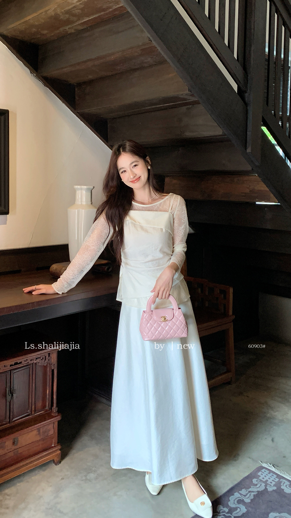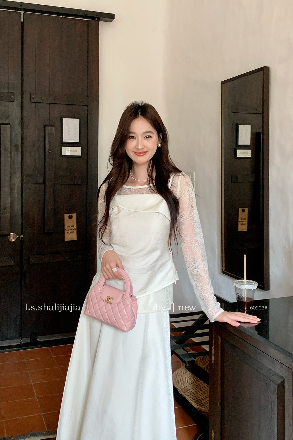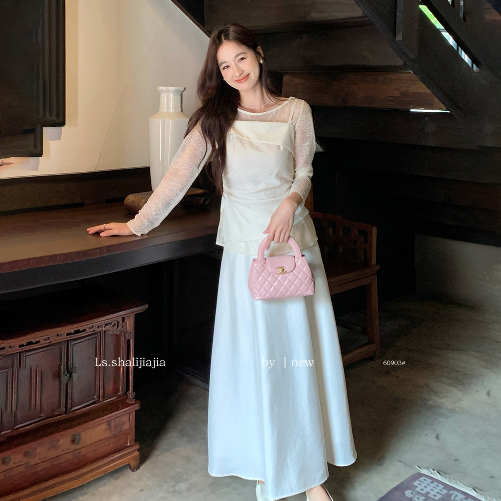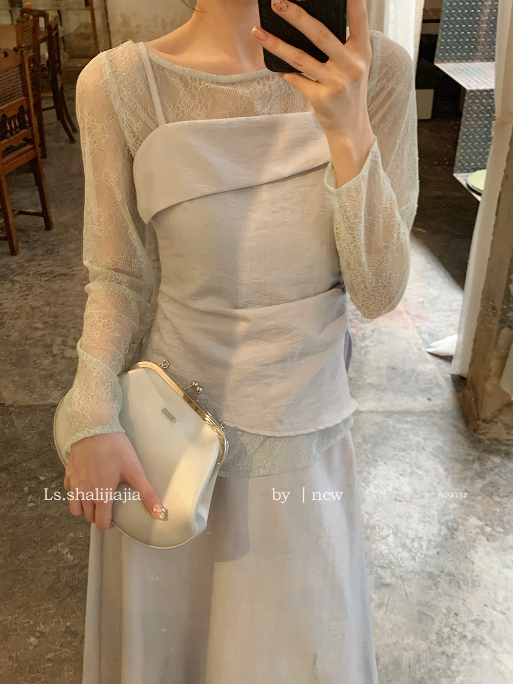 LS 25 년 새로운 순수 우아한 세트 여성 조커 기질 레이스 셔츠 스커트 3 피스 세트 60903스토어 가기