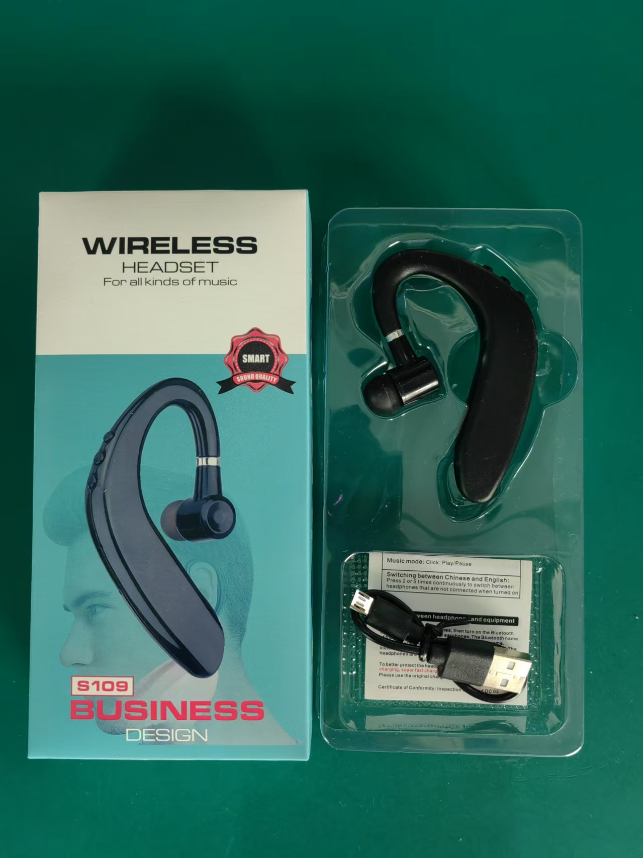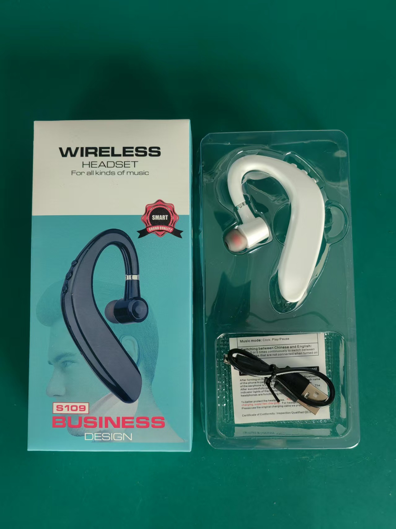 S109蓝牙耳机,可180°旋转左右耳佩戴,蓝汛方案,10mm喇叭。 电池分为两种配置,电池55mA 90mA可袋装出货,盒装出货。