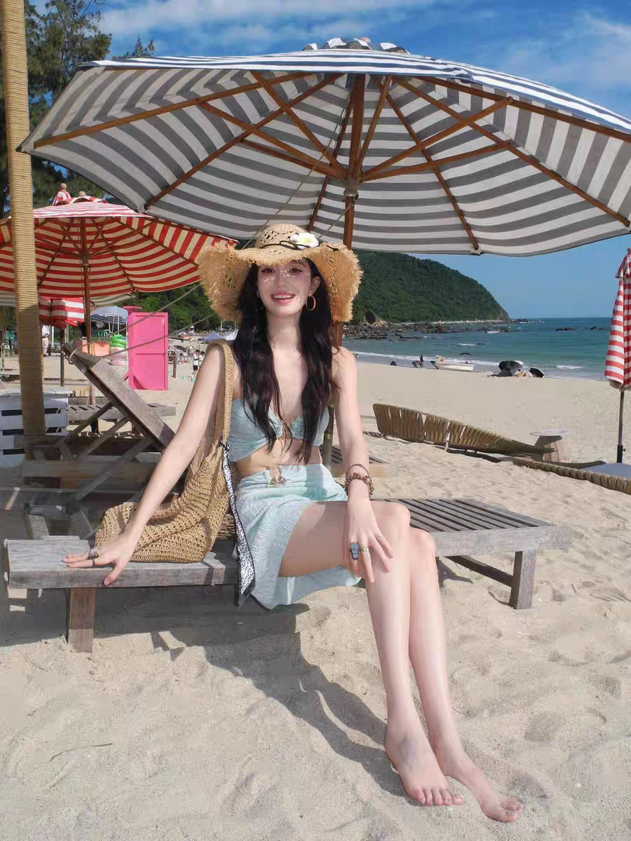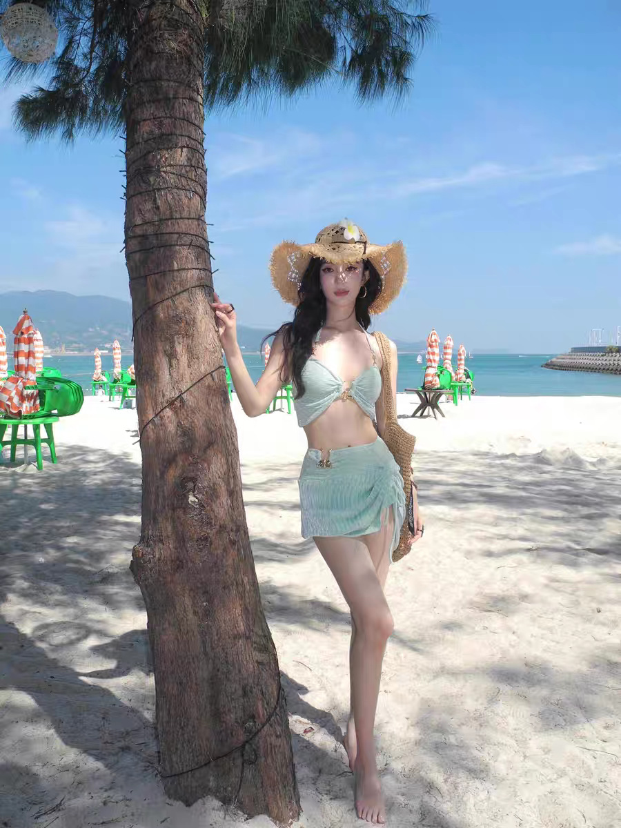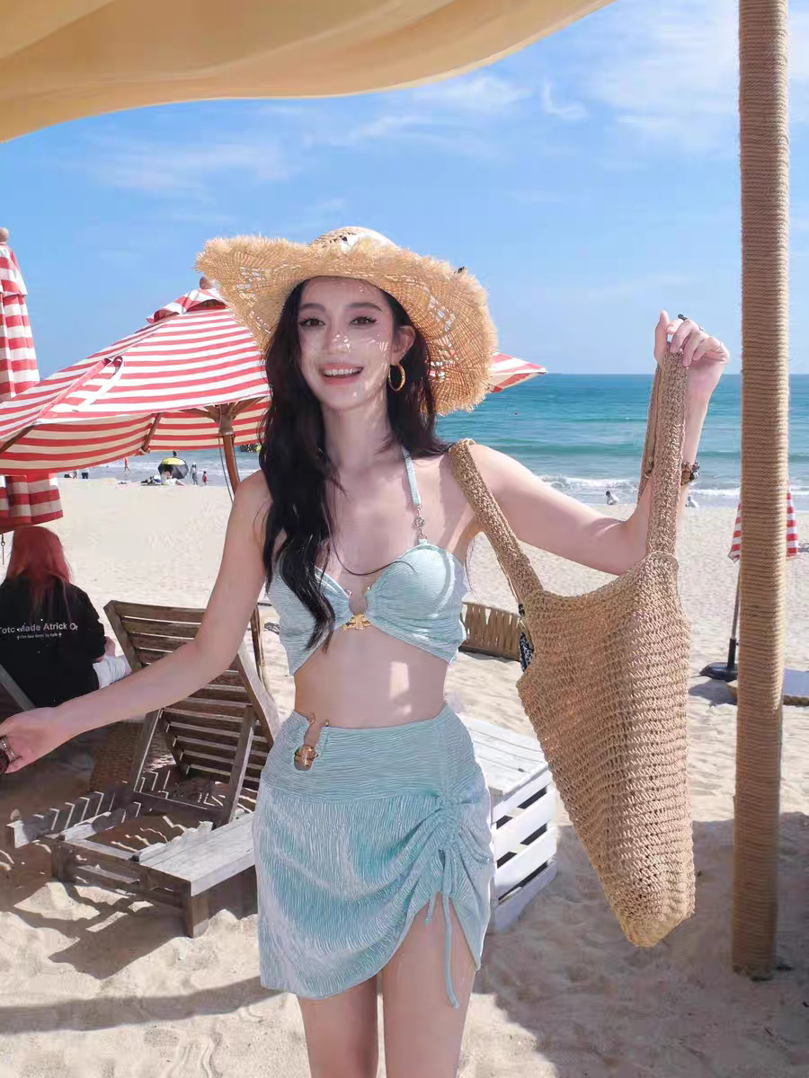 2025 새로운 수영복 여성 스플릿 비키니 휴가 세 조각 세트 섹시한 슬림 배꼽 커버 수영복 온천