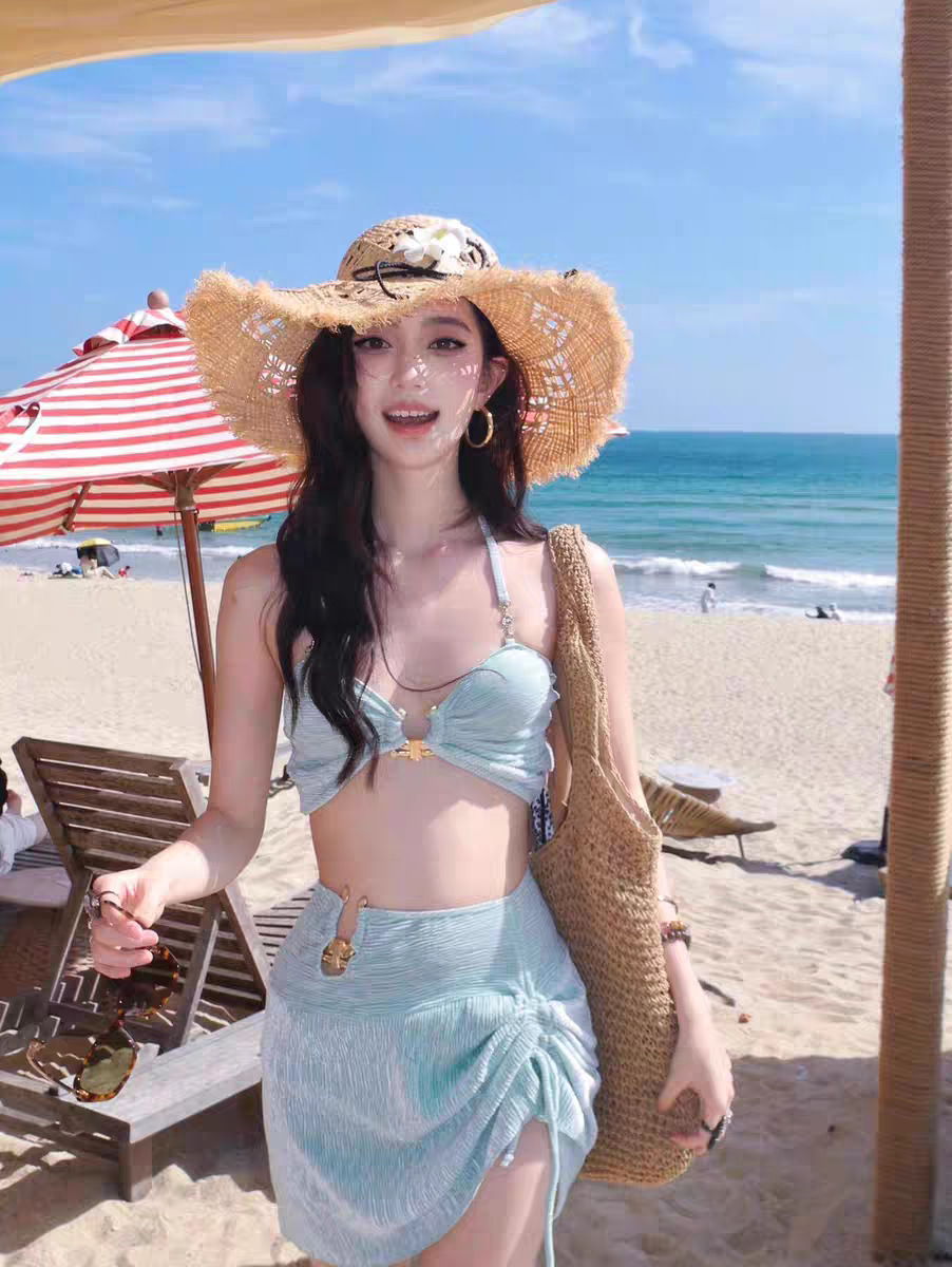 2025 새로운 수영복 여성 스플릿 비키니 휴가 세 조각 세트 섹시한 슬림 배꼽 커버 수영복 온천스토어 가기
