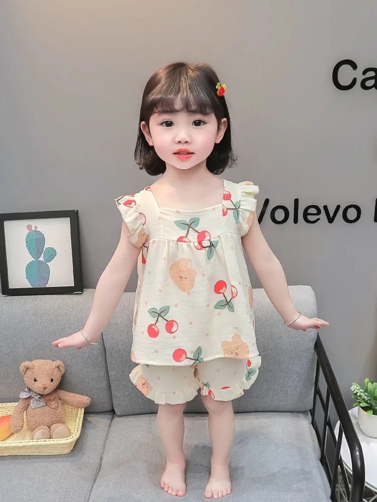 아기의 거즈 잠옷 소녀의 여름 어린이 에어컨 세트 큰 어린이 얇은 슬링 공주 스타일 홈 옷 세트