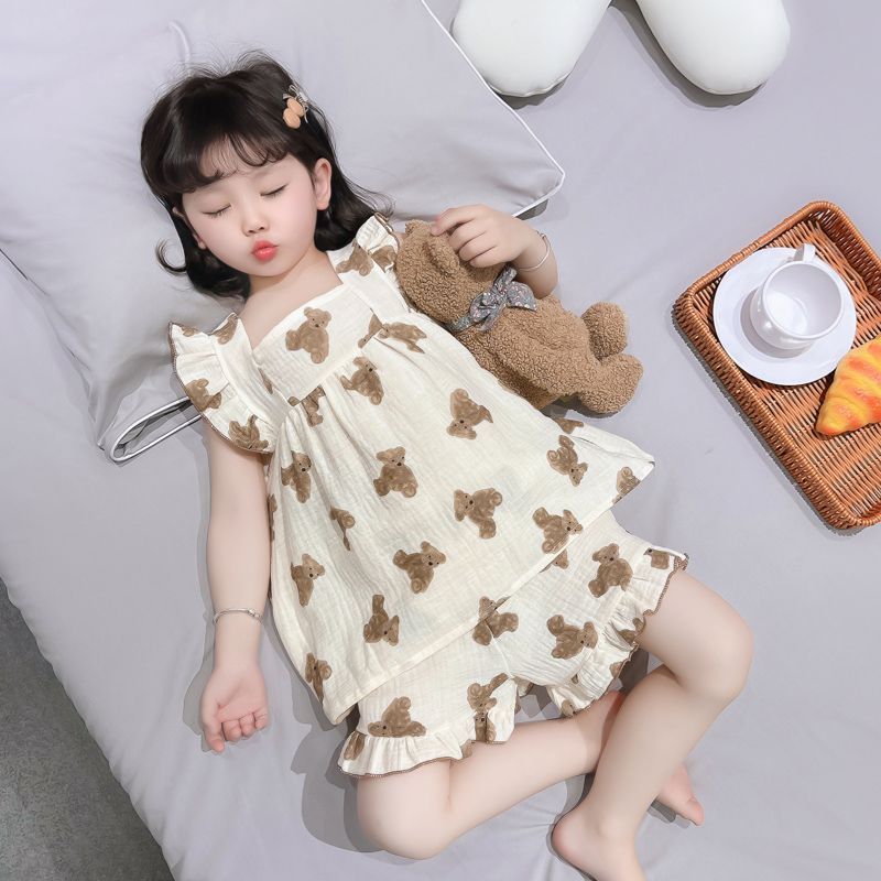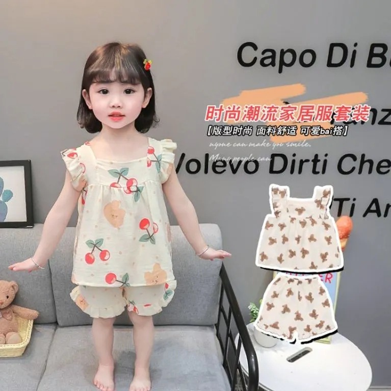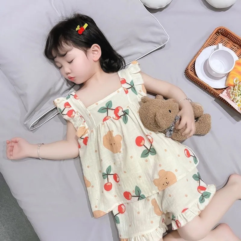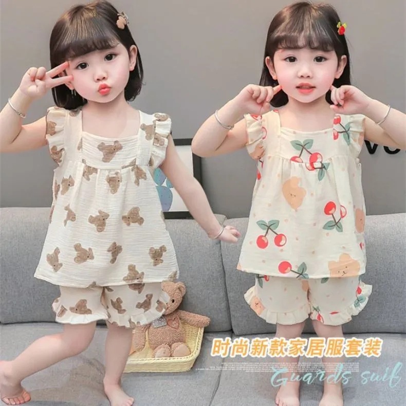 아기의 거즈 잠옷 소녀의 여름 어린이 에어컨 세트 큰 어린이 얇은 슬링 공주 스타일 홈 옷 세트스토어 가기
