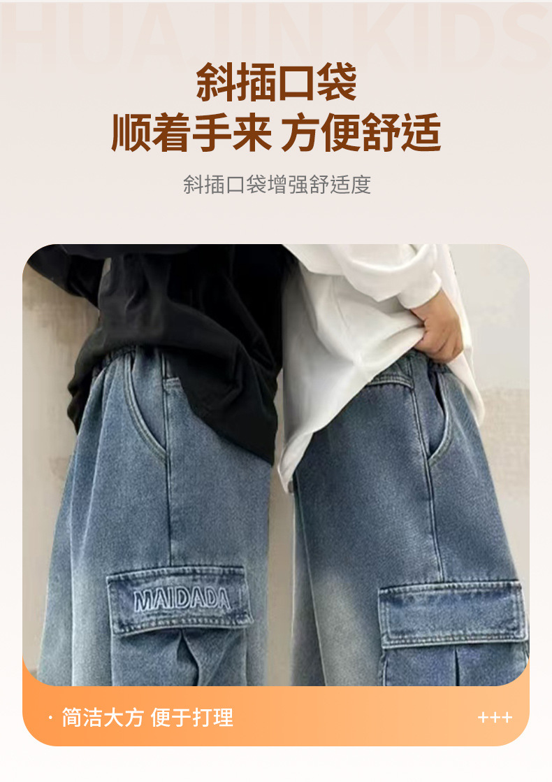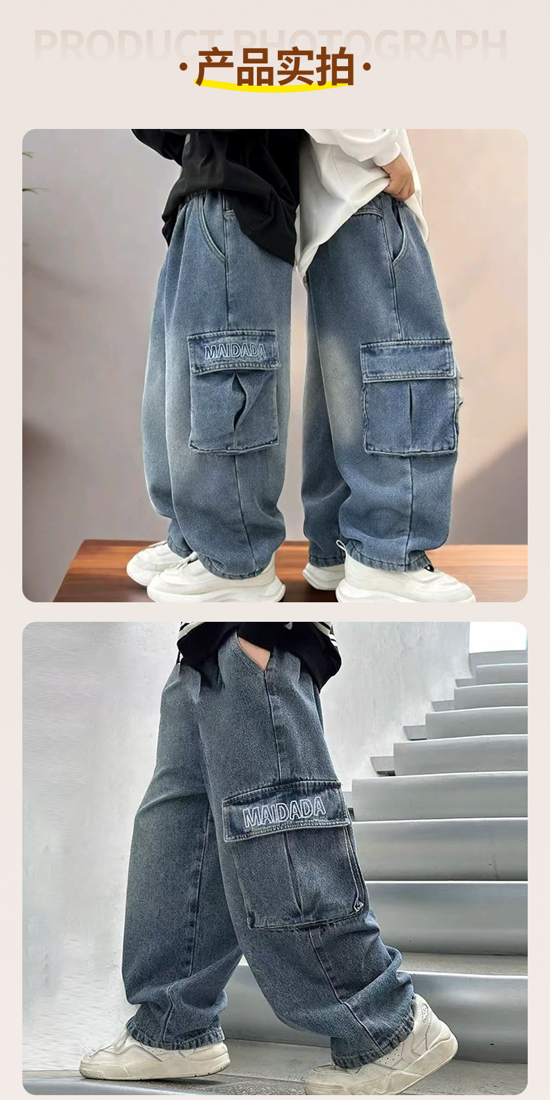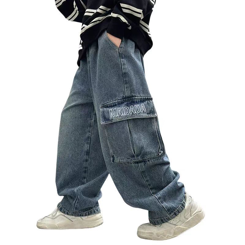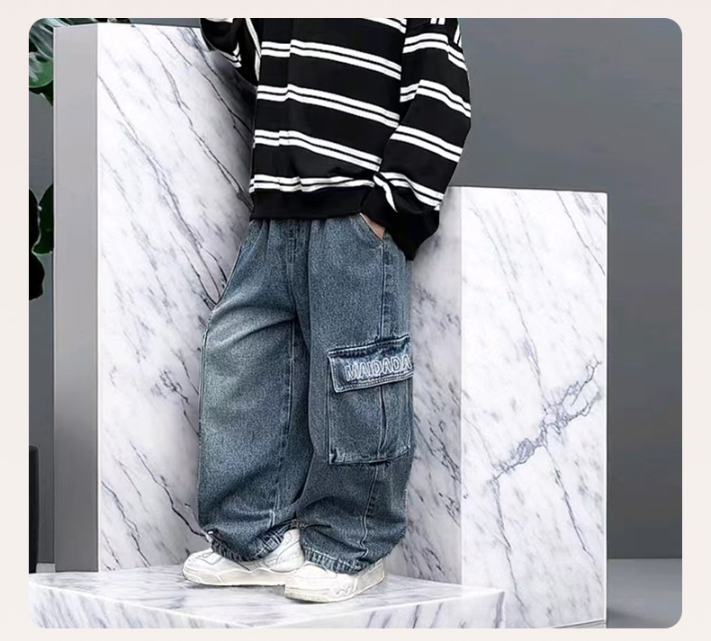 소년 바지 봄과 가을 새로운 어린이 봄 착용 도구 청바지 큰 어린이와 소년을위한 큰 포켓 느슨한 바지