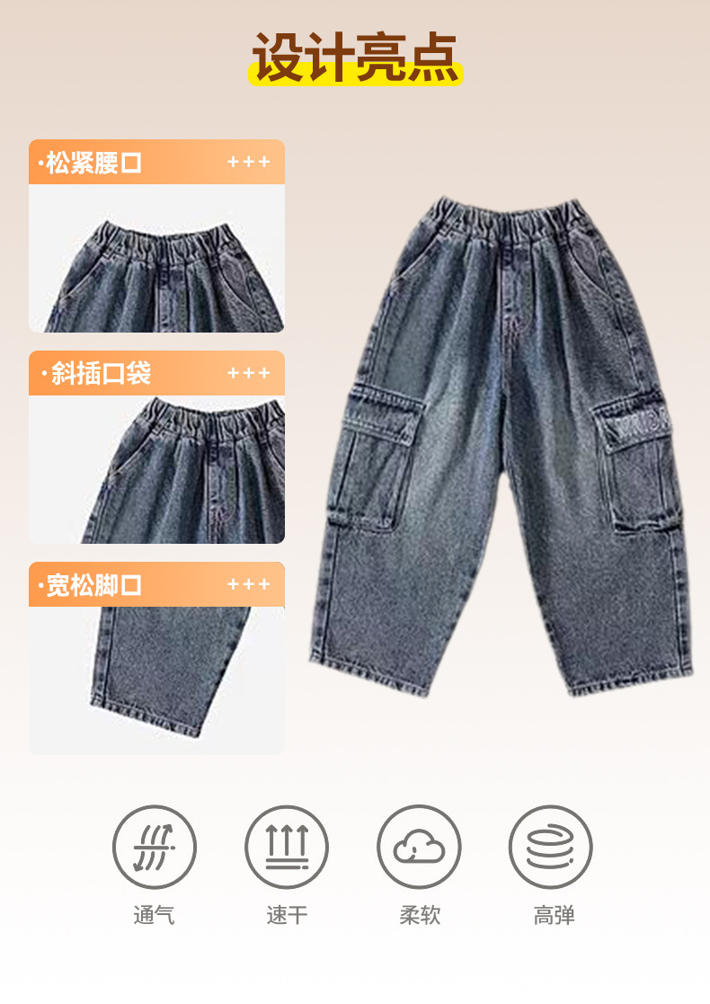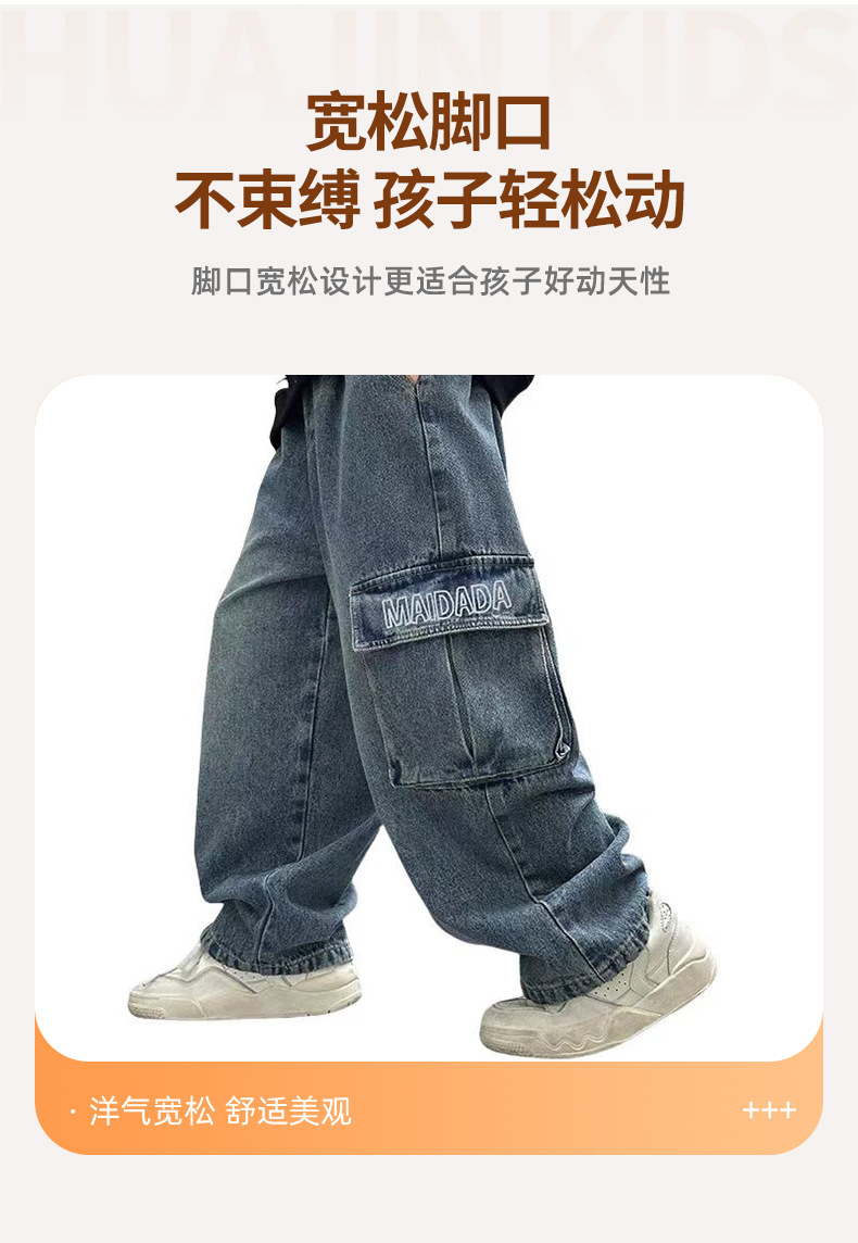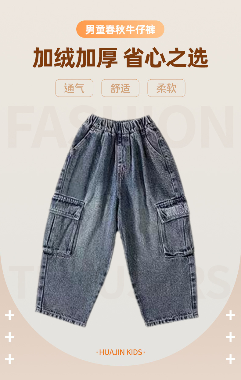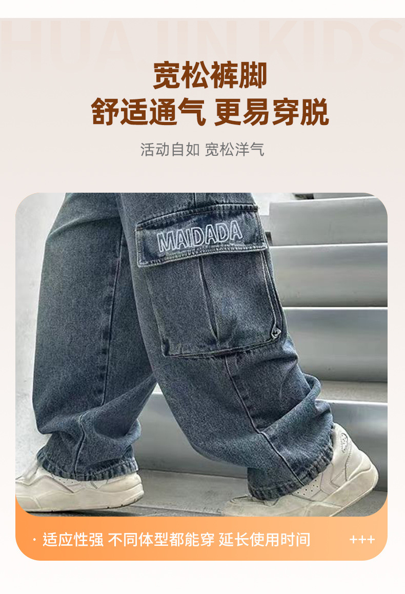 소년 바지 봄과 가을 새로운 어린이 봄 착용 도구 청바지 큰 어린이와 소년을위한 큰 포켓 느슨한 바지