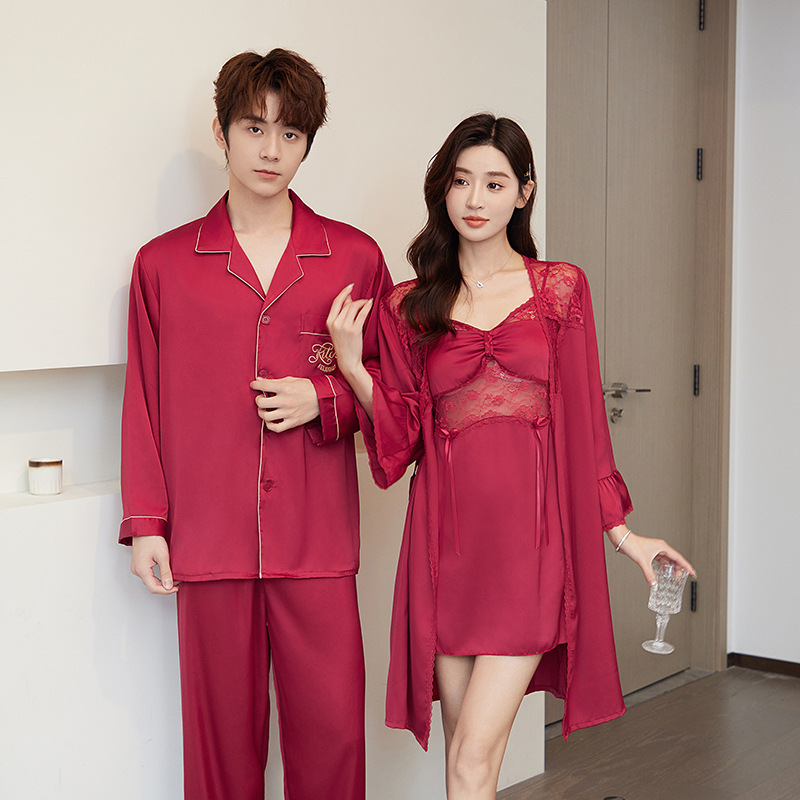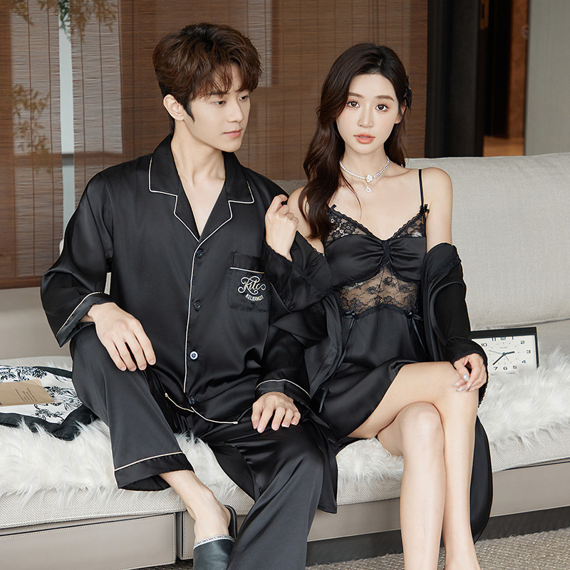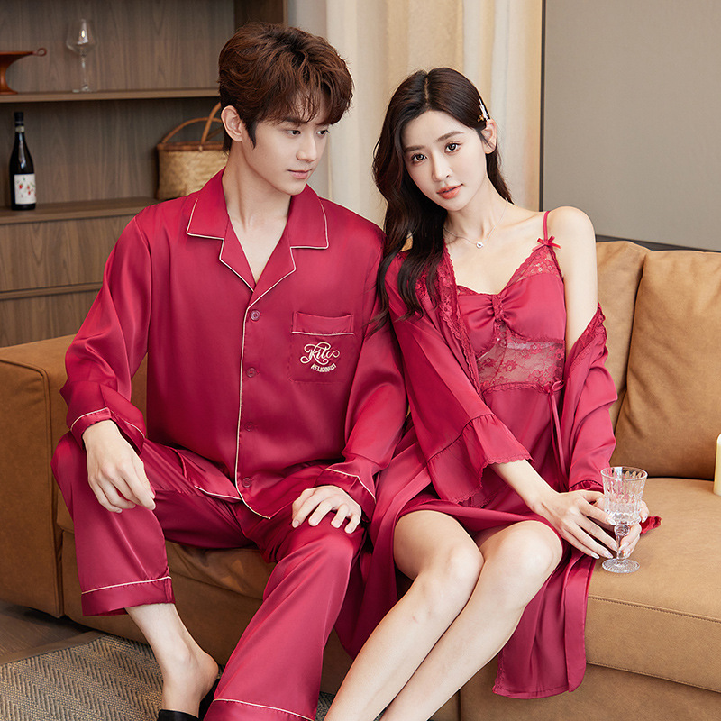 봄과 가을 잠옷 아이스 실크 여성용 긴팔 섹시한 레이스 슬링 가슴 패드 잠옷 여름 아침 가운 남자 홈 의류 세트