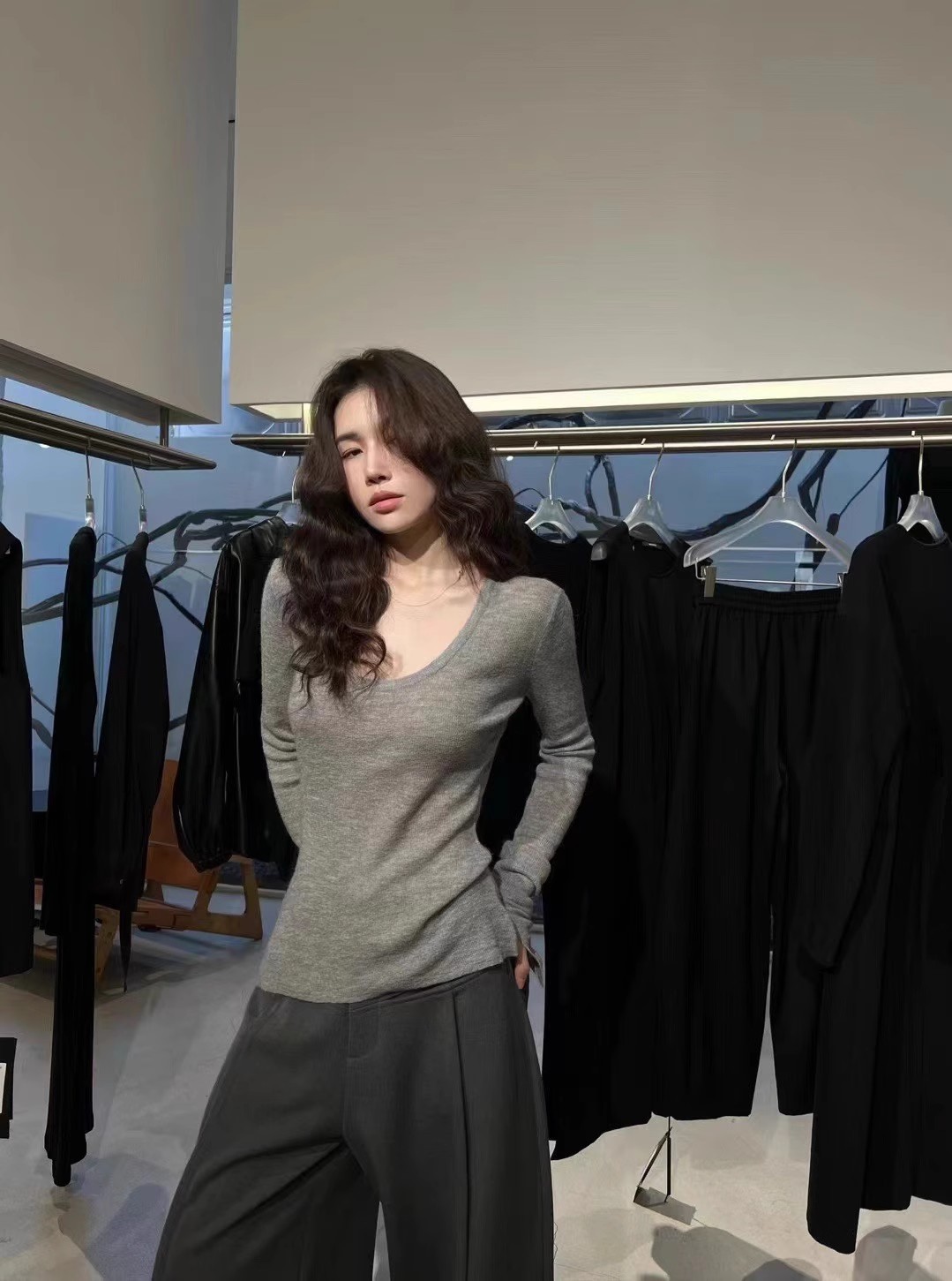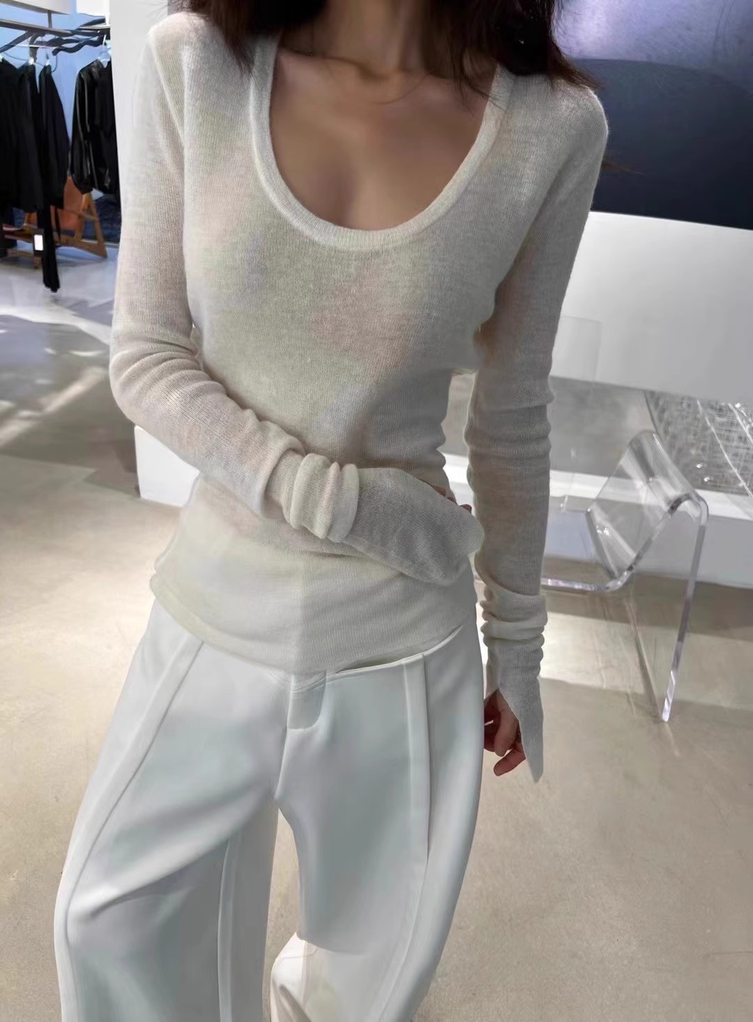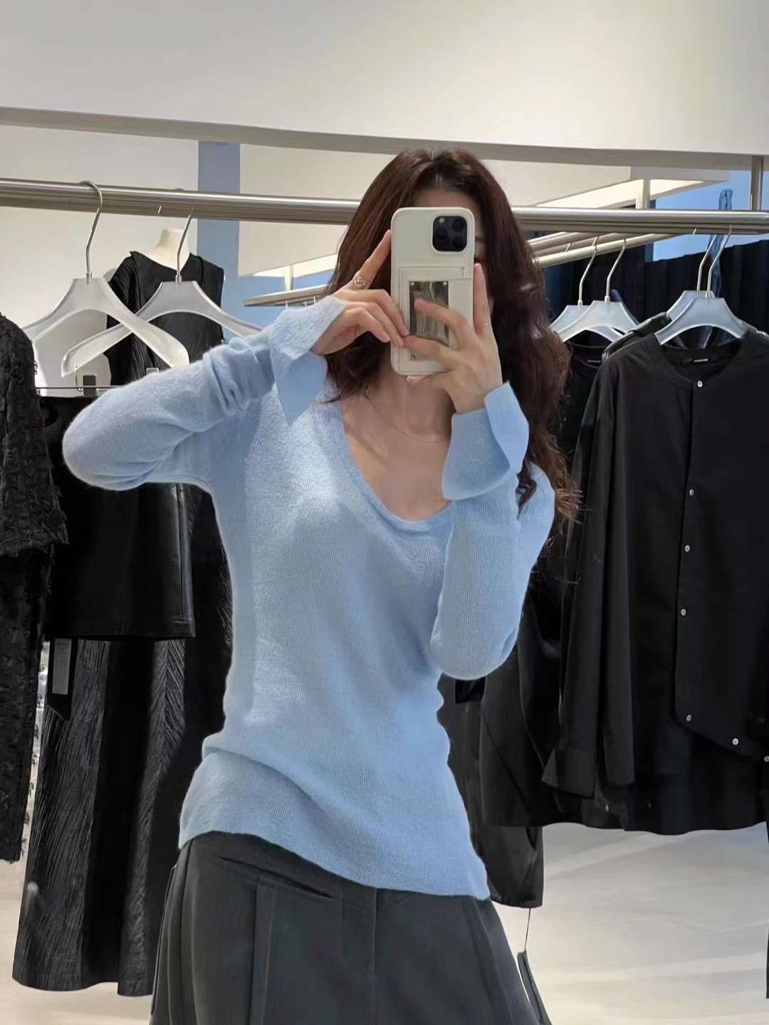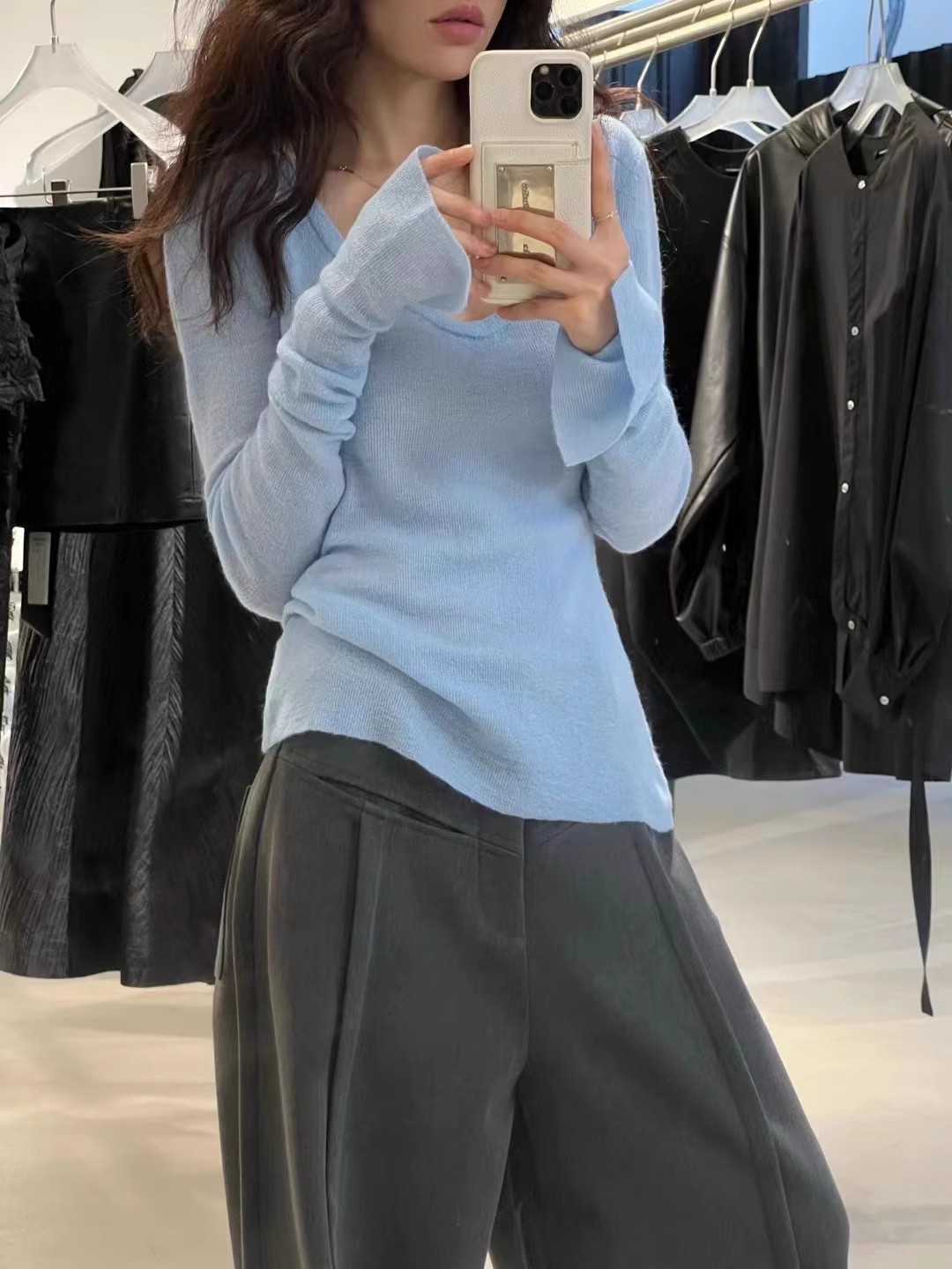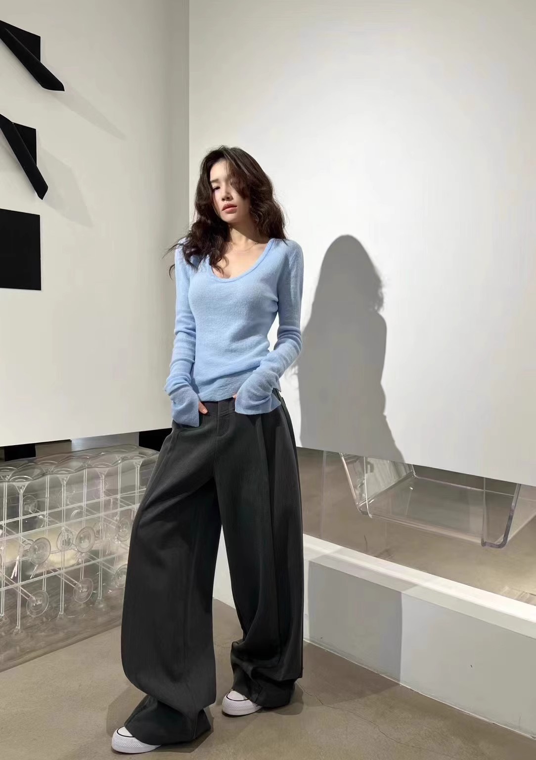 처녀 한국식 U-넥 블루 간단한 니트 스웨터 여성의 봄 꽉 허리 어깨 플레어 슬리브 내부 탑스토어 가기