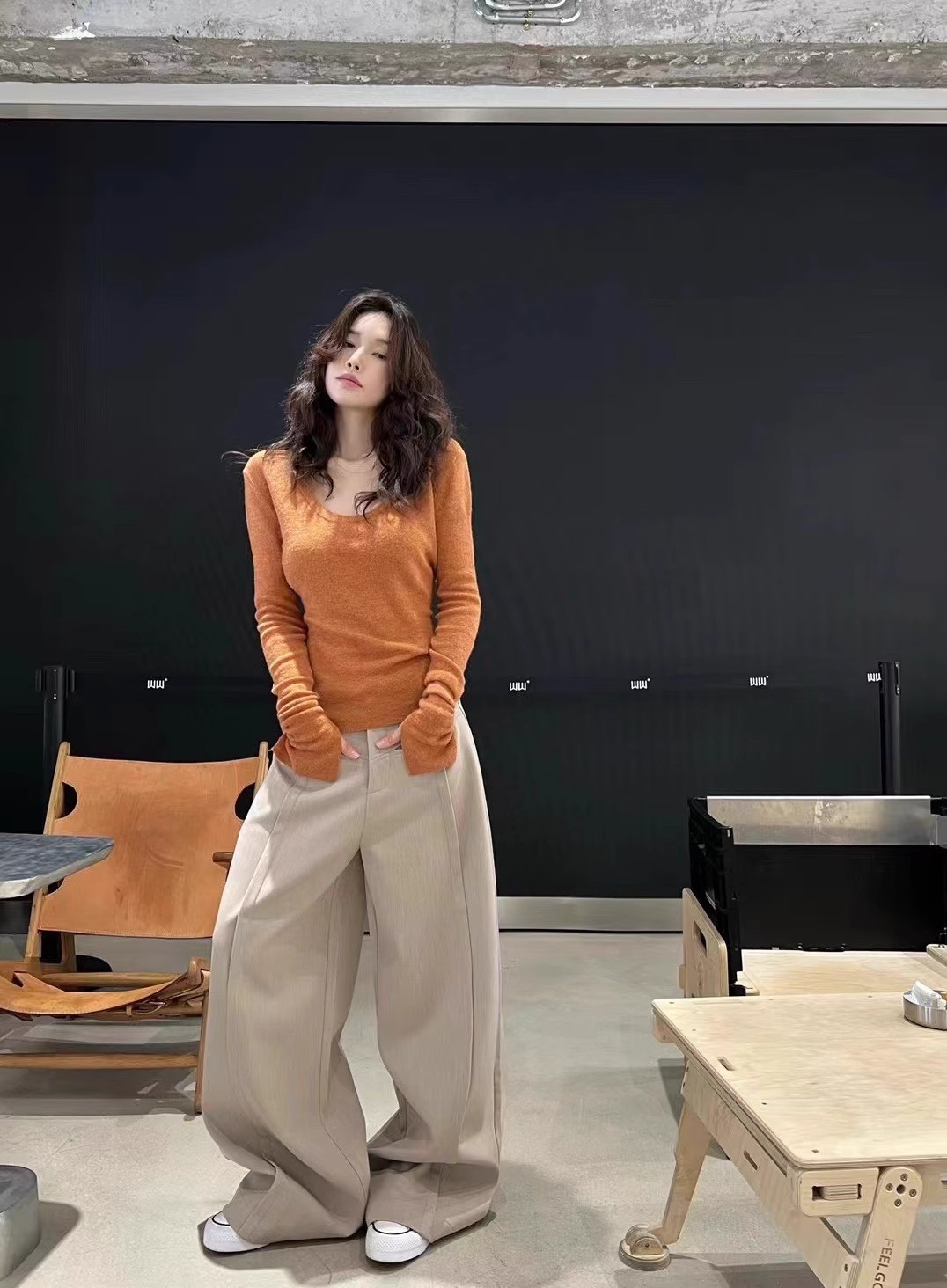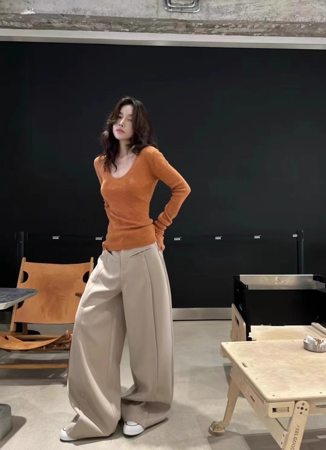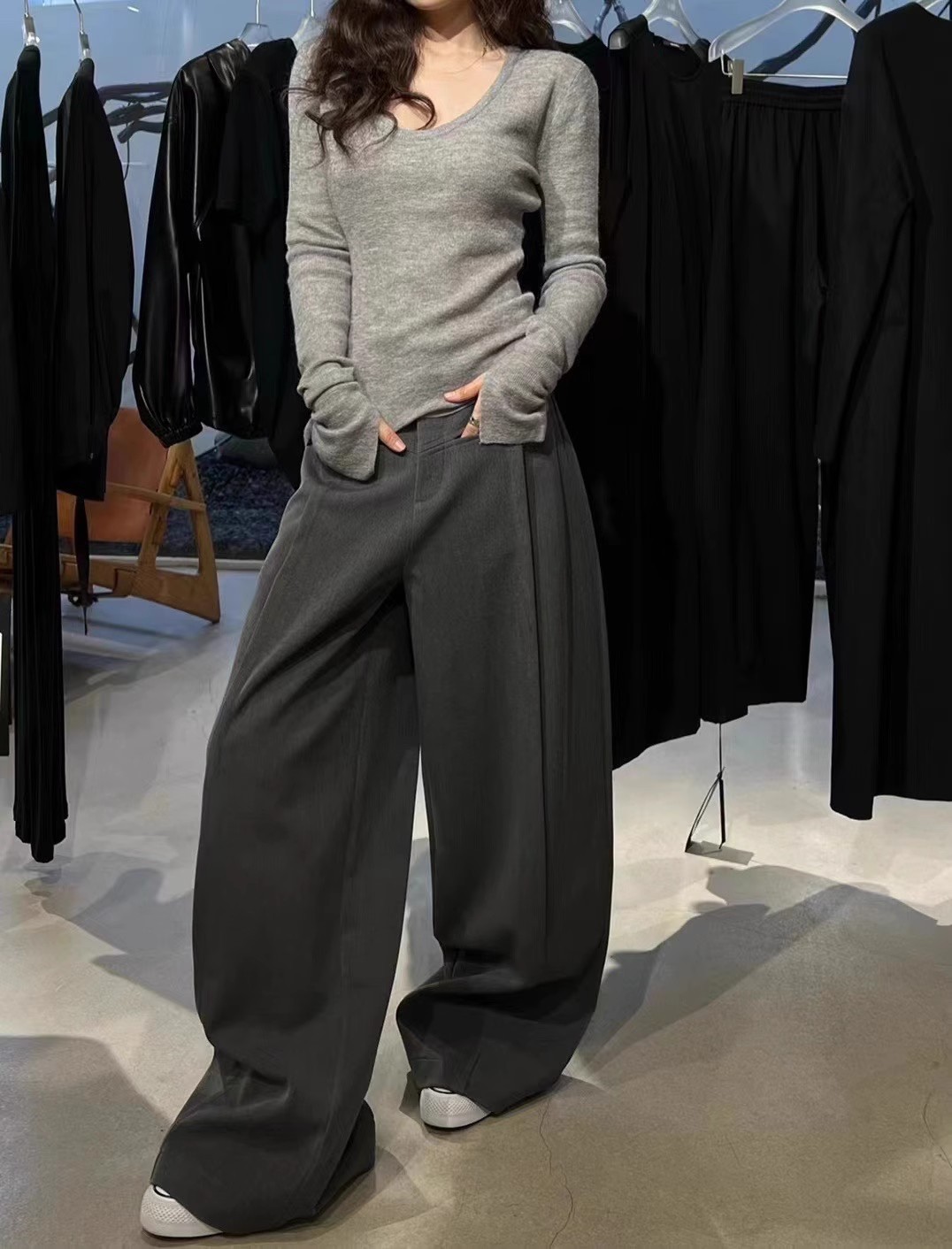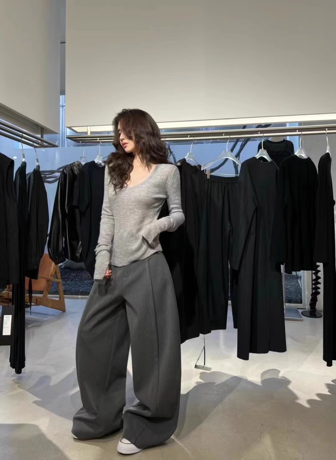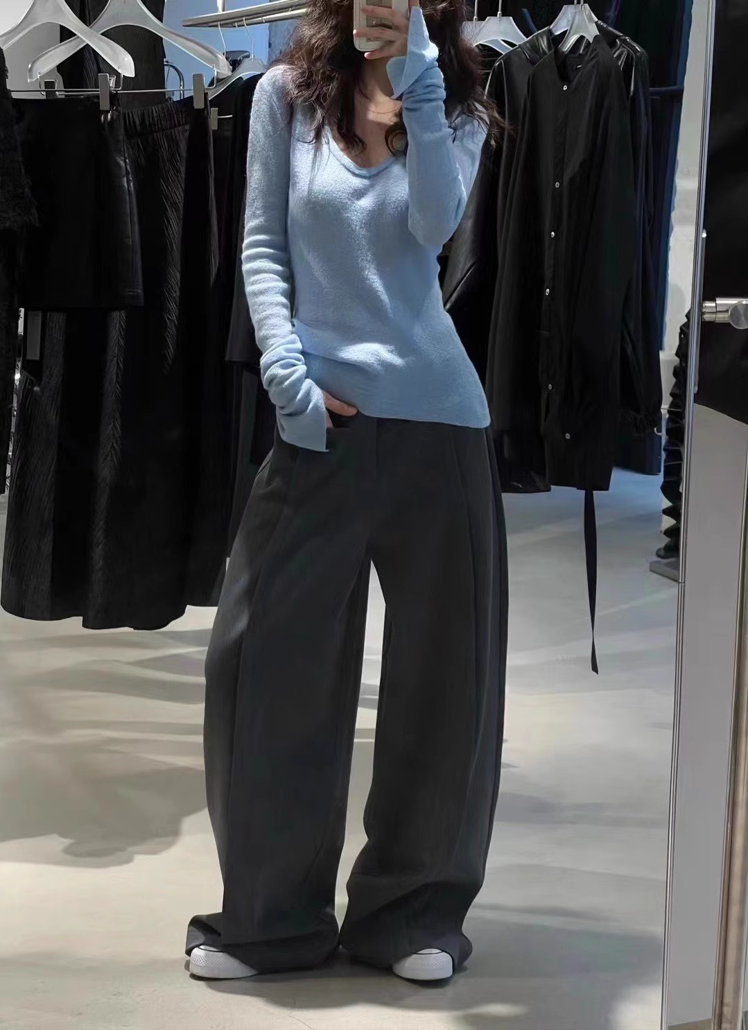 처녀 한국식 U-넥 블루 간단한 니트 스웨터 여성의 봄 꽉 허리 어깨 플레어 슬리브 내부 탑스토어 가기