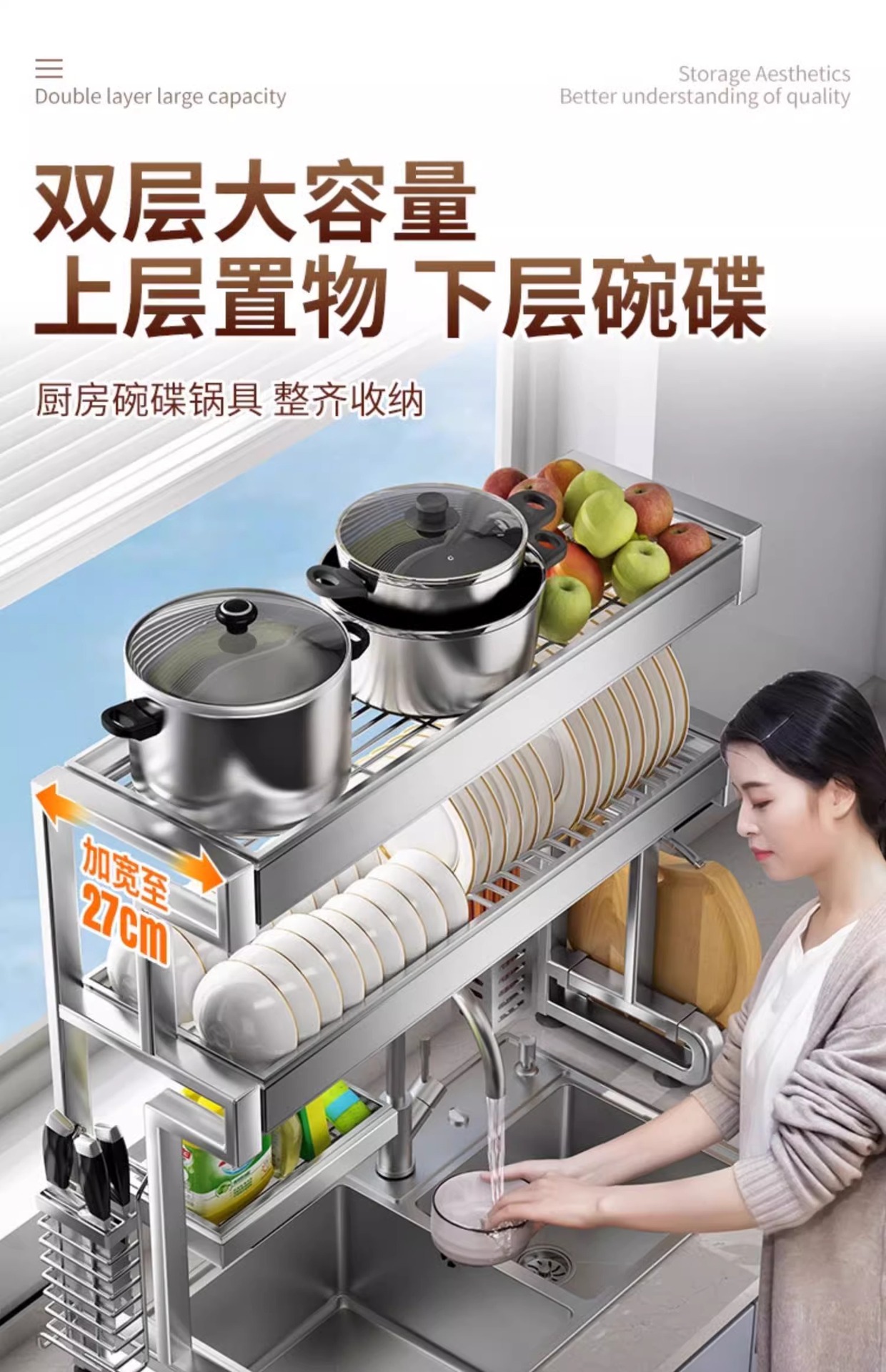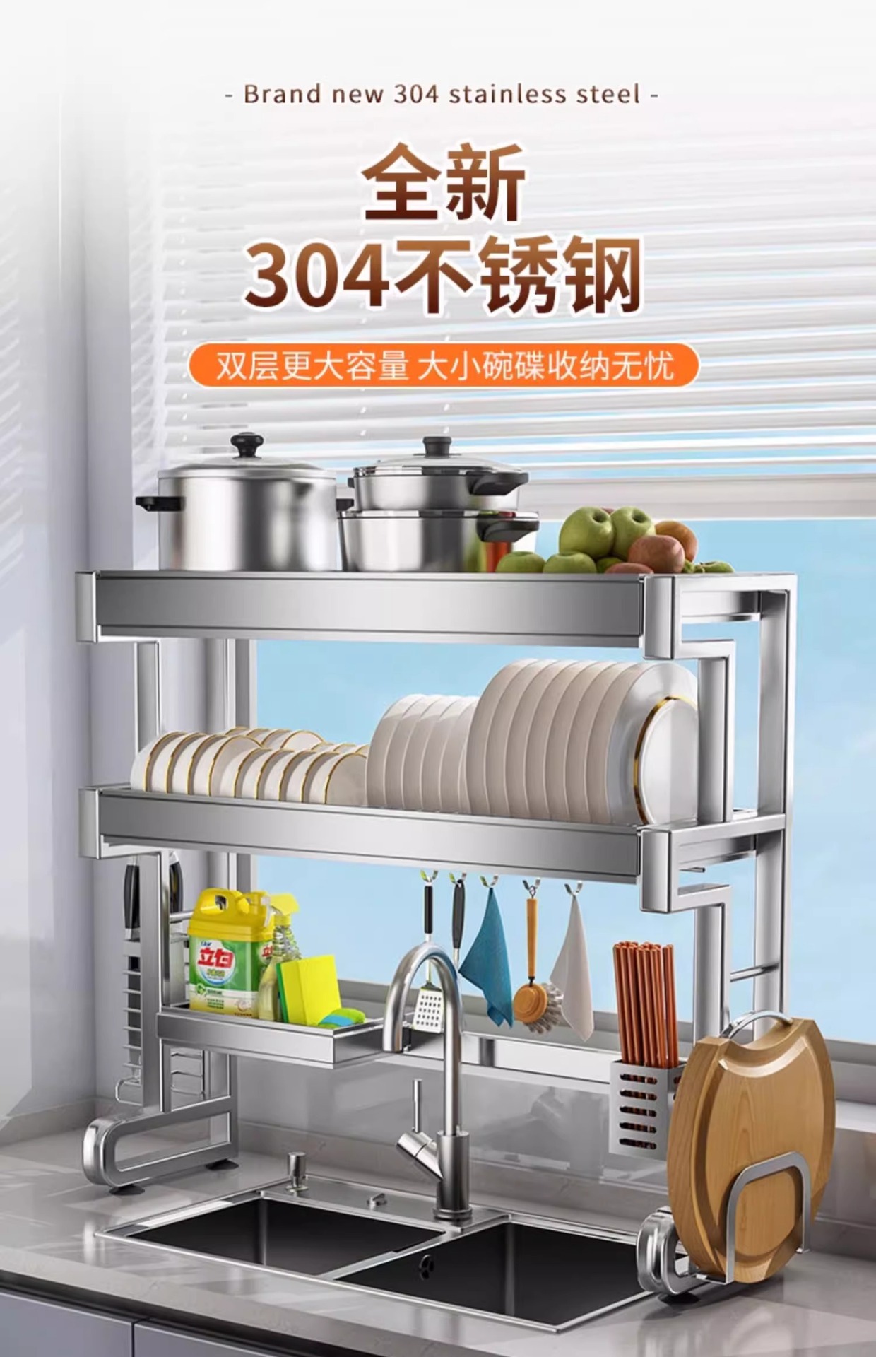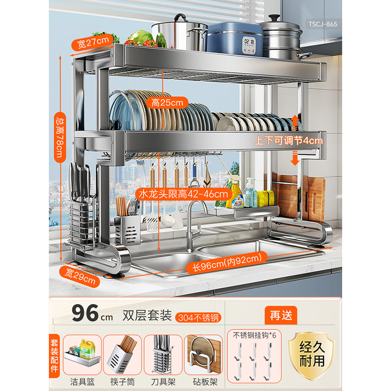 • [304 스테인레스 스틸] 더블 레이어 싱크 랙 95 길이 - 완비