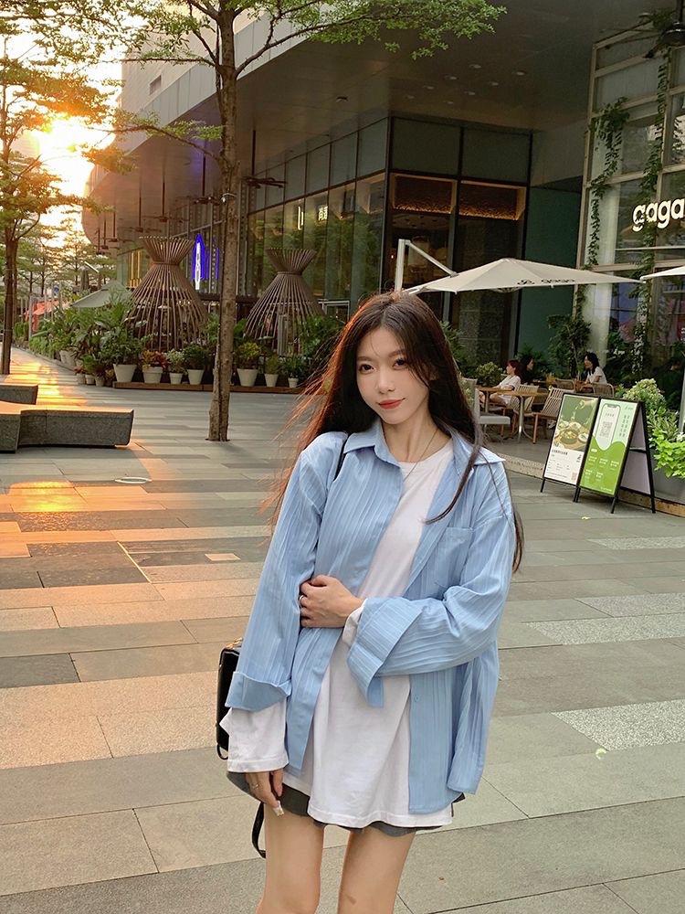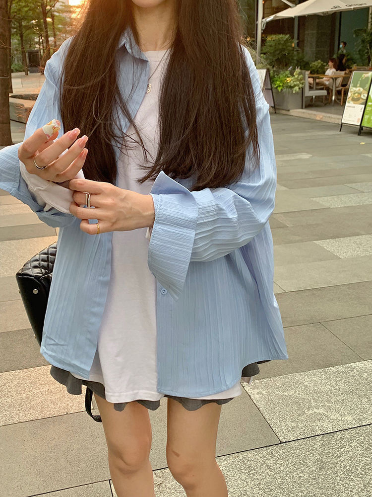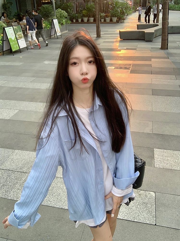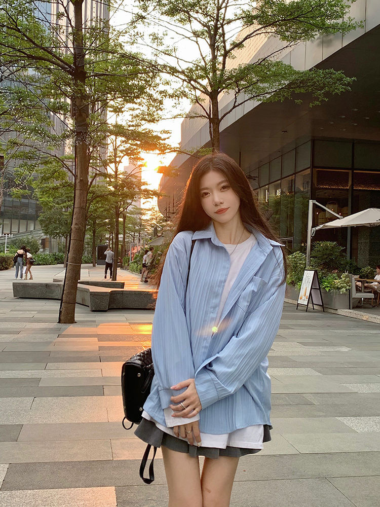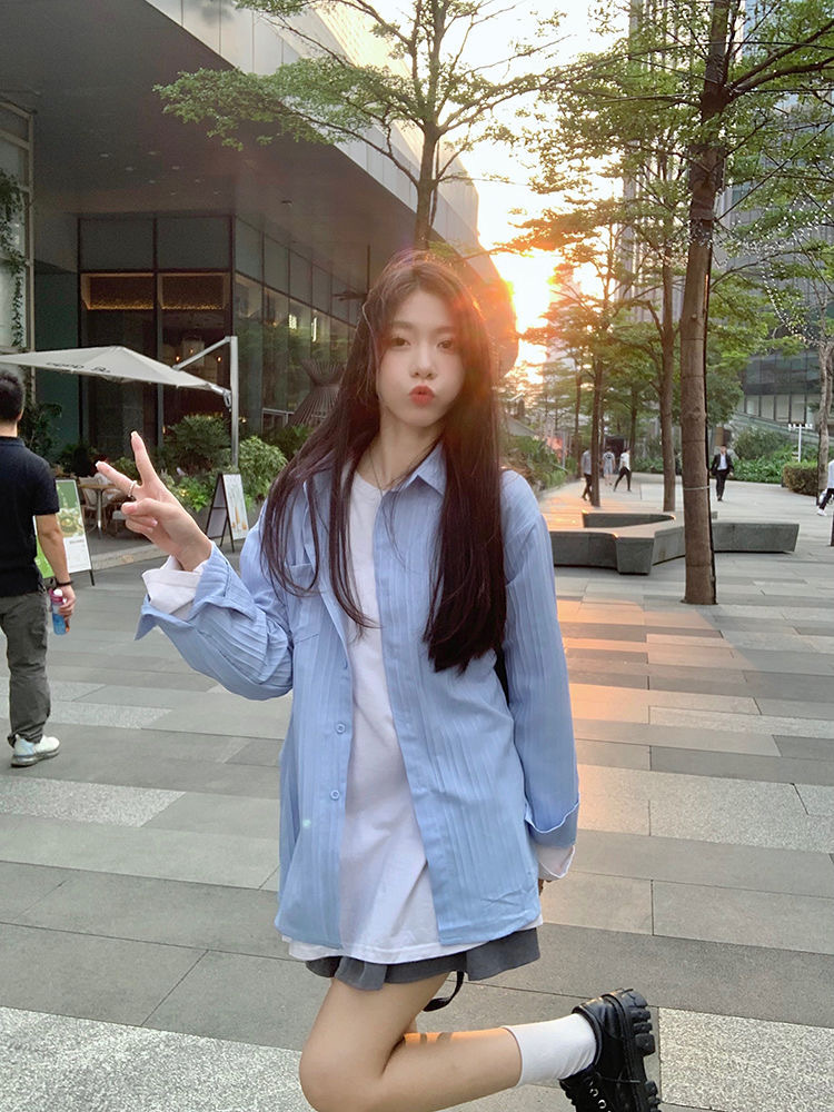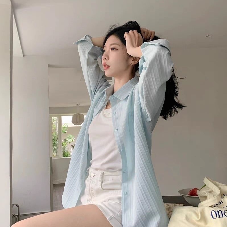 디자인 센스 블루 선 스크린 셔츠 재킷 봄과 여름 새로운 느슨한 폴로 칼라 롱 카디건 여성 탑스토어 가기