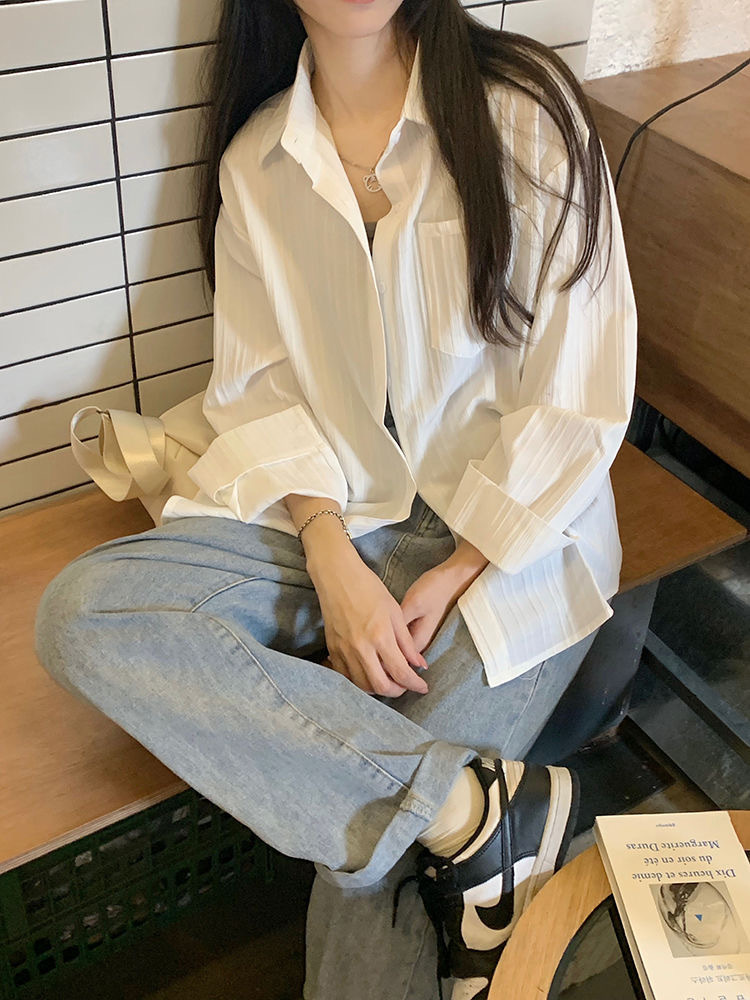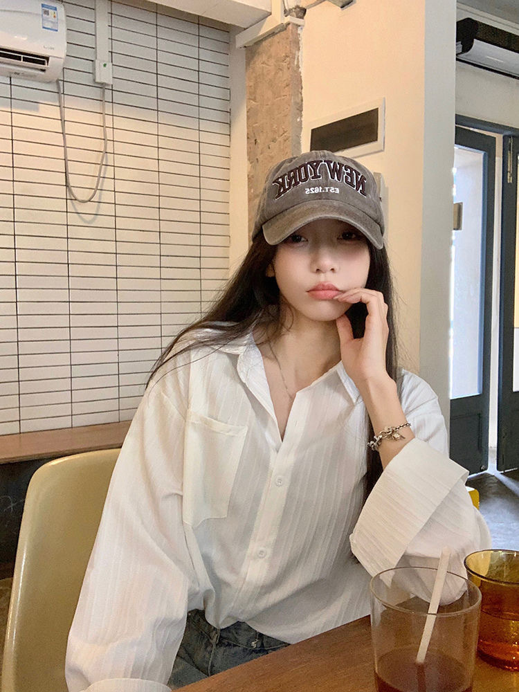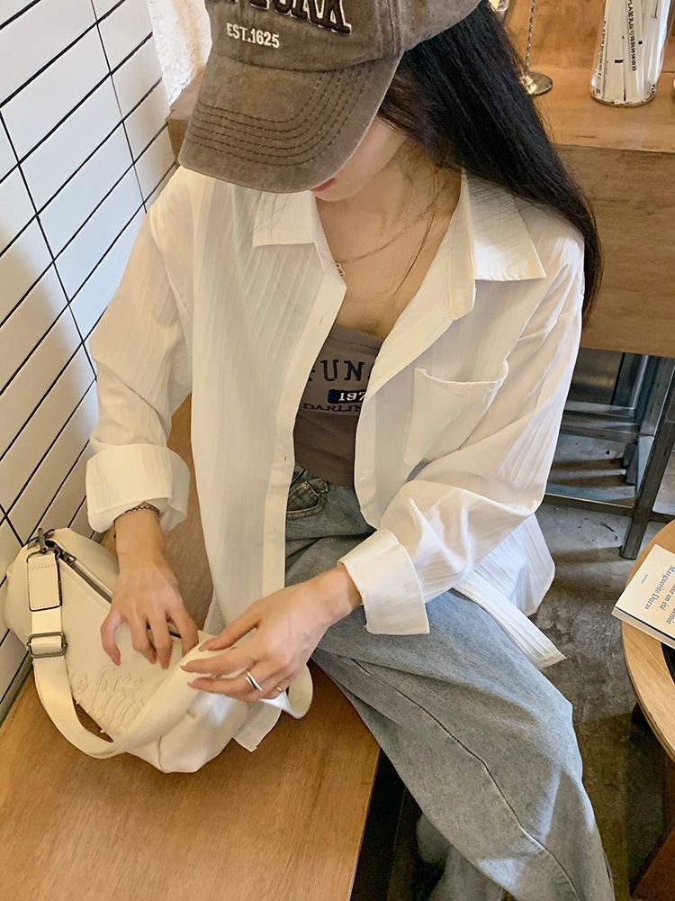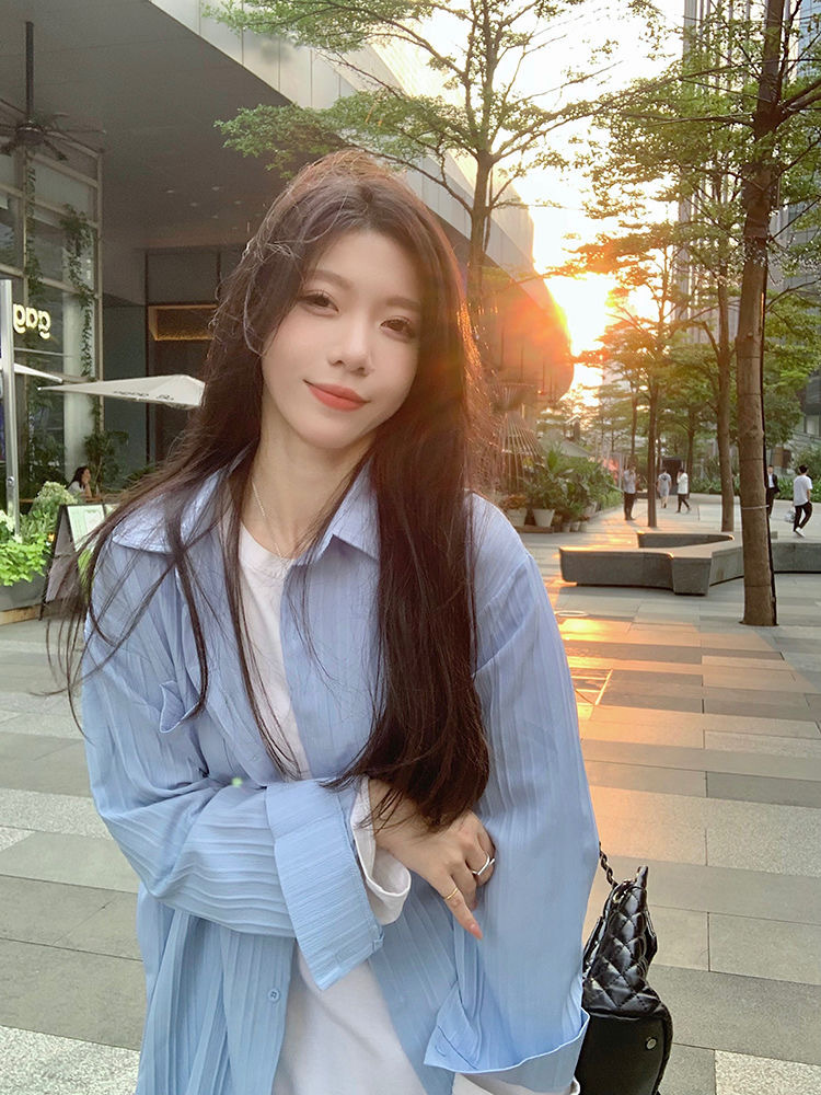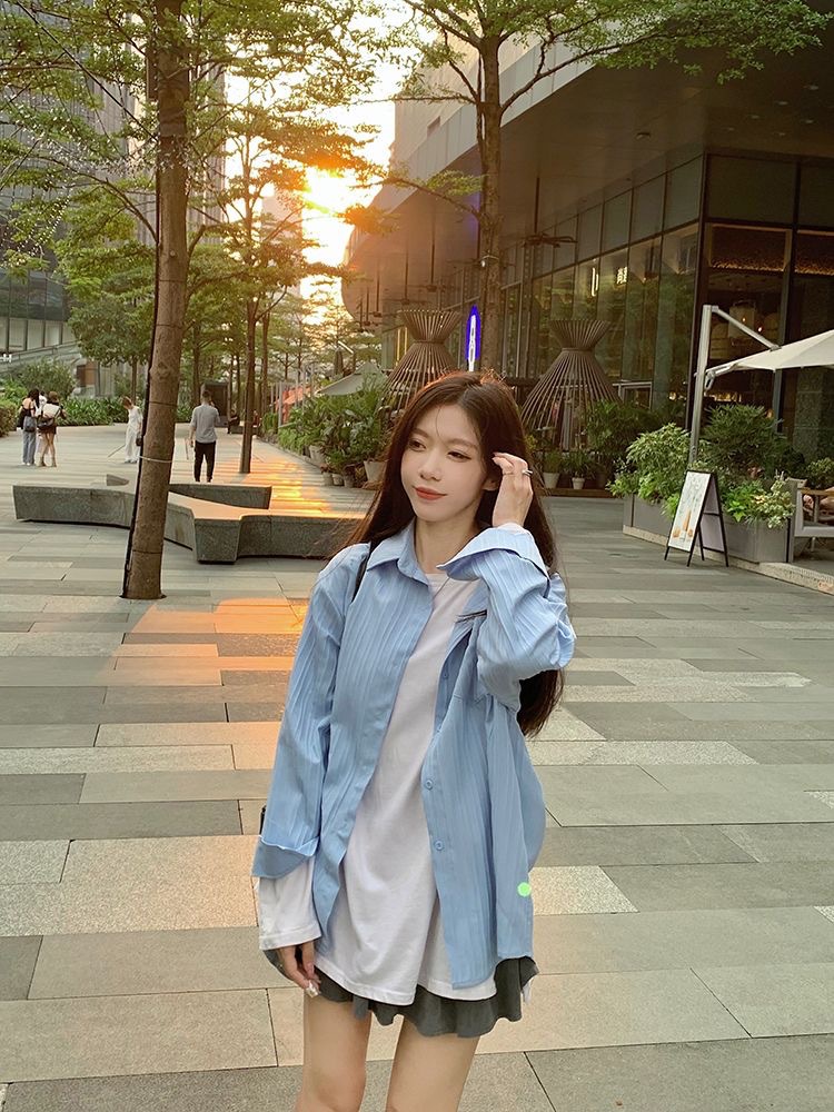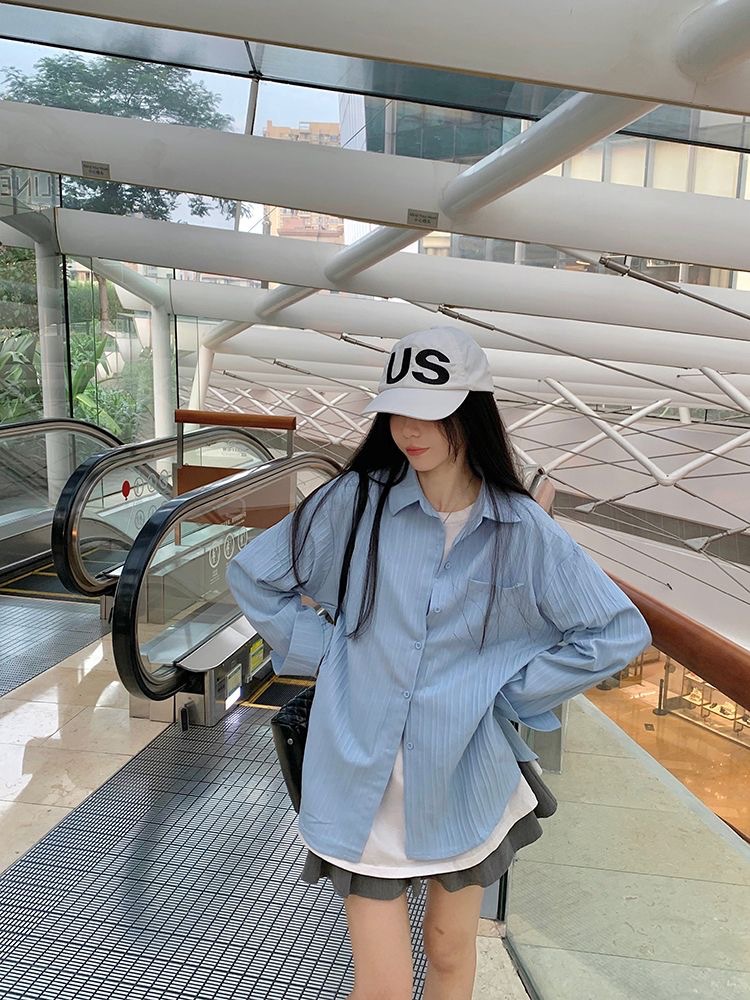 디자인 센스 블루 선 스크린 셔츠 재킷 봄과 여름 새로운 느슨한 폴로 칼라 롱 카디건 여성 탑스토어 가기