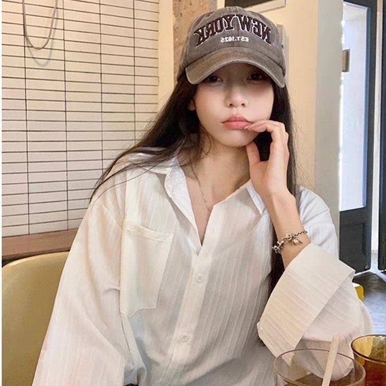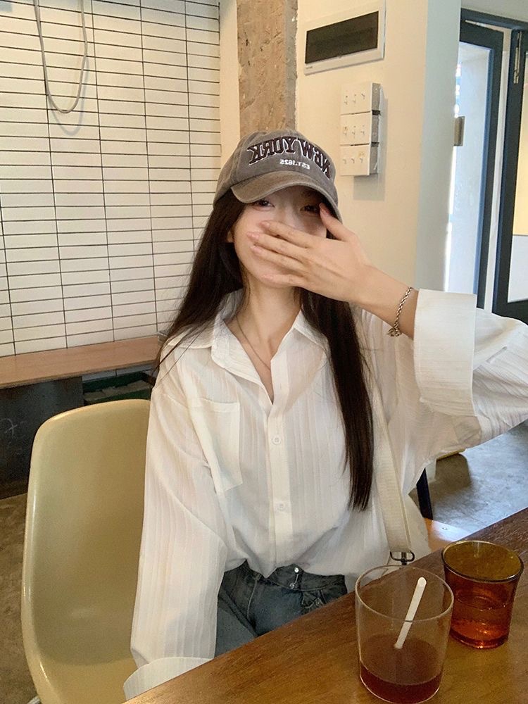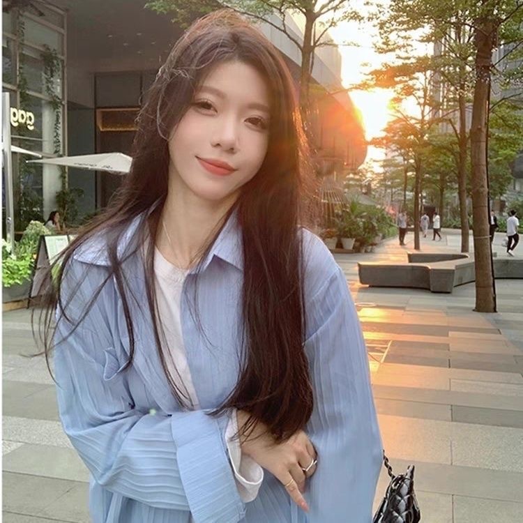 디자인 센스 블루 선 스크린 셔츠 재킷 봄과 여름 새로운 느슨한 폴로 칼라 롱 카디건 여성 탑