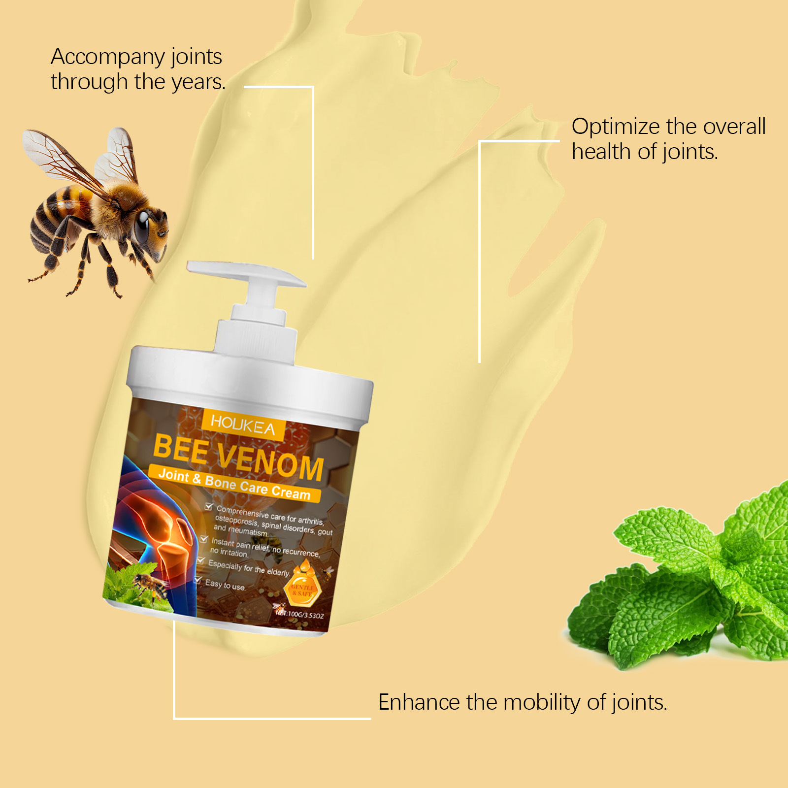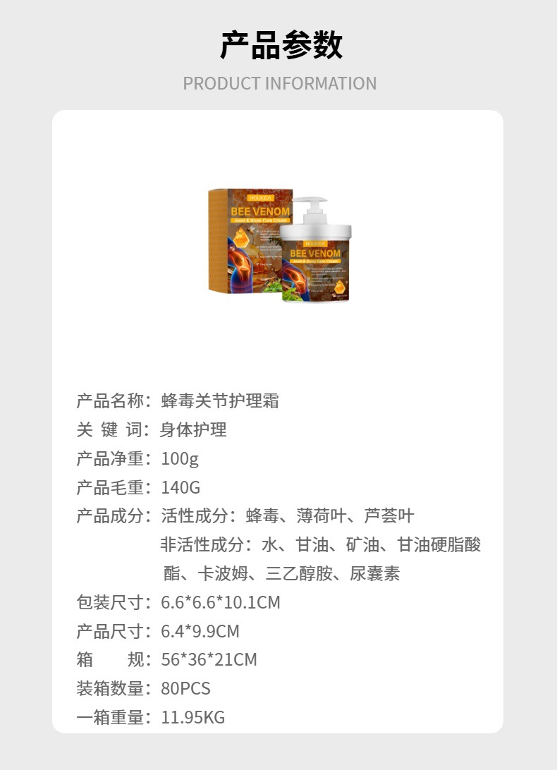 HOUKEA Bee Venom Joint Care 크림 부드러운 진정 손과 발 공동 매일 바디 케어 마사지 크림