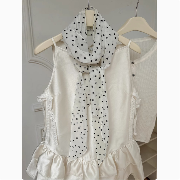 • 흰색 폴카 도트 실크 스카프 약 25*180CM