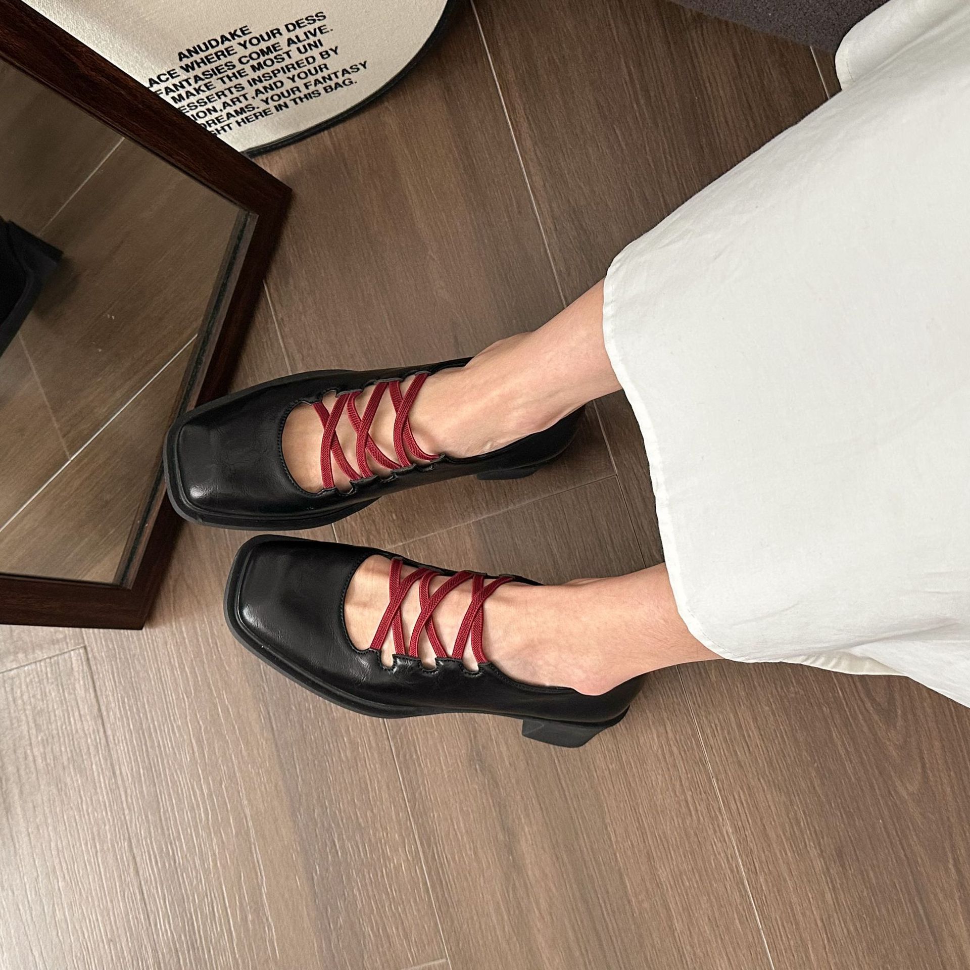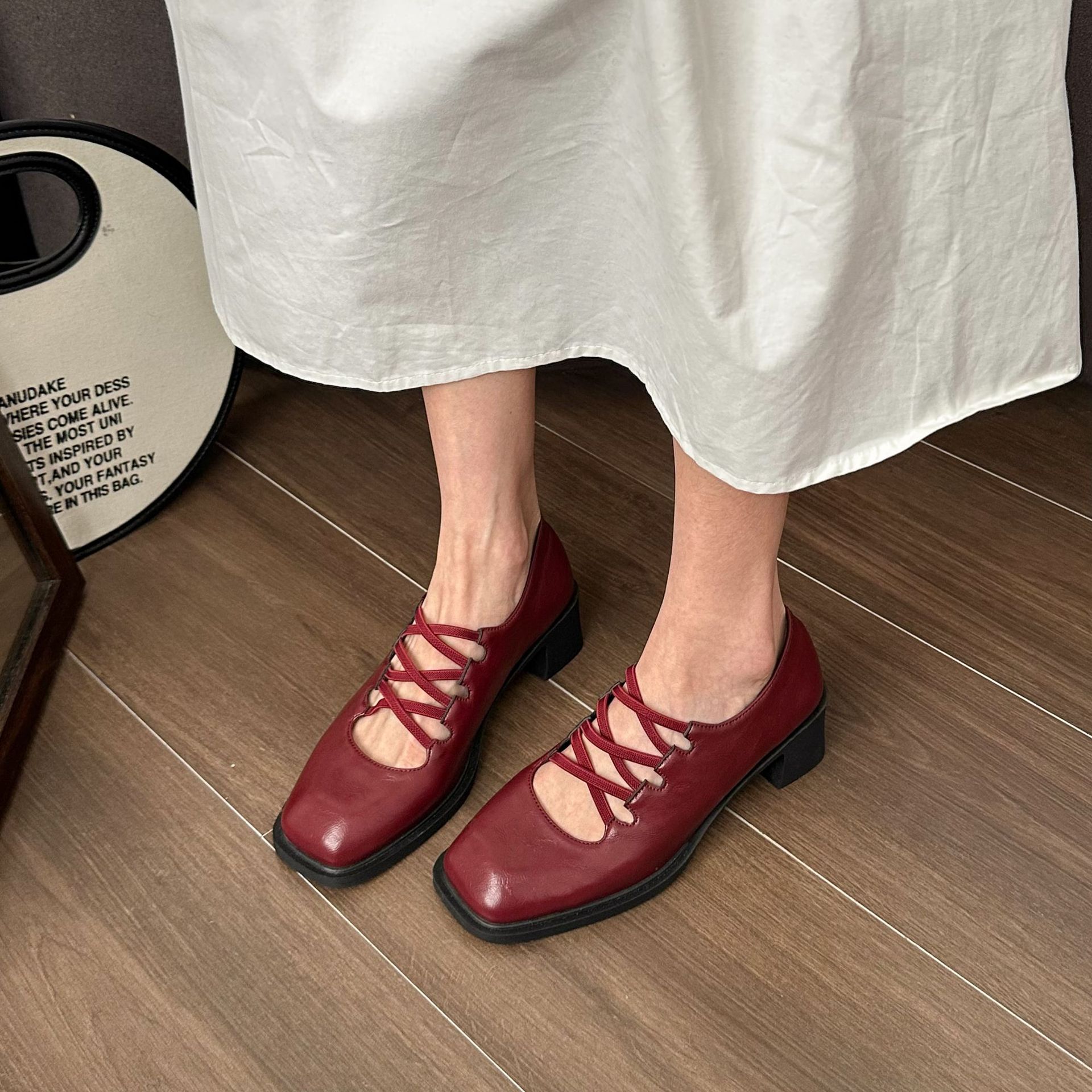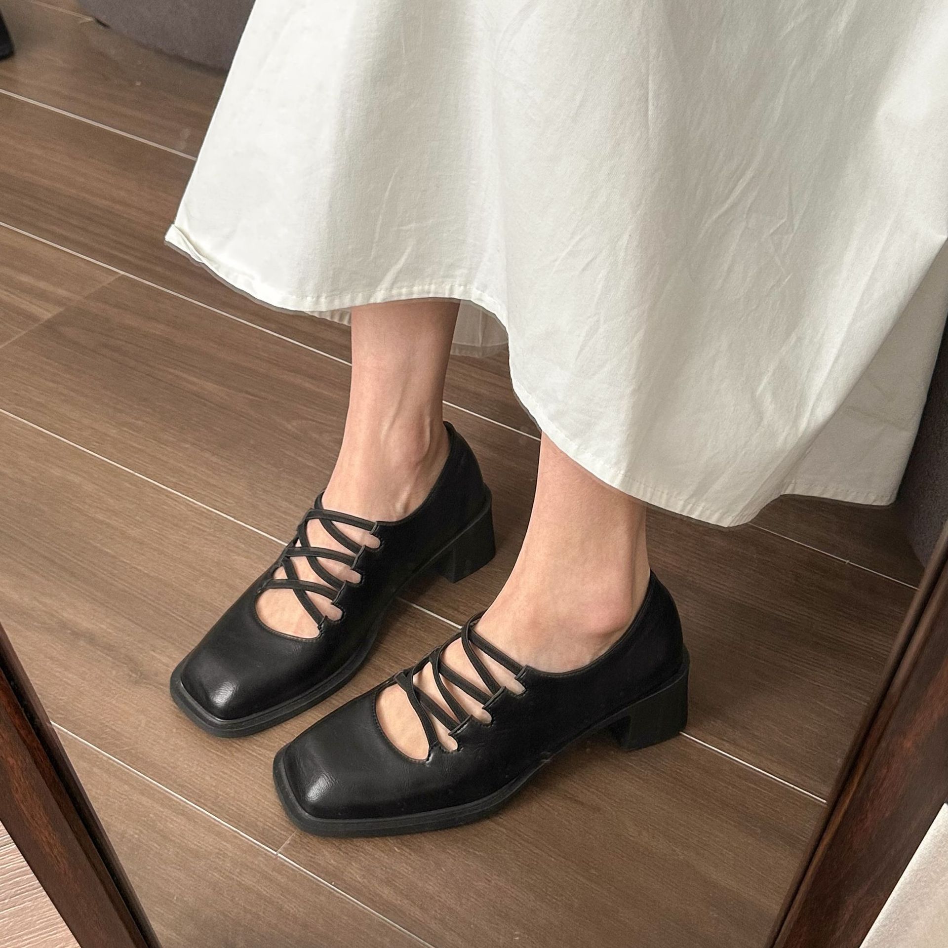 프랑스 늦은 저녁 스타일 싱글 레이어 신발 여성의 2025 봄과 가을 새로운 우아한 요정 크로스 벨트 스퀘어 발가락 얕은 입 메리 제인 신발스토어 가기
