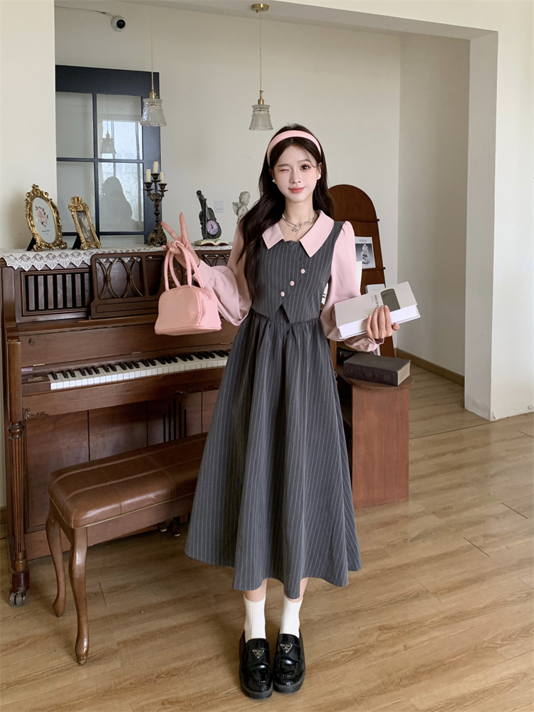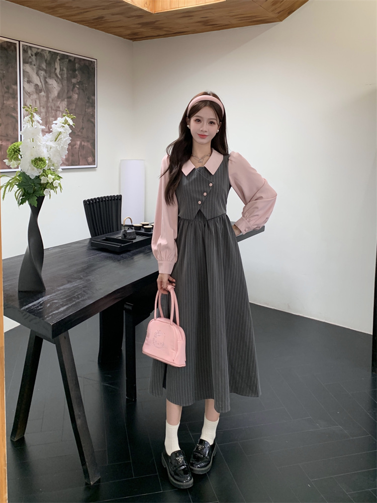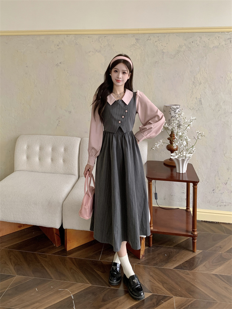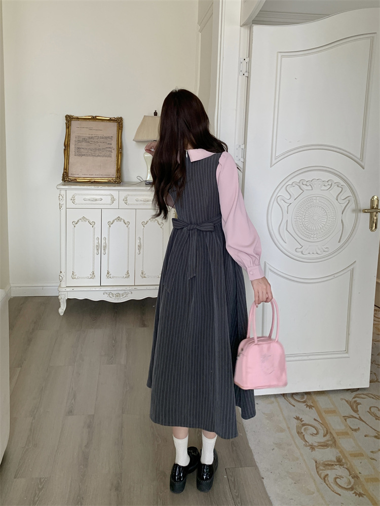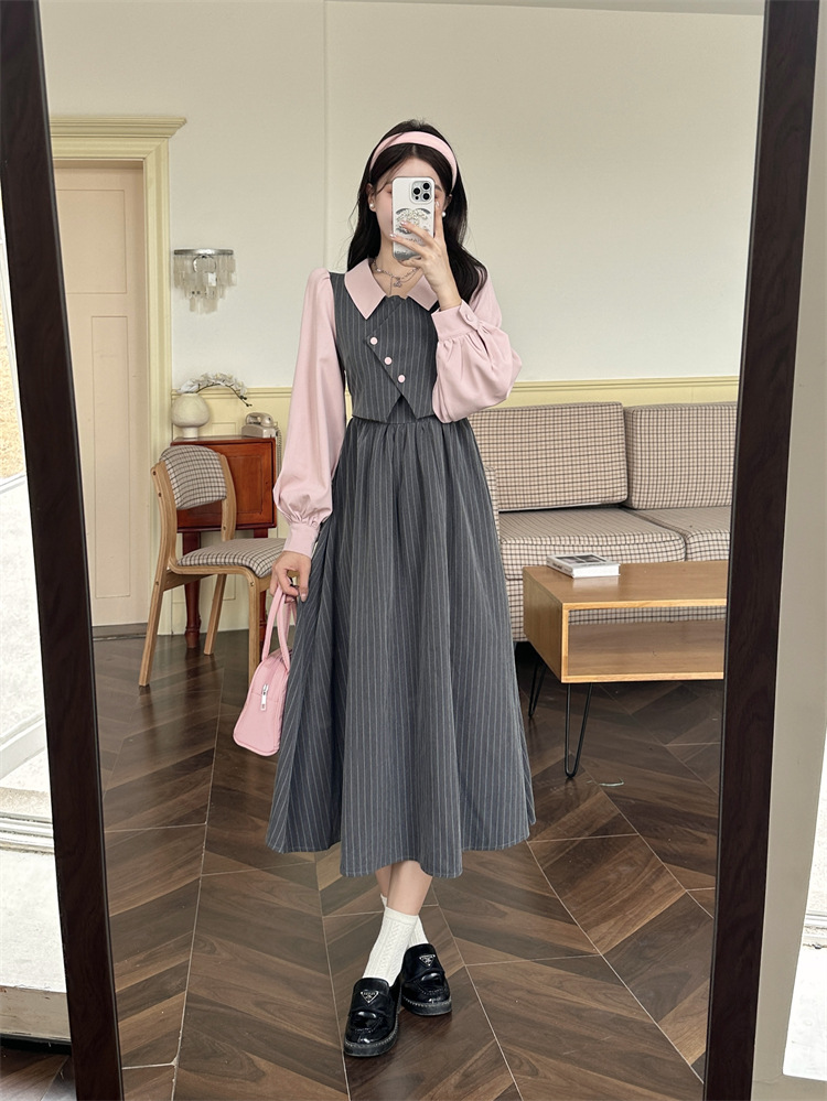 플러스 사이즈 대학 스타일 바느질 UGC 인터뷰 통근 긴 소매 원피스 가짜 투피스 높은 허리 슬림 차 브레이크 원피스스토어 가기