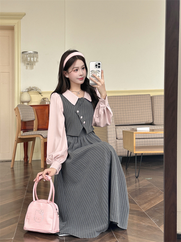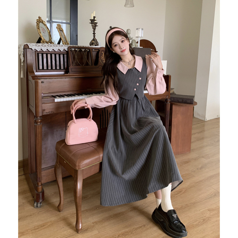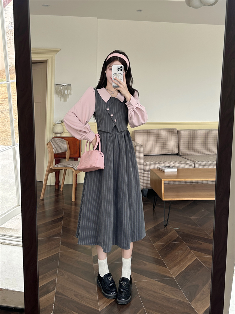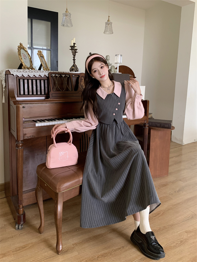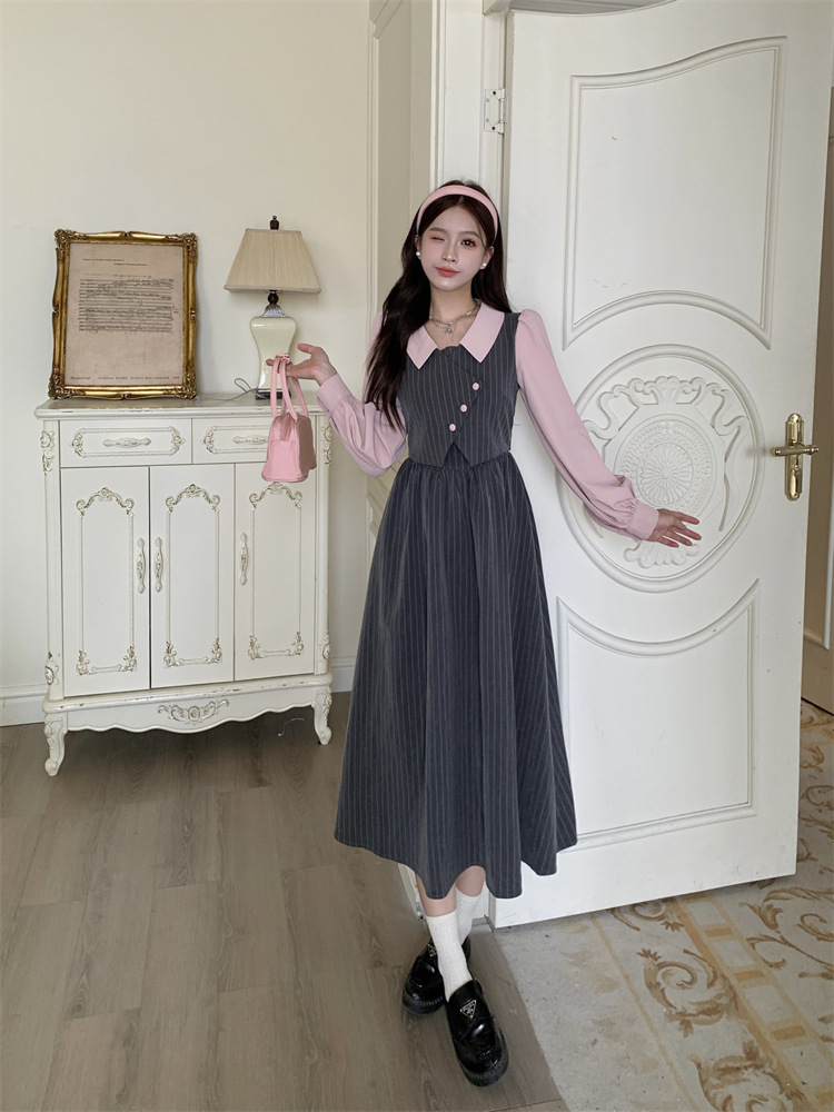 플러스 사이즈 대학 스타일 바느질 UGC 인터뷰 통근 긴 소매 원피스 가짜 투피스 높은 허리 슬림 차 브레이크 원피스스토어 가기