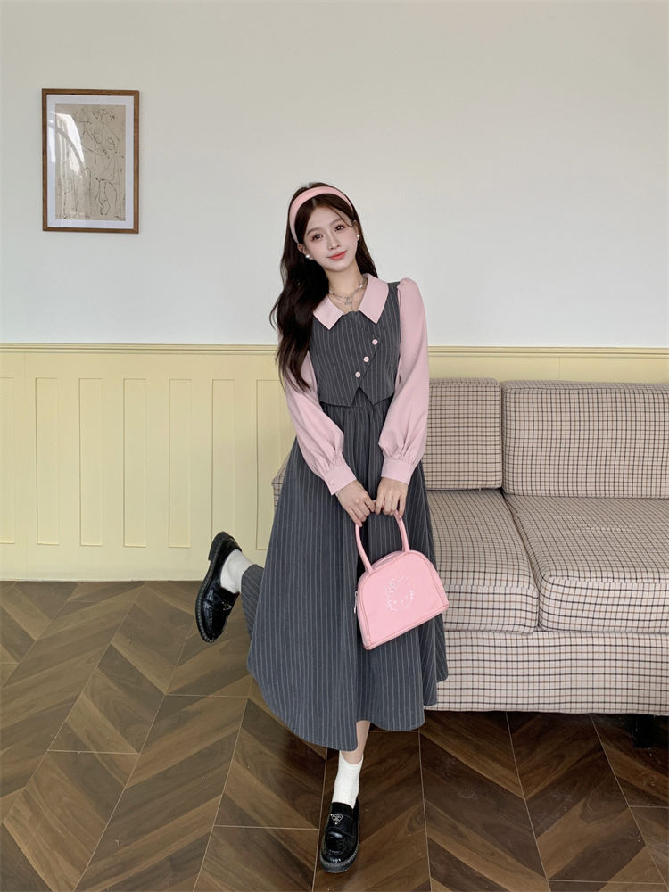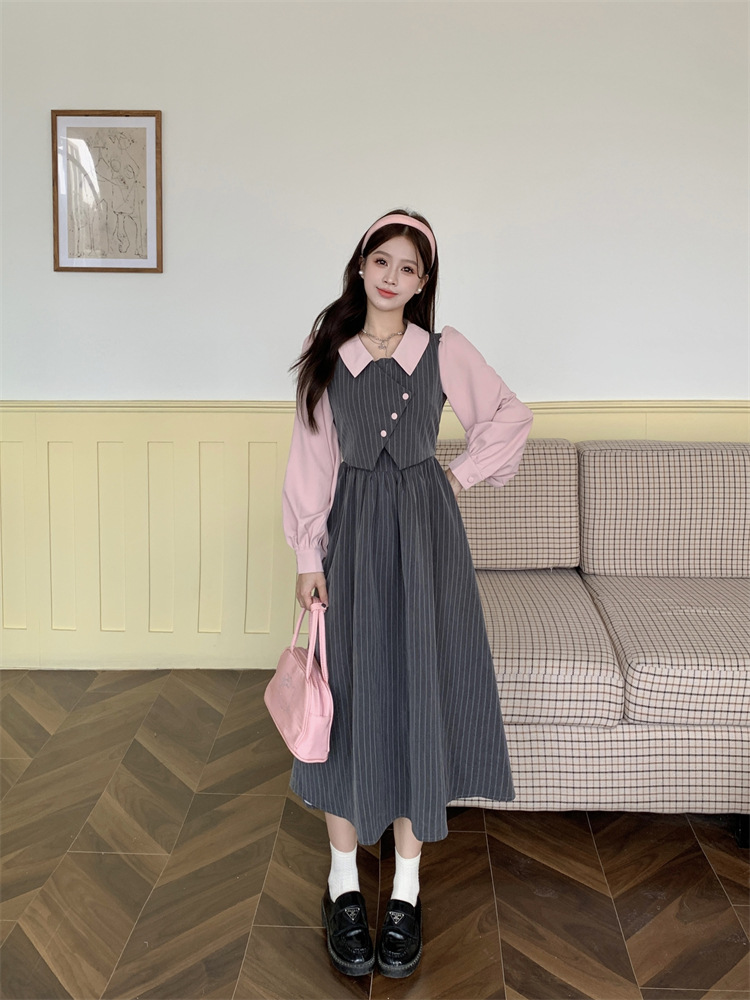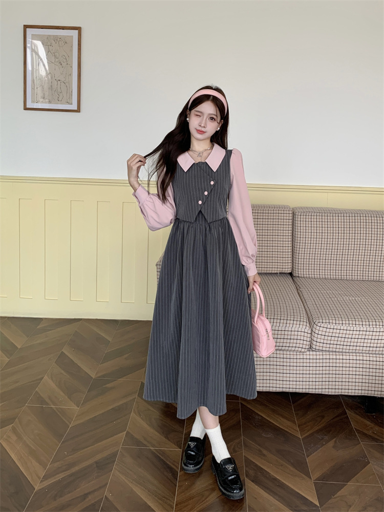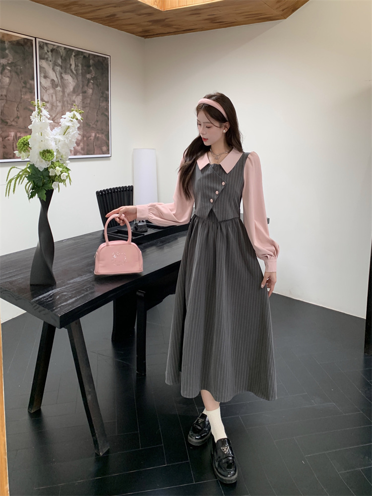 플러스 사이즈 대학 스타일 바느질 UGC 인터뷰 통근 긴 소매 원피스 가짜 투피스 높은 허리 슬림 차 브레이크 원피스
