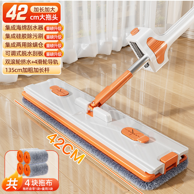 • 생생한 오렌지색 [42CM 이중층 두꺼운 걸레 헤드 + 두꺼운 천 4개] 다기능 걸레 및 긁는 도구 + 두꺼운 강화 막대✦