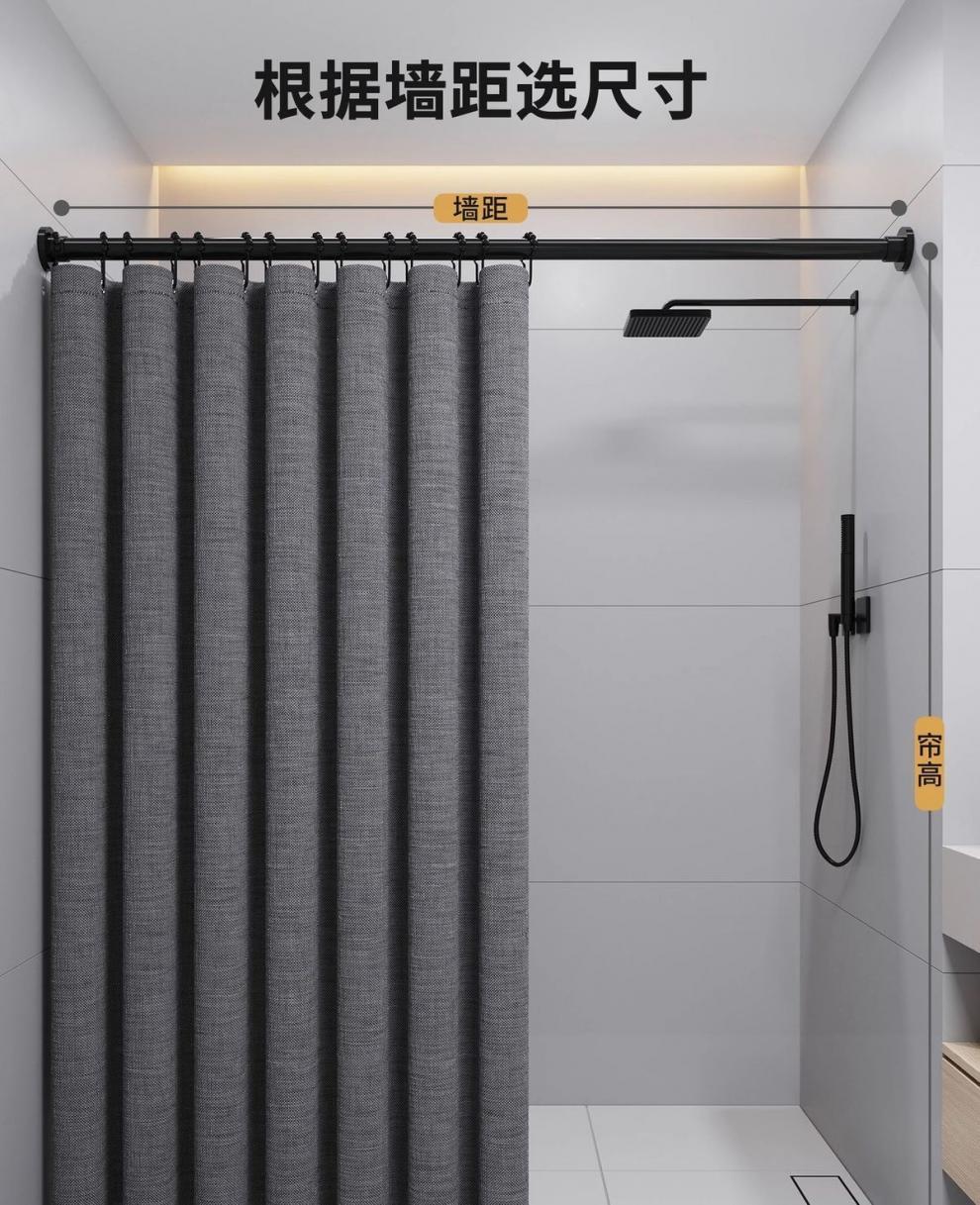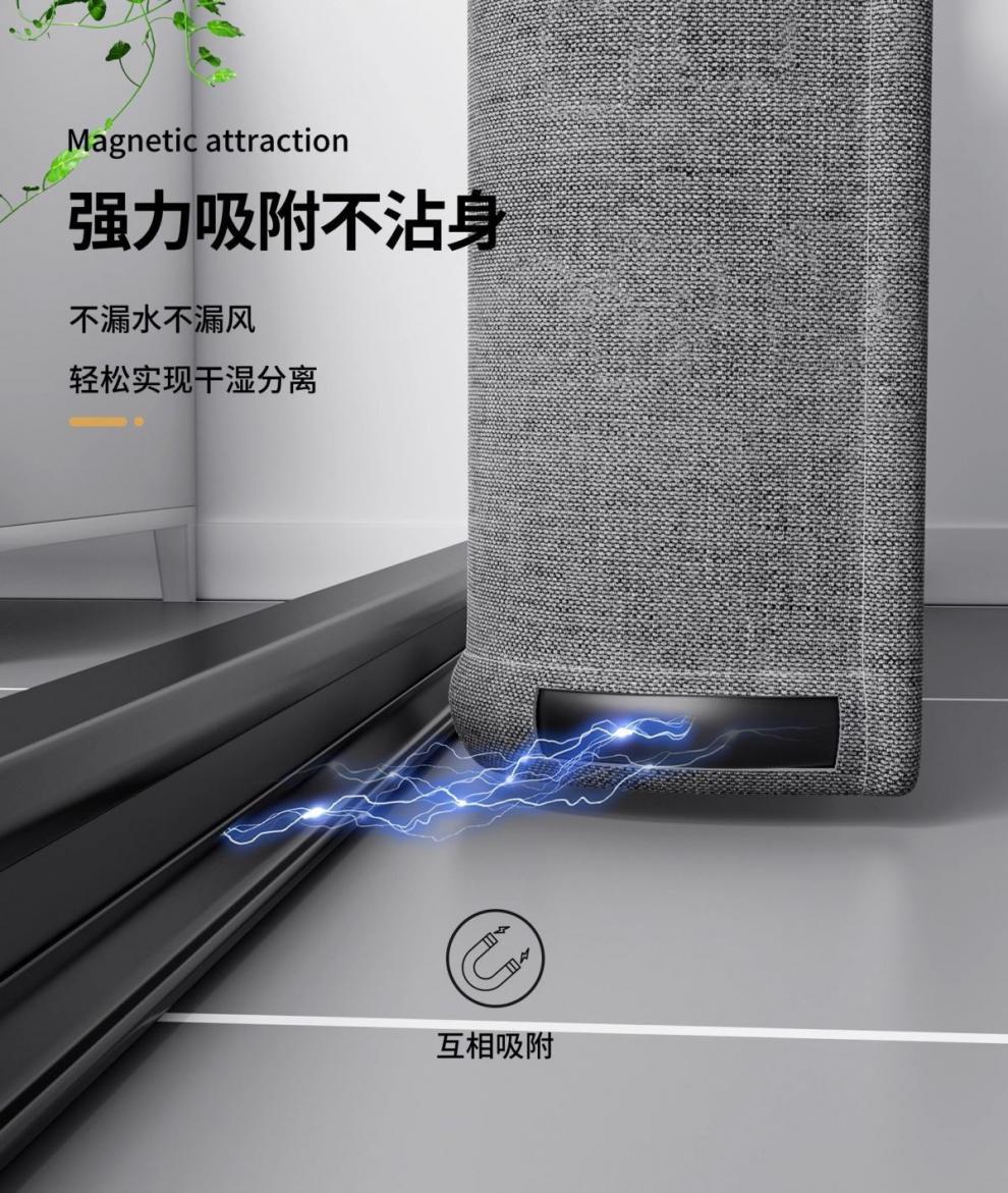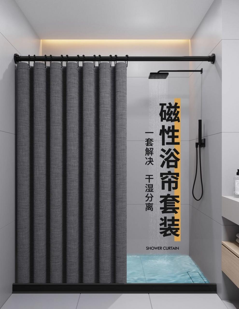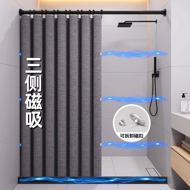 • [3면 자석흡입] 회색 샤워커튼 + 검정색 막대 + 검정색 물받이 스트립