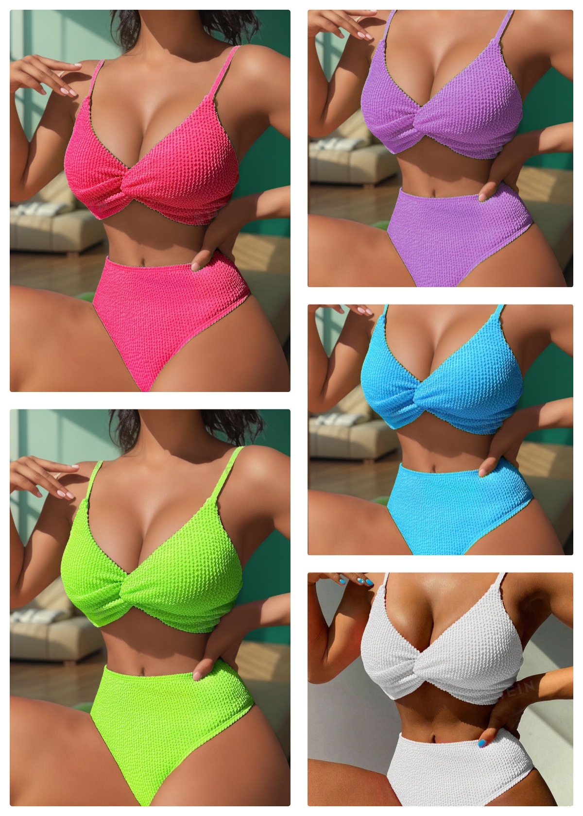 2025 새로운 유럽과 미국의 대외 무역 단색 높은 허리 분할 수영복 여성 패션 섹시한 백리스 주름진 푸시 업 비키니