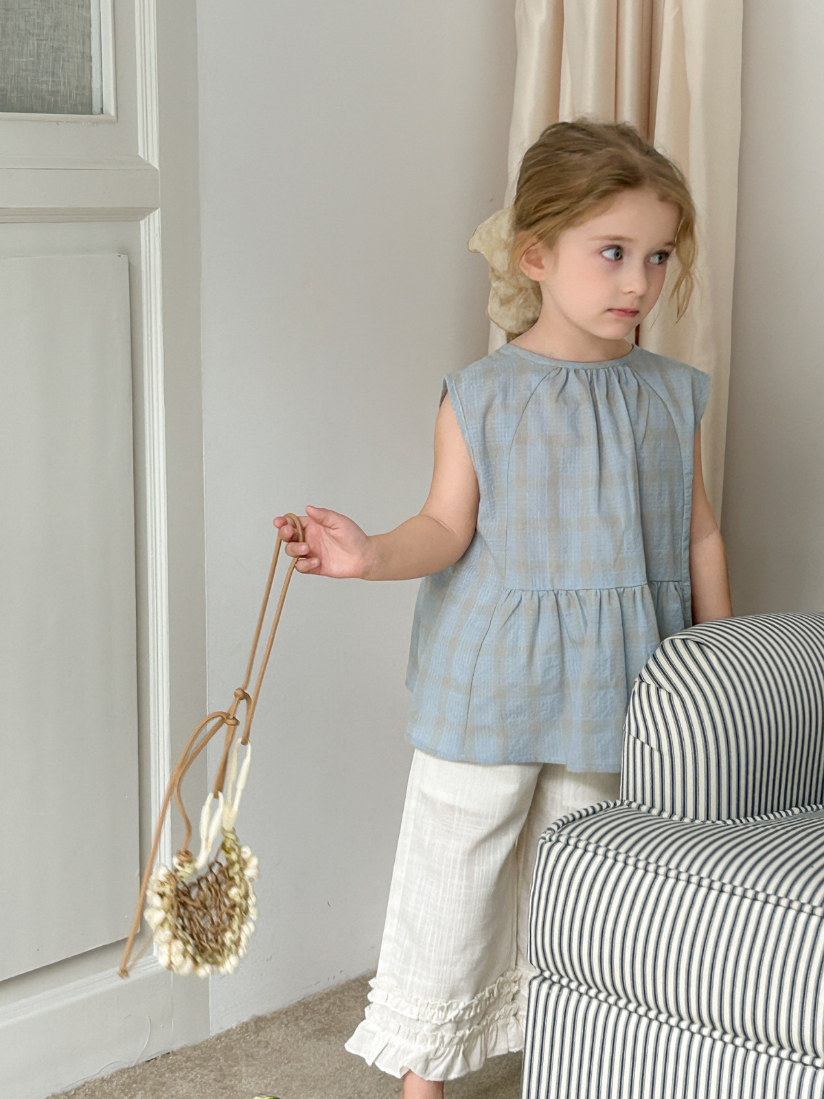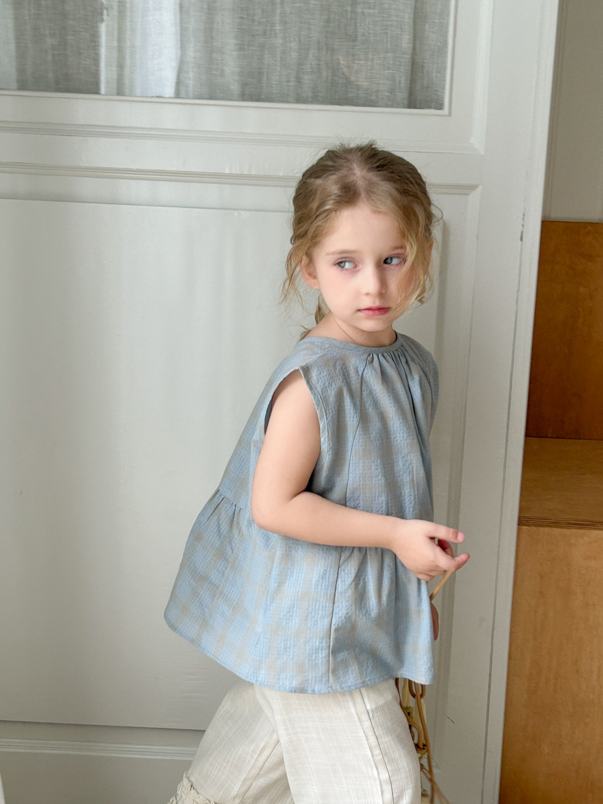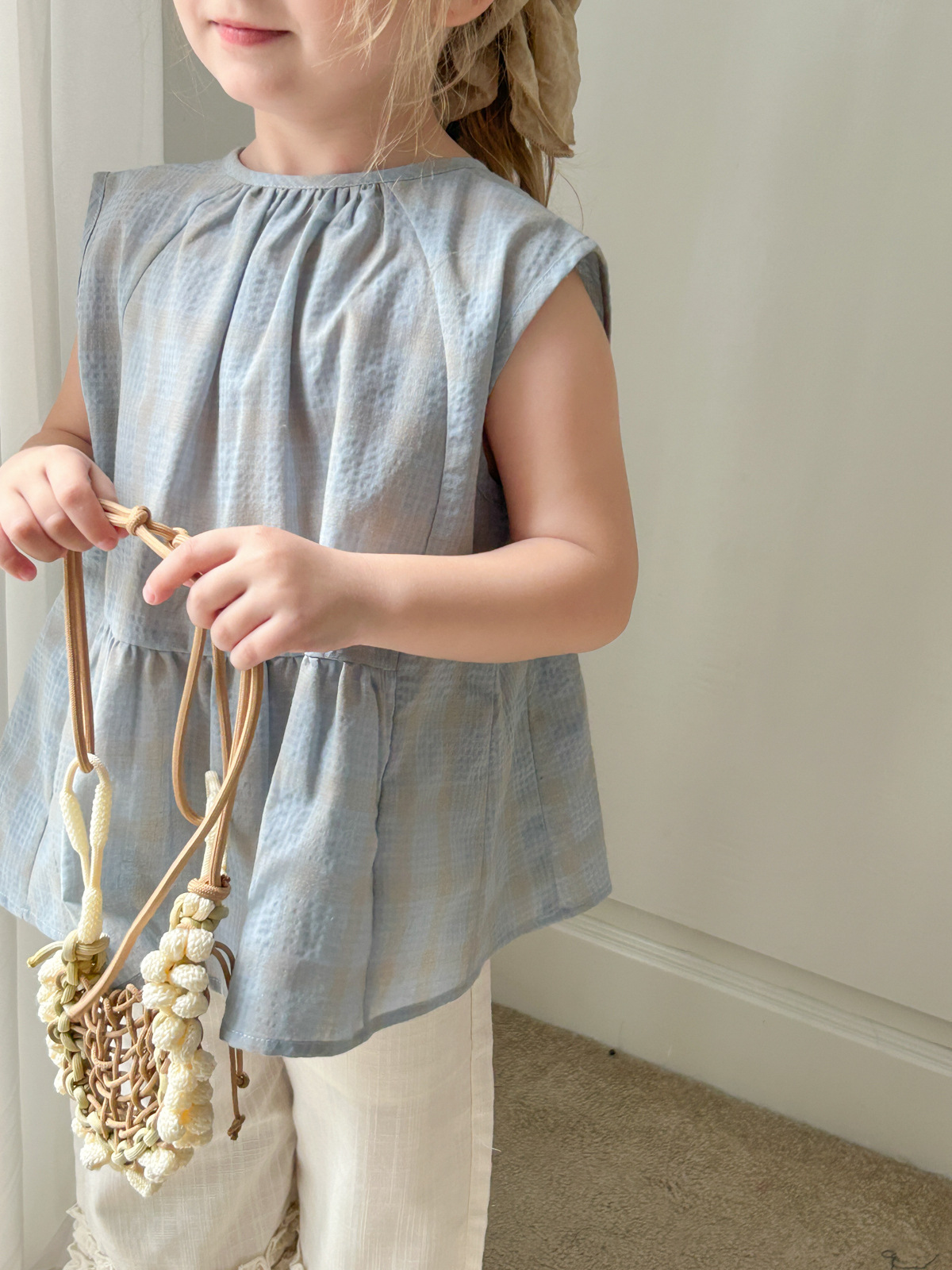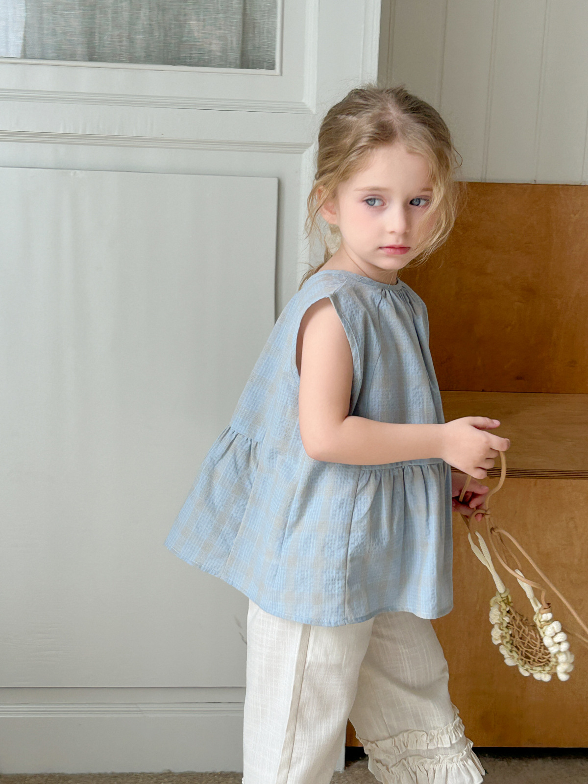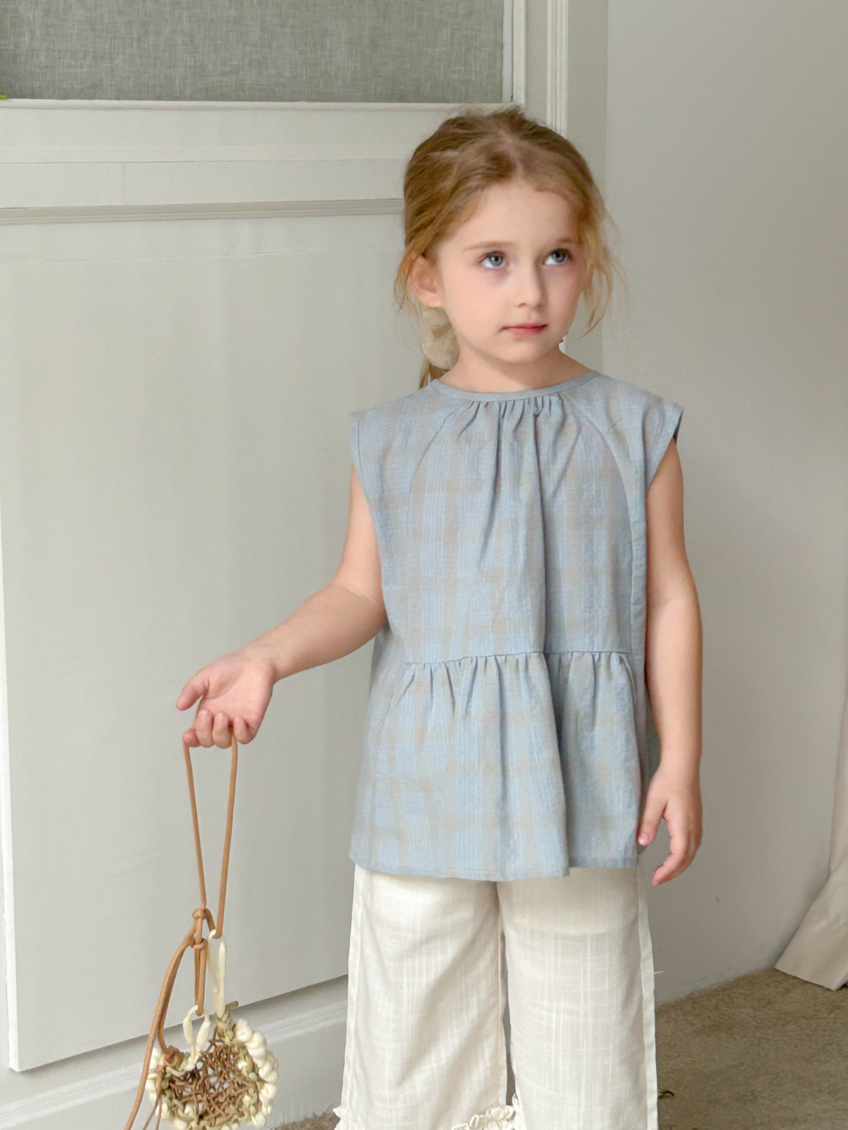 2025 여름 소녀 새로운 격자 무늬 민소매 달콤한 귀여운 연꽃 잎 스윙 탑 소녀 스타일리시 심플 셔츠스토어 가기