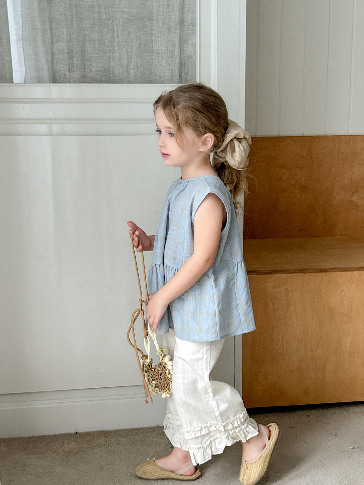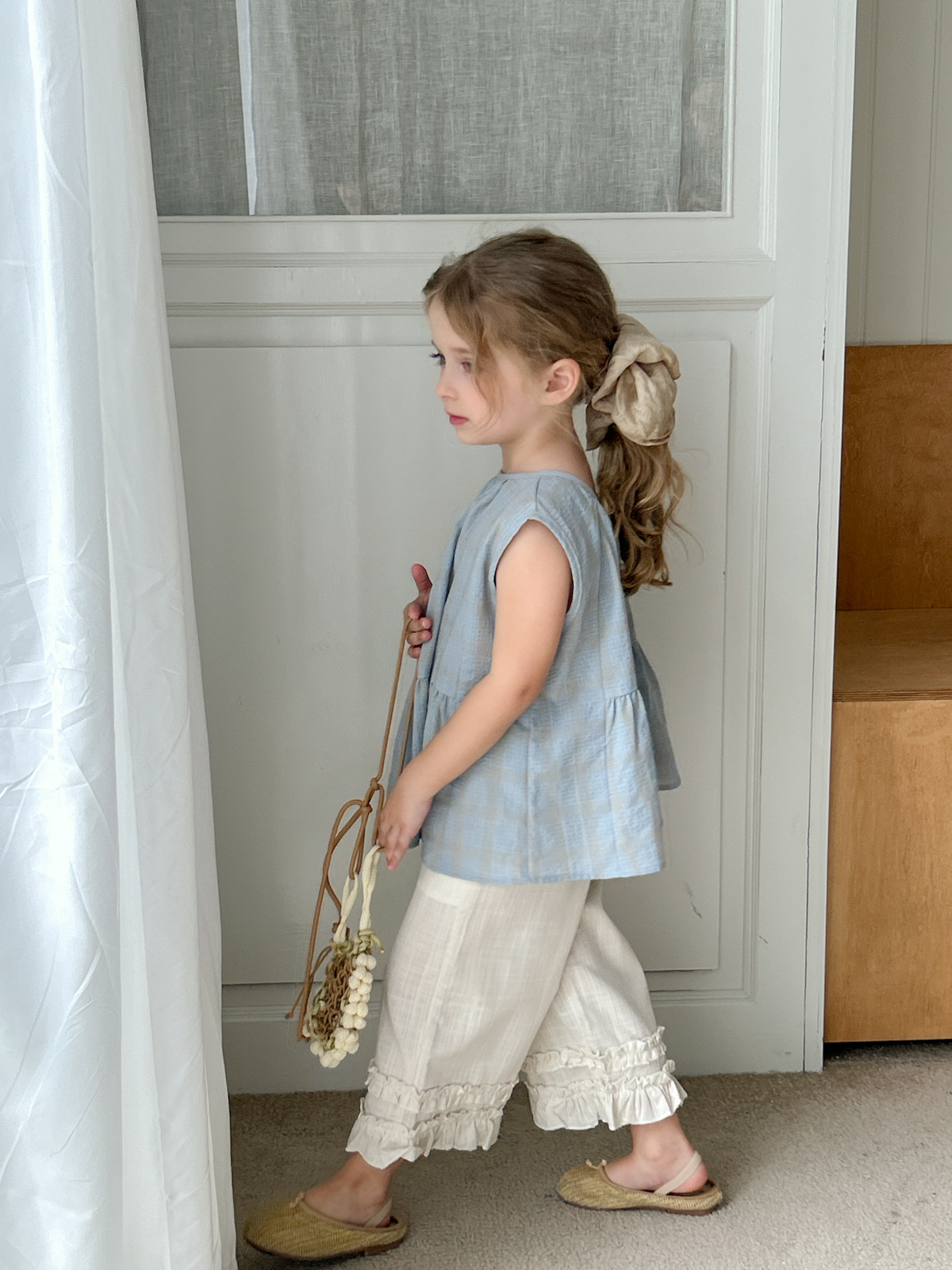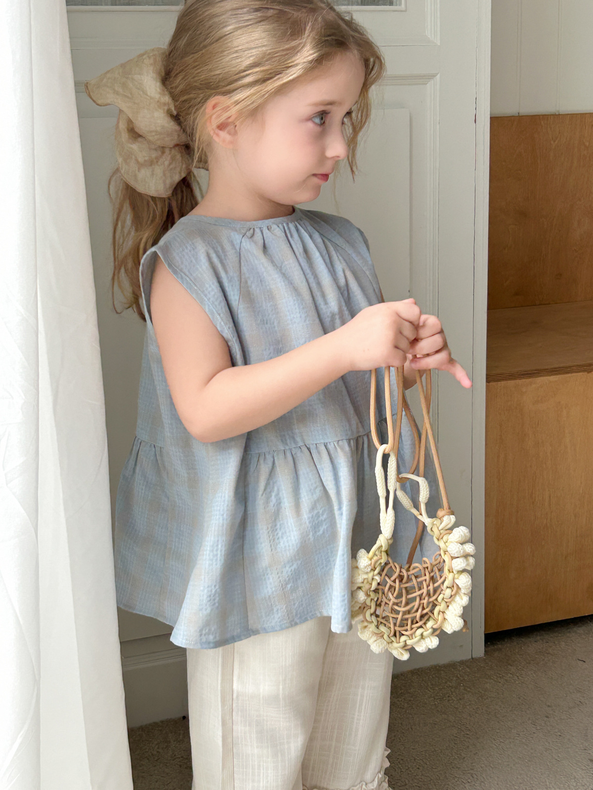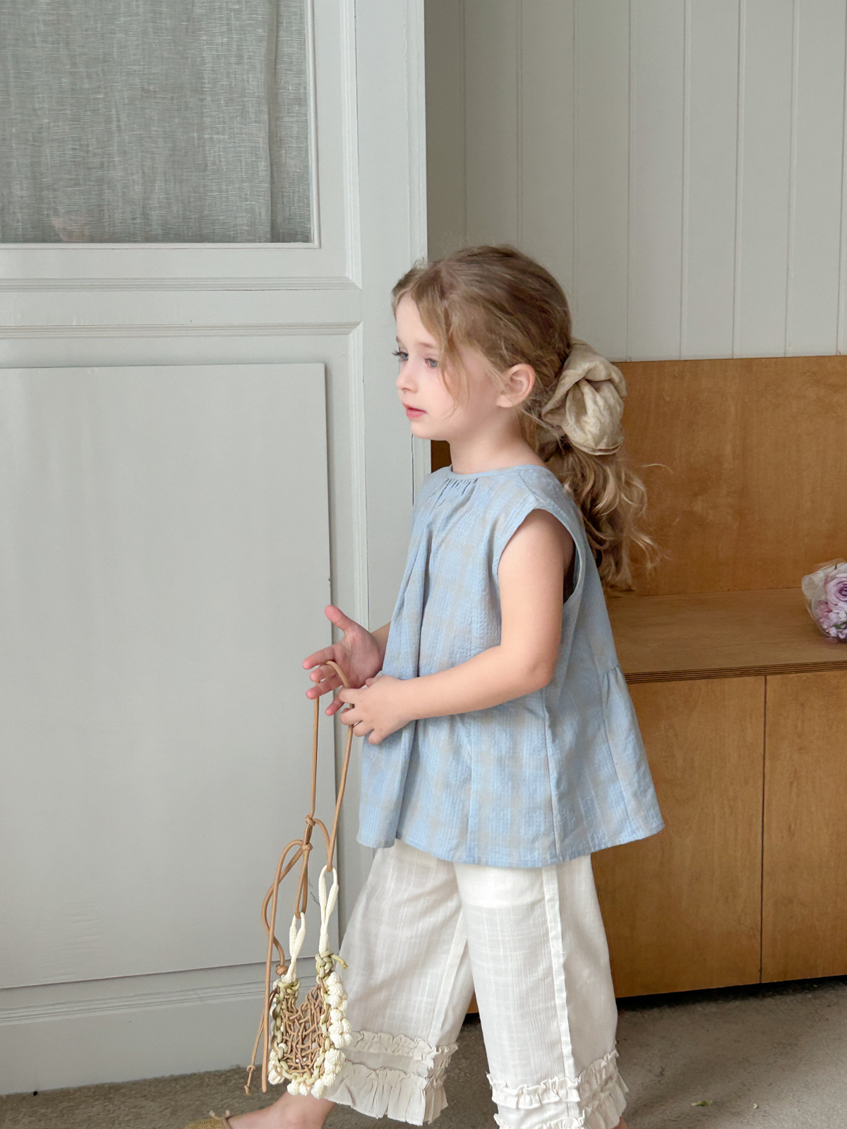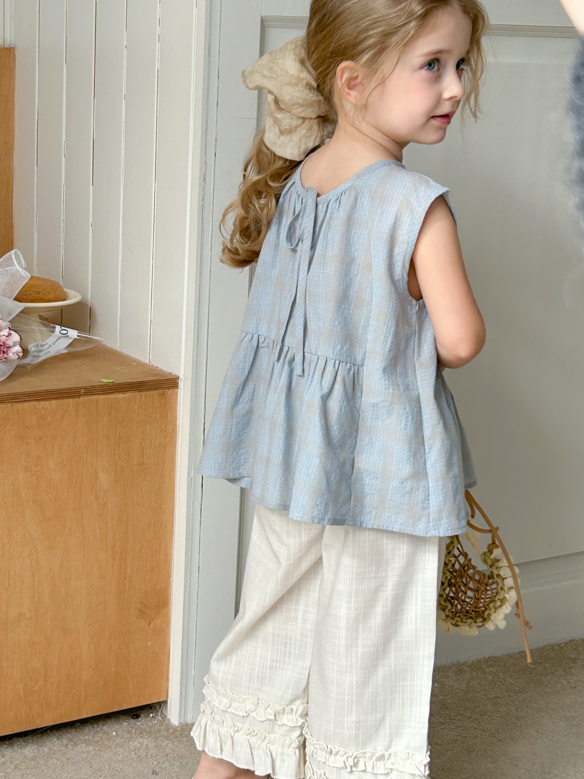2025 여름 소녀 새로운 격자 무늬 민소매 달콤한 귀여운 연꽃 잎 스윙 탑 소녀 스타일리시 심플 셔츠스토어 가기
