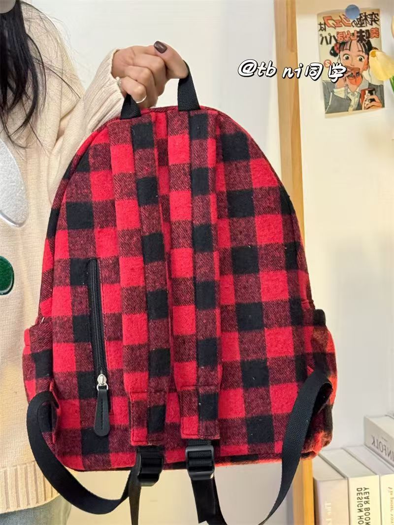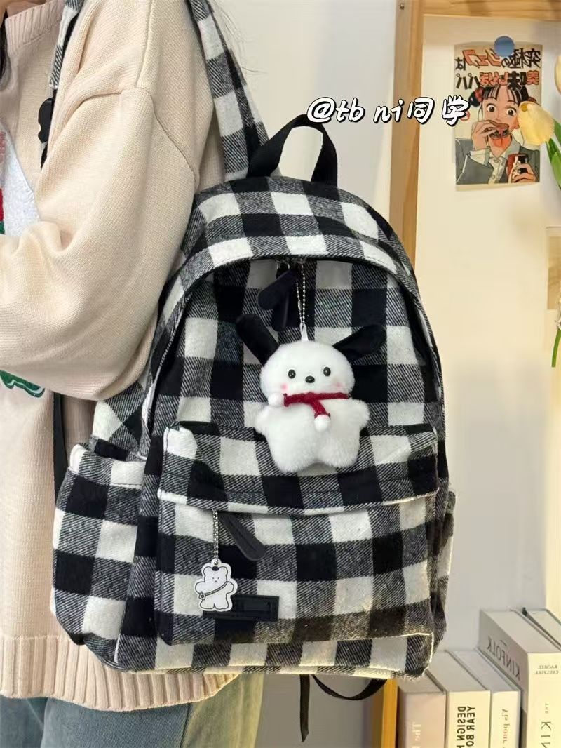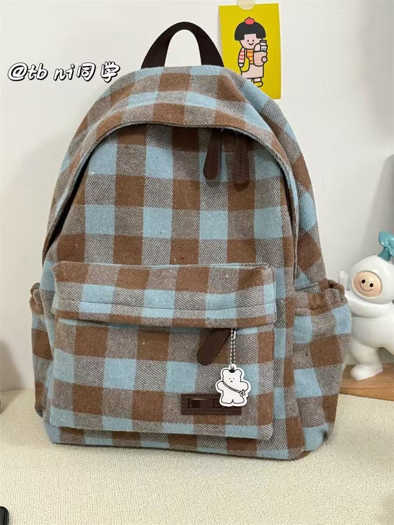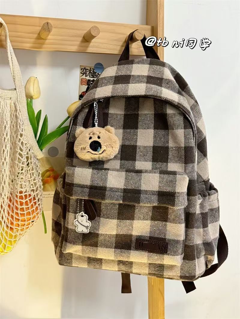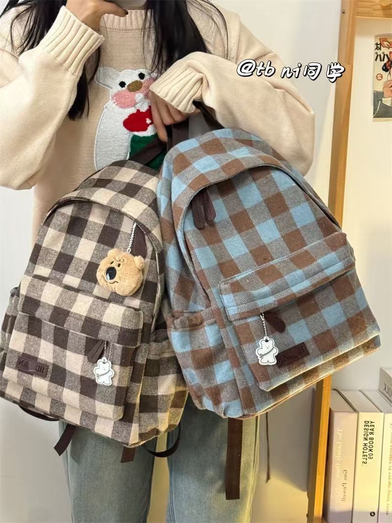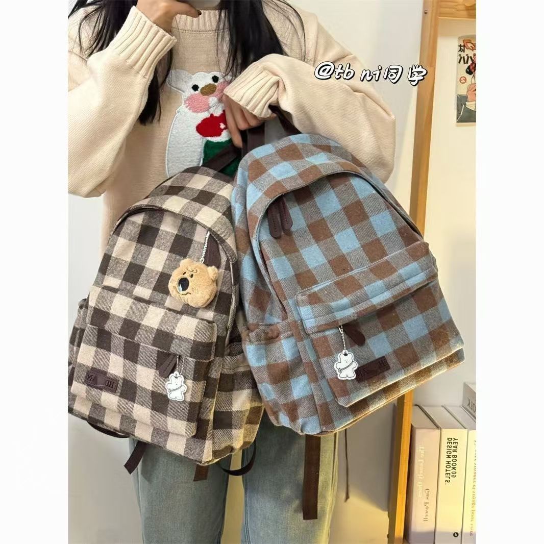 2024年冬季格子帆布背包女中学生初中生双肩包大学生简约可爱书包