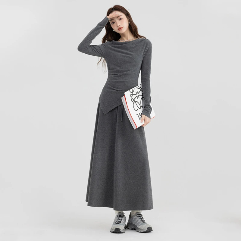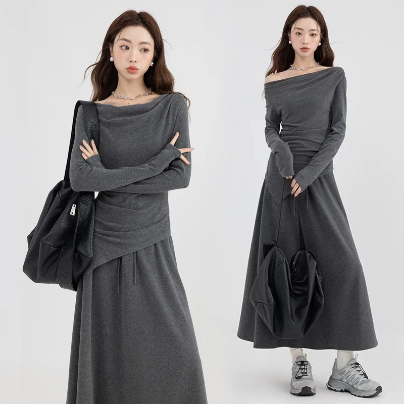 봄 캐주얼 세트 여성 하이 엔드 스커트 그레이 티 인 티 오프 숄더 불규칙한 탑 투피스 세트