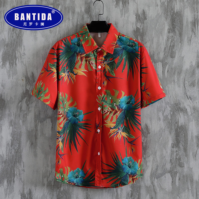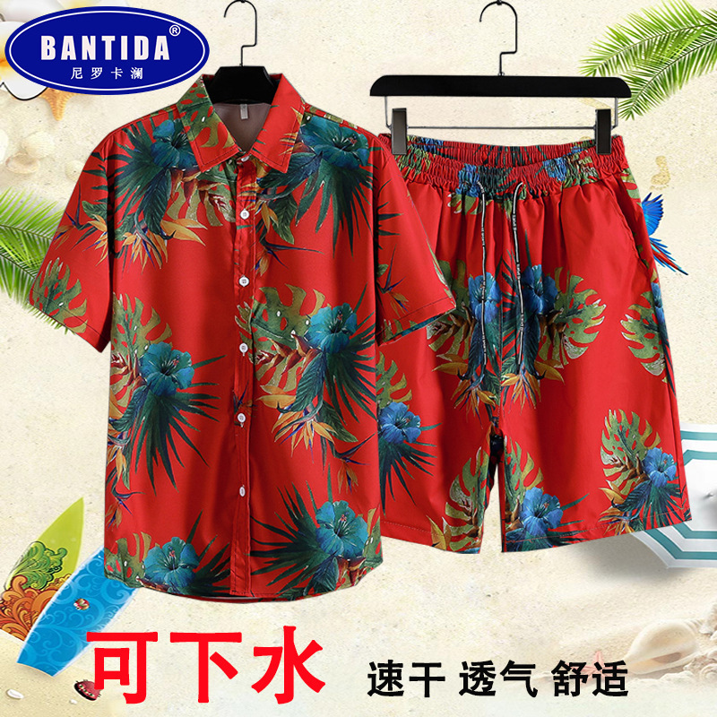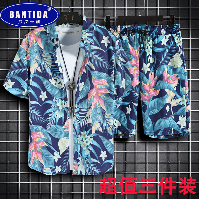 3 피스 비치 세트 남자 올 매치 퀵 건조 반바지 하이난 아일랜드 레트로 홍콩 스타일 여행 플라워 셔츠 클래스 옷스토어 가기