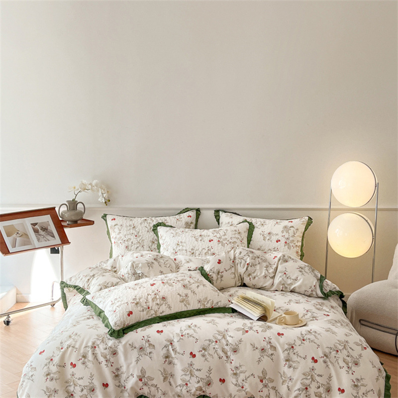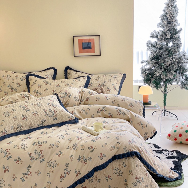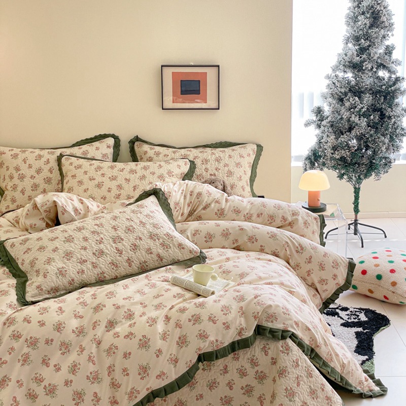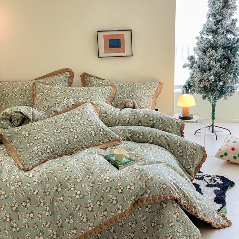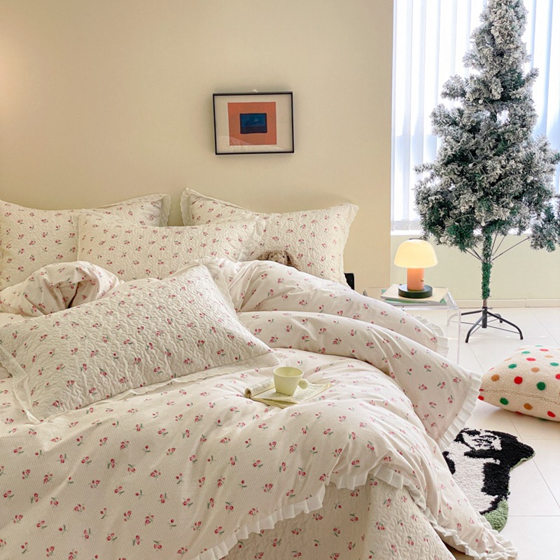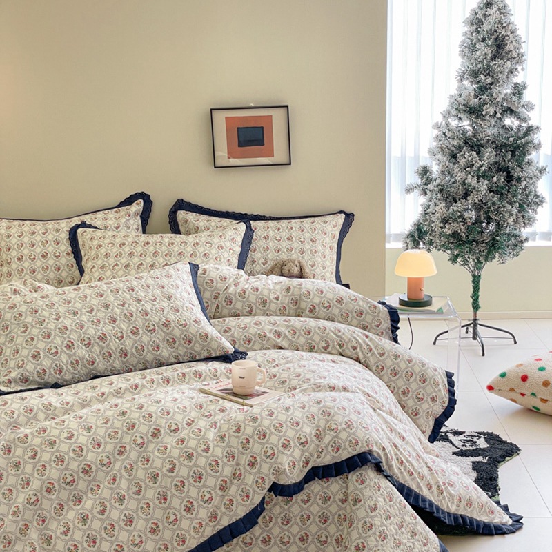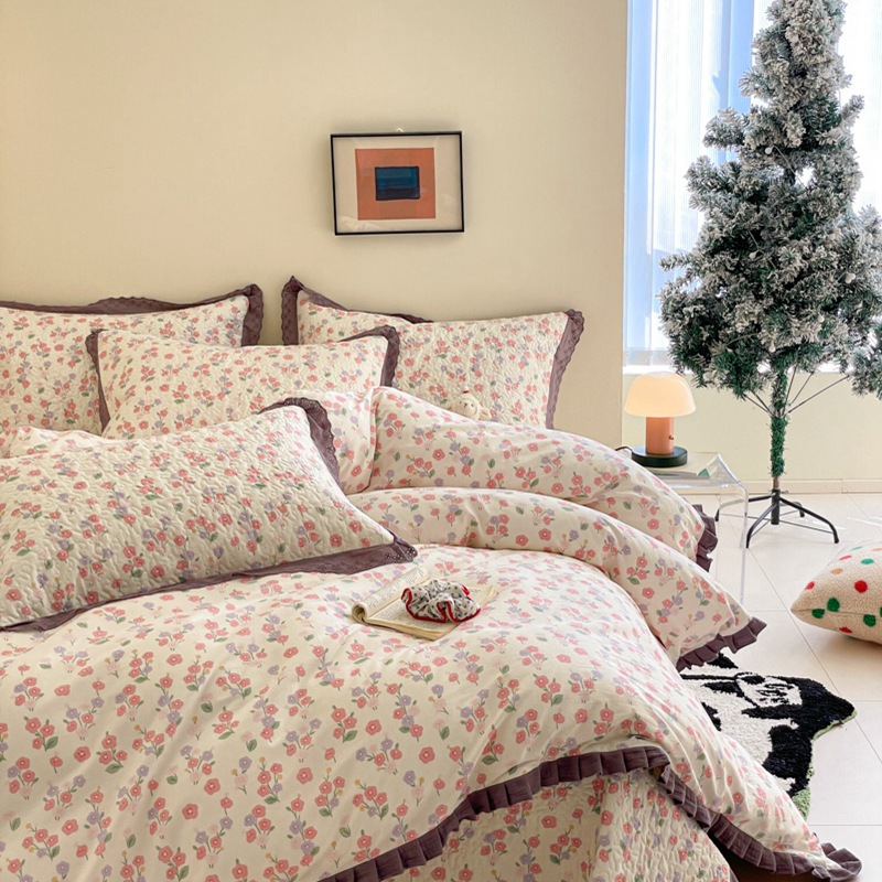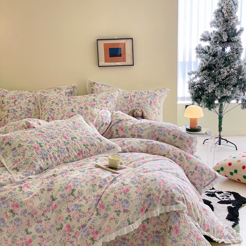 프렌치 스타일 코튼 침대 커버 4 피스 세트 퓨어 코튼 클래스 3 피스 세트 가정용 침구 키트 싱글 침대 커버 작은 꽃 침대 커버스토어 가기