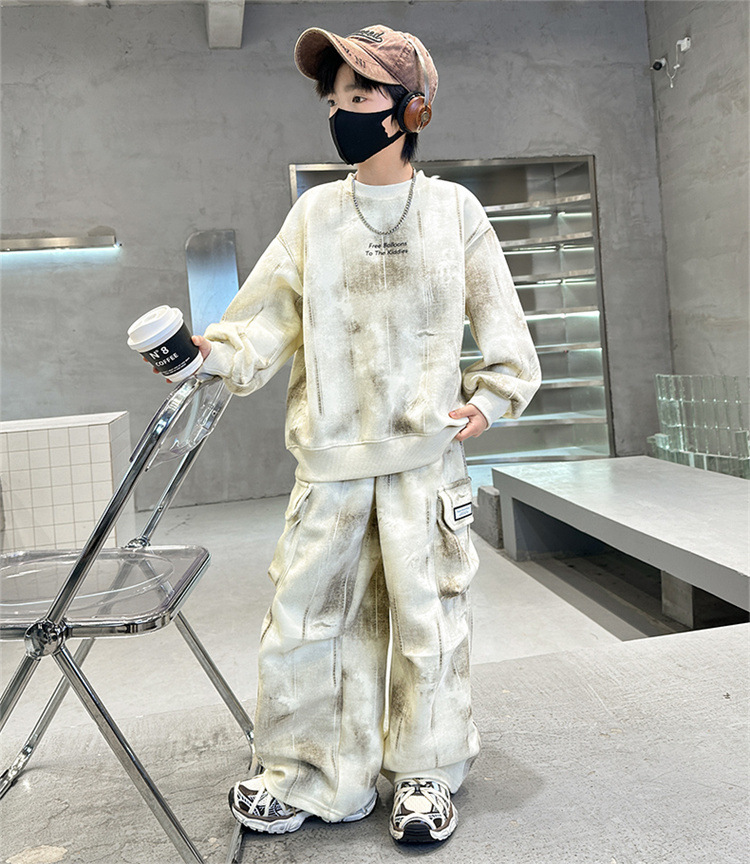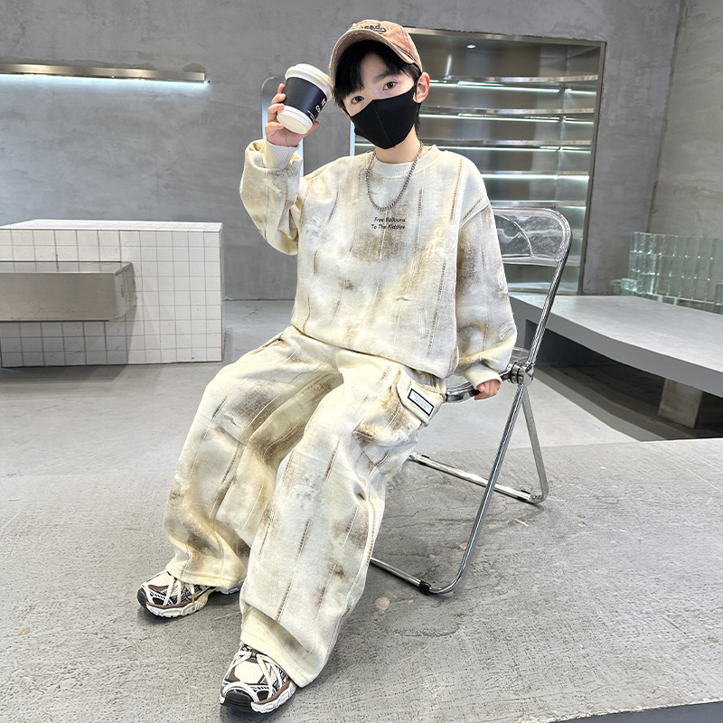 남아용 가을 2025년형 중대형 아동복 멋진 캐주얼 스포츠 프린트 햄버거 스웨트셔츠 투피스 세트 트렌디스토어 가기