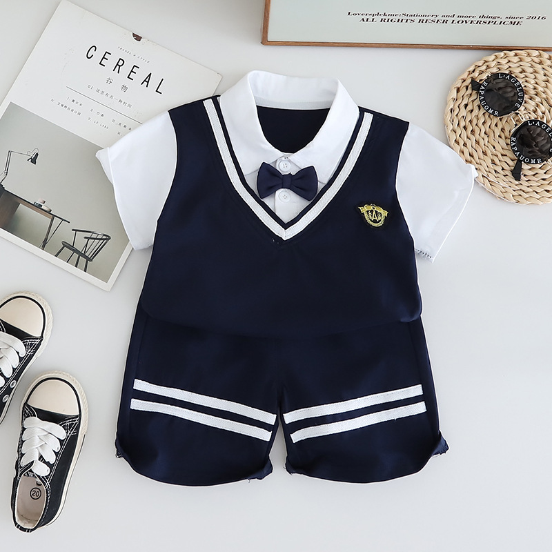어린이 의류 도매 여름 의류 어린이 세트 2025 새로운 영국 아카데미 스타일 옷깃 잘 생긴 소년 여름 세트