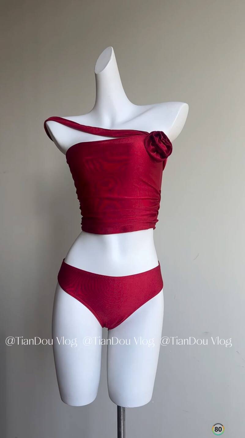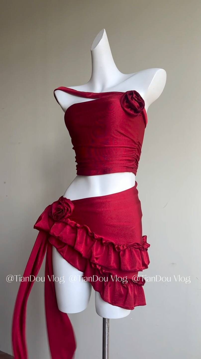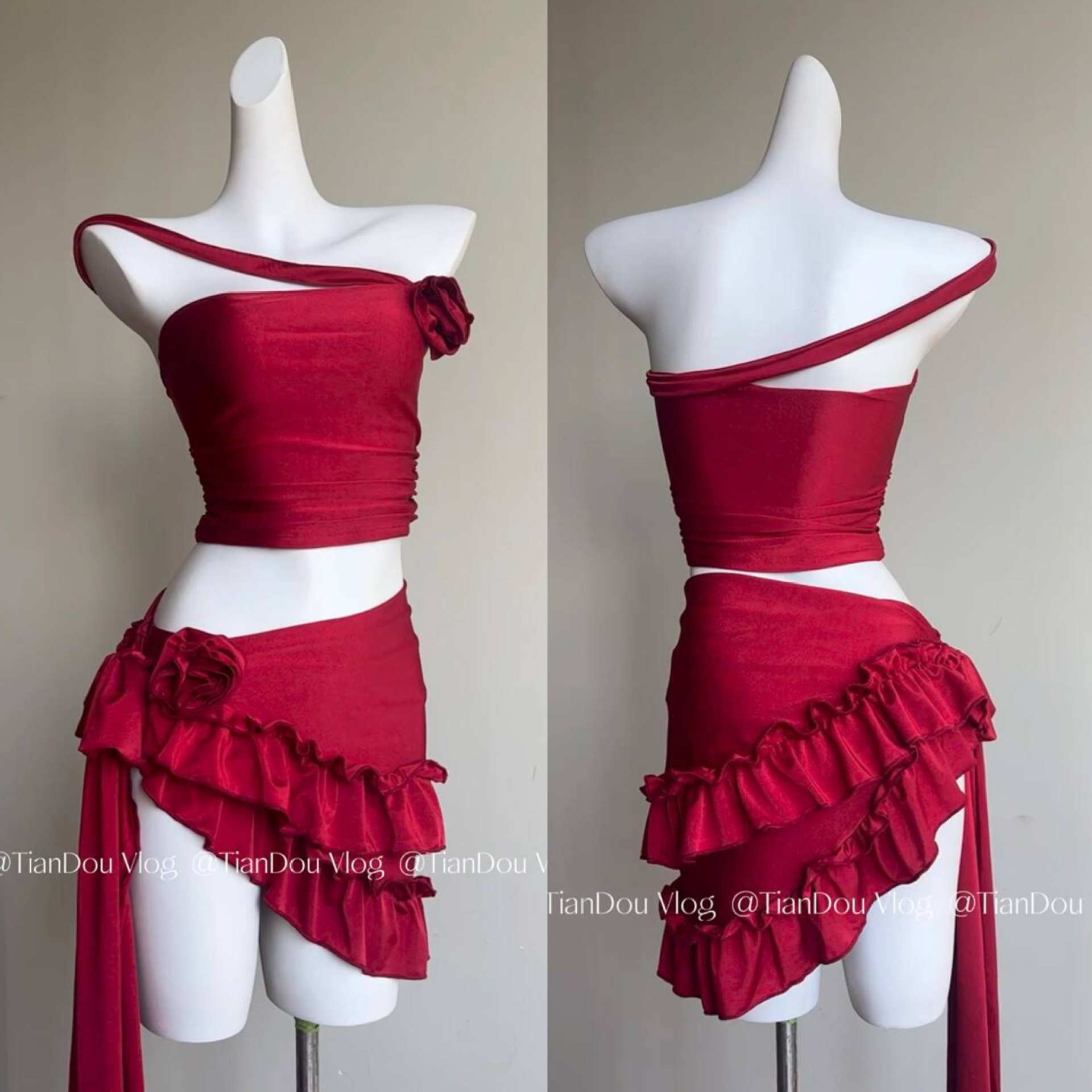 새로운 섹시 레드 로즈 스트랩리스 스플릿 스커트 수영복 여성 비키니 핫 걸 살짝 덮는 슬리밍 온천