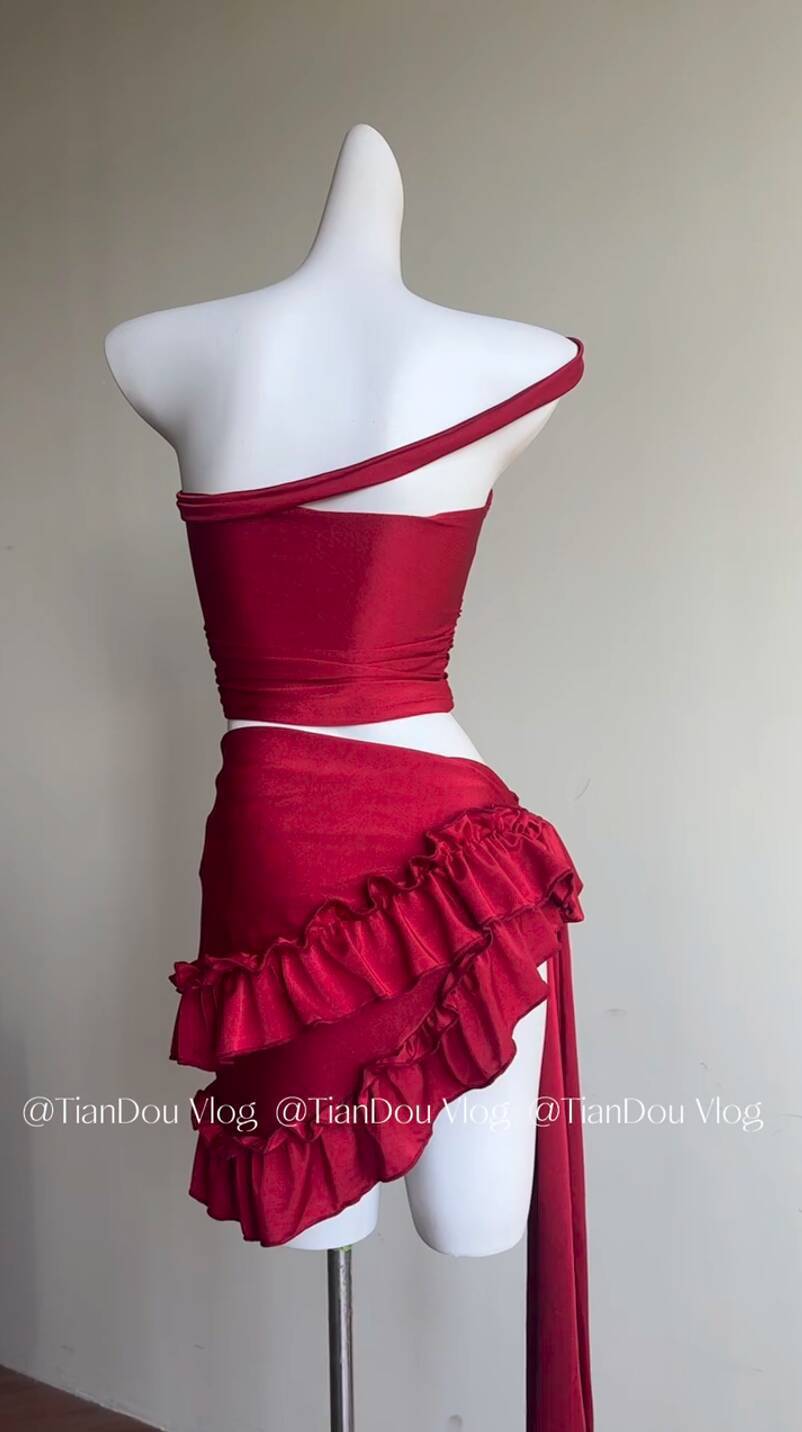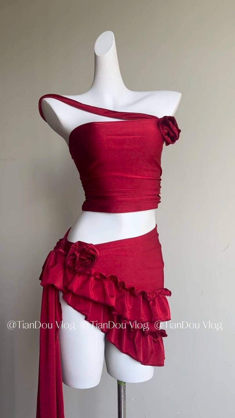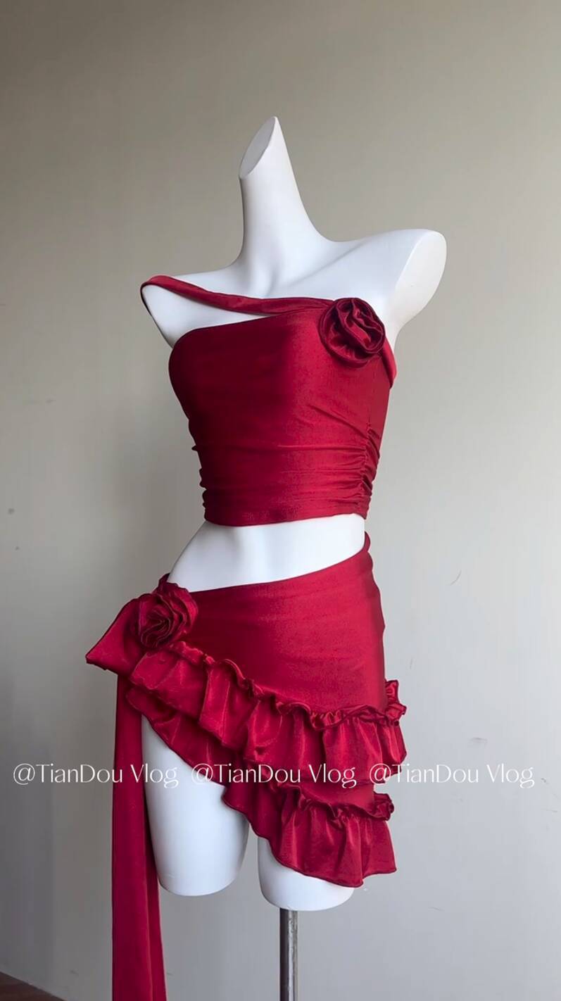 새로운 섹시 레드 로즈 스트랩리스 스플릿 스커트 수영복 여성 비키니 핫 걸 살짝 덮는 슬리밍 온천