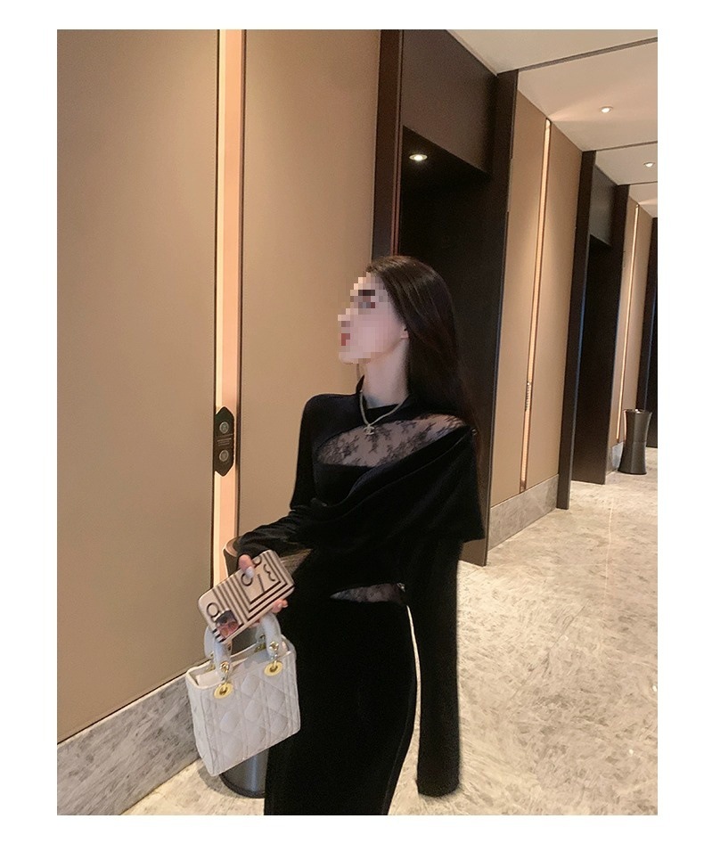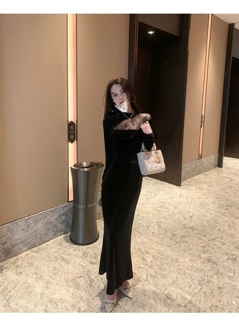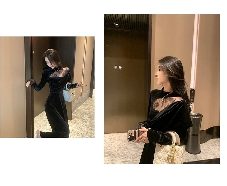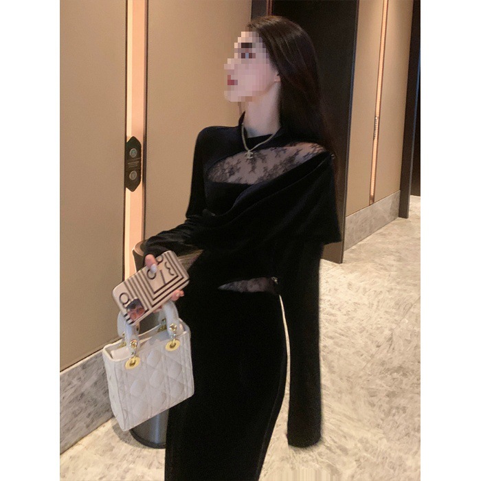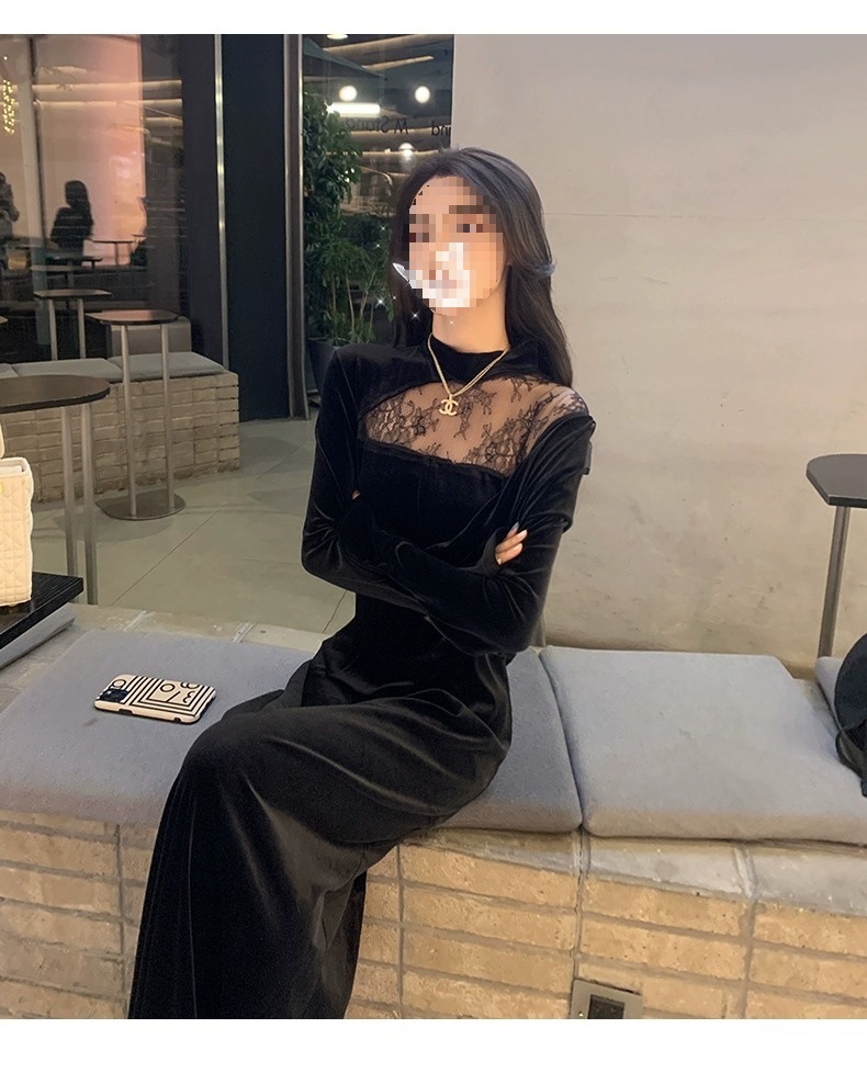 대외 무역 도매 봄과 가을 프랑스 레이스 바느질 벨벳 슬림 기질 긴 소매 원피스 여성 연회 원피스