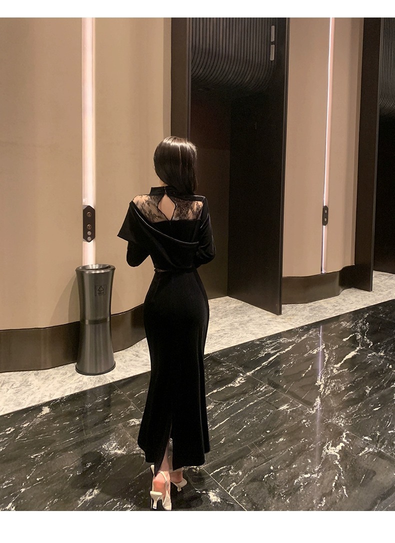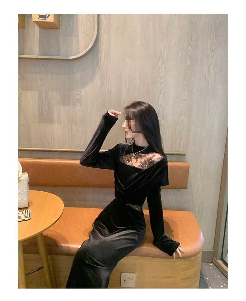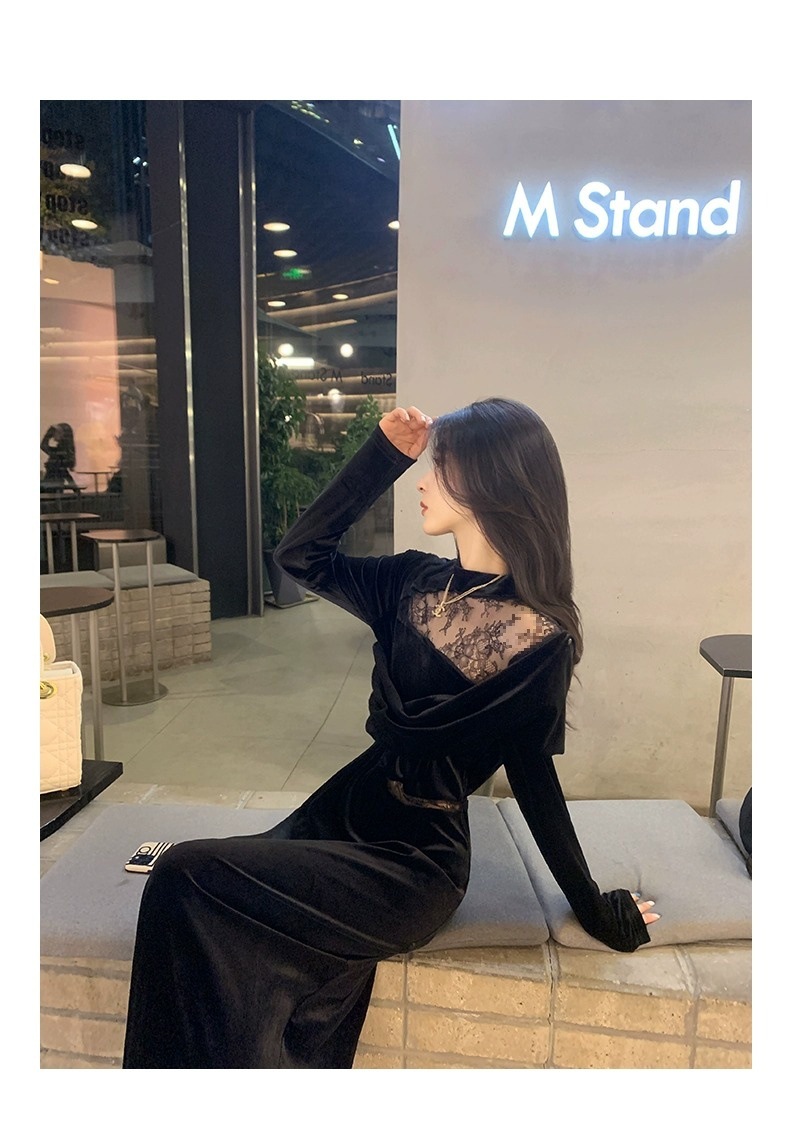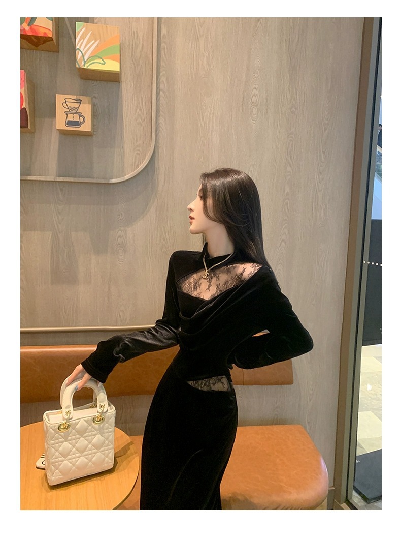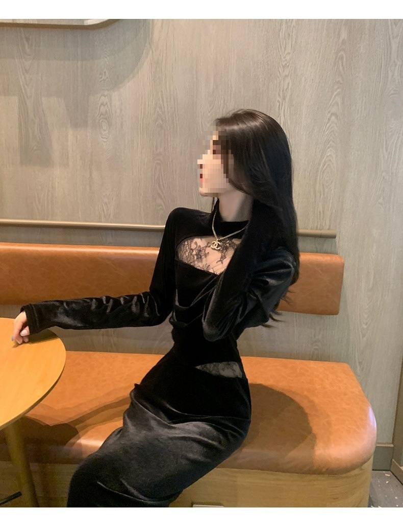 대외 무역 도매 봄과 가을 프랑스 레이스 바느질 벨벳 슬림 기질 긴 소매 원피스 여성 연회 원피스