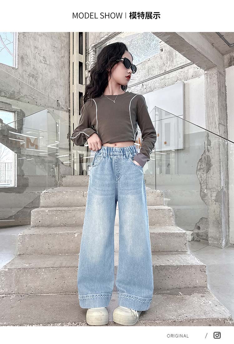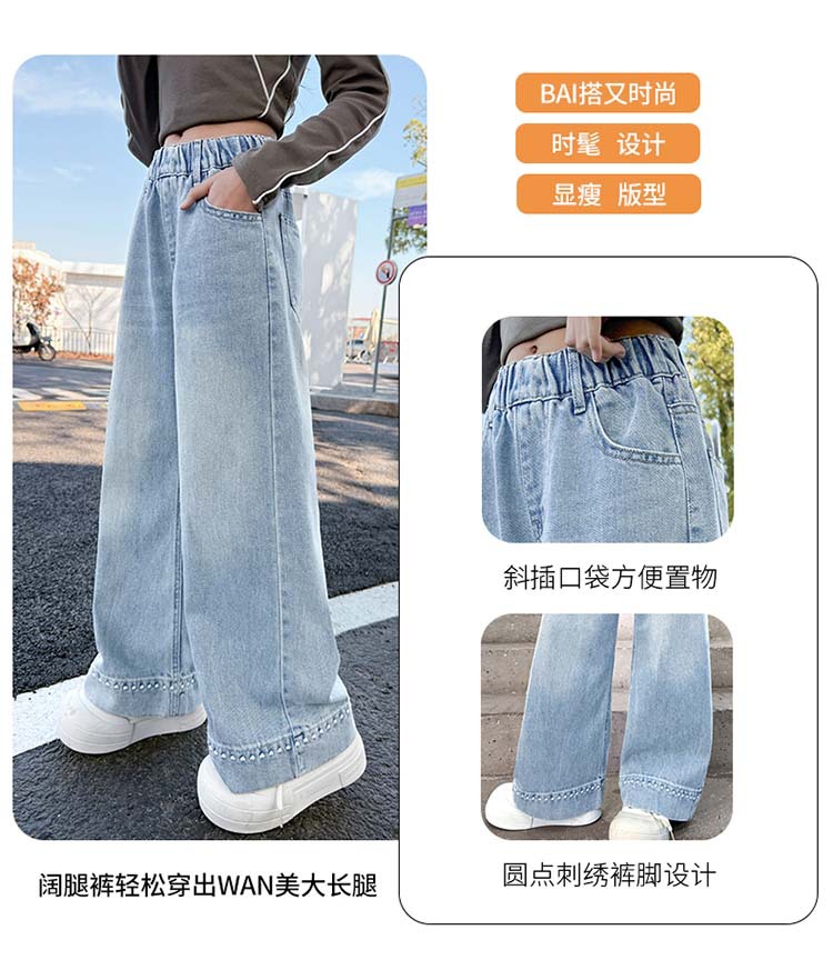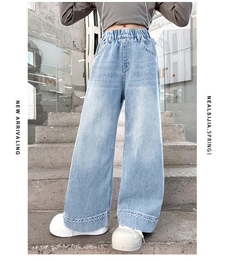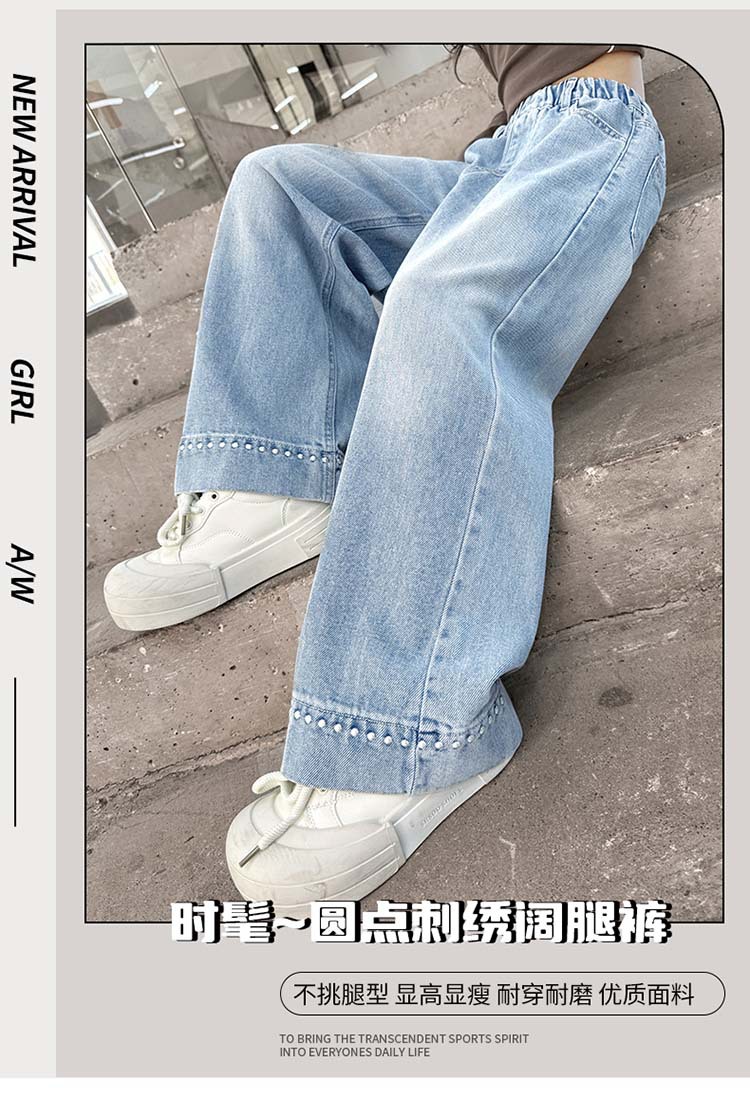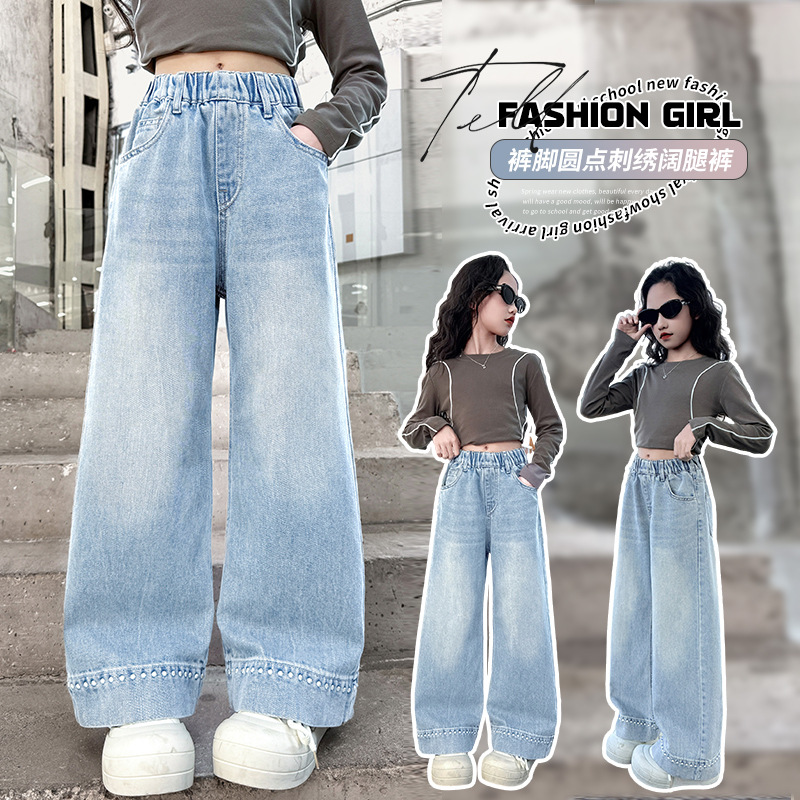 대외 무역 어린이 바지 2025 새로운 봄 소녀 청바지 간단한 조커 자수 넓은 다리 바지 느슨한 바지 도매스토어 가기