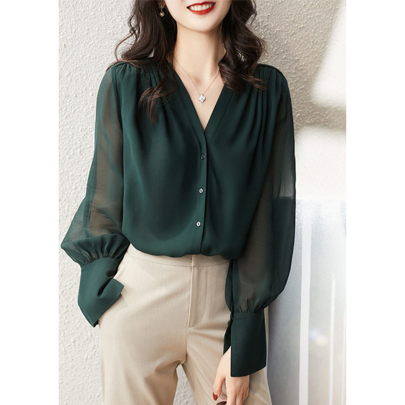 긴 소매 셔츠 여성의 봄과 가을 2025 새로운 프랑스 칼라 디자인 센스 탑 우아한 느슨한 쉬폰 셔츠스토어 가기