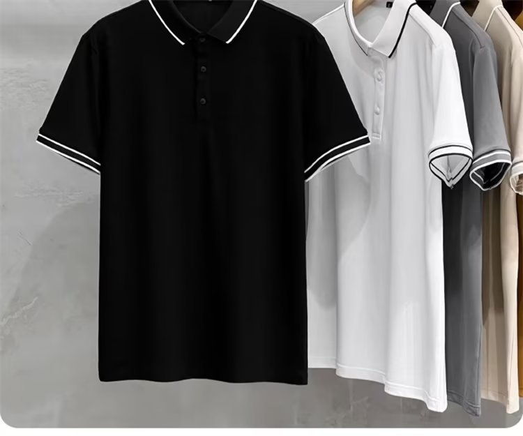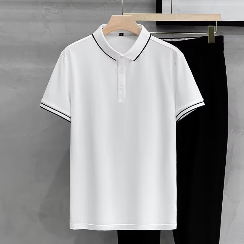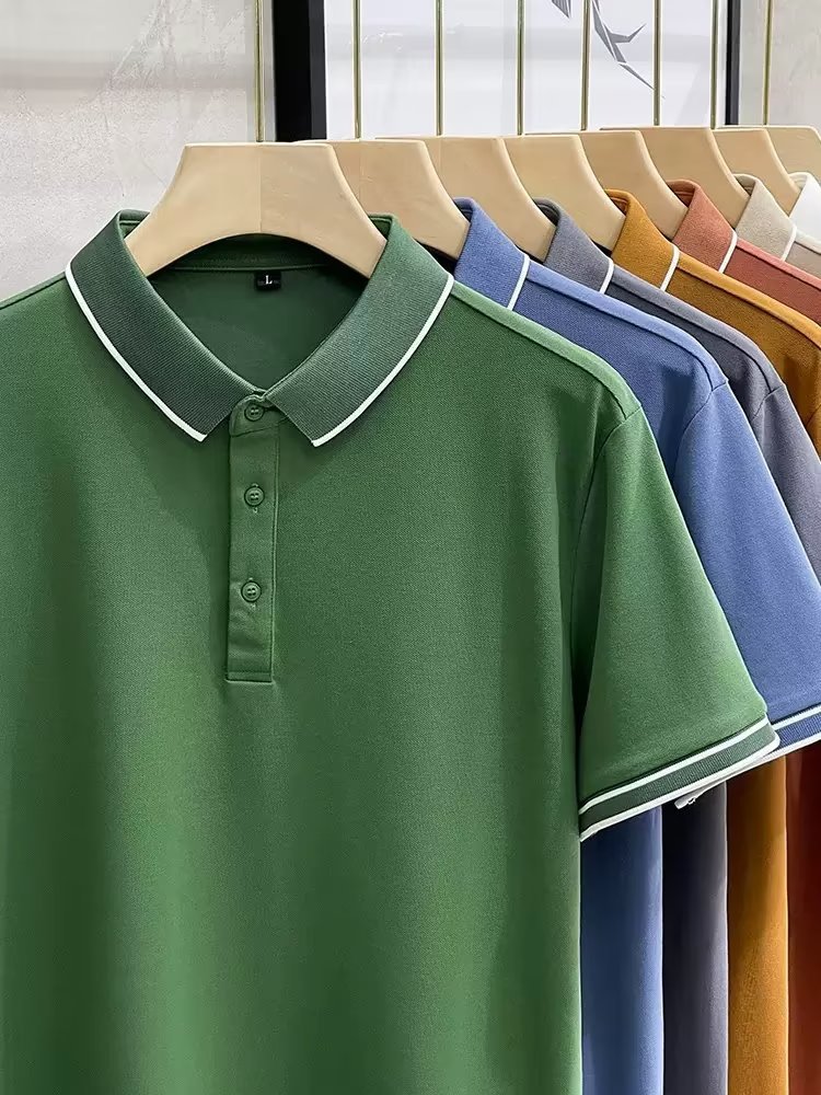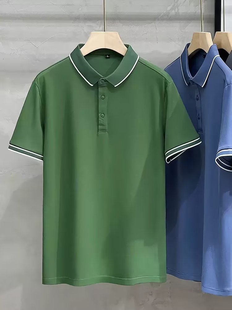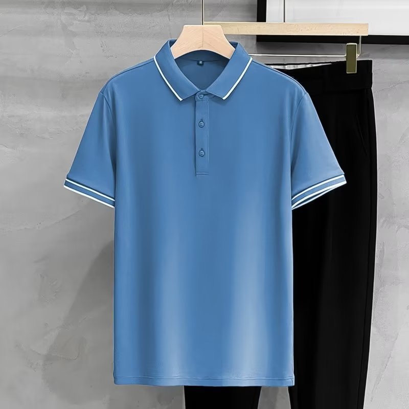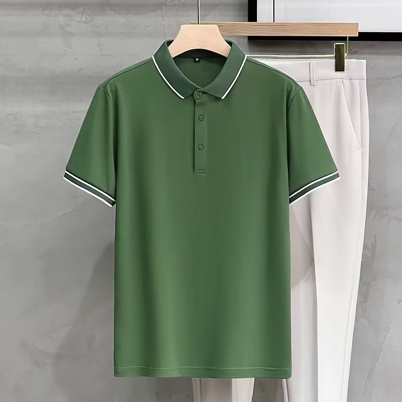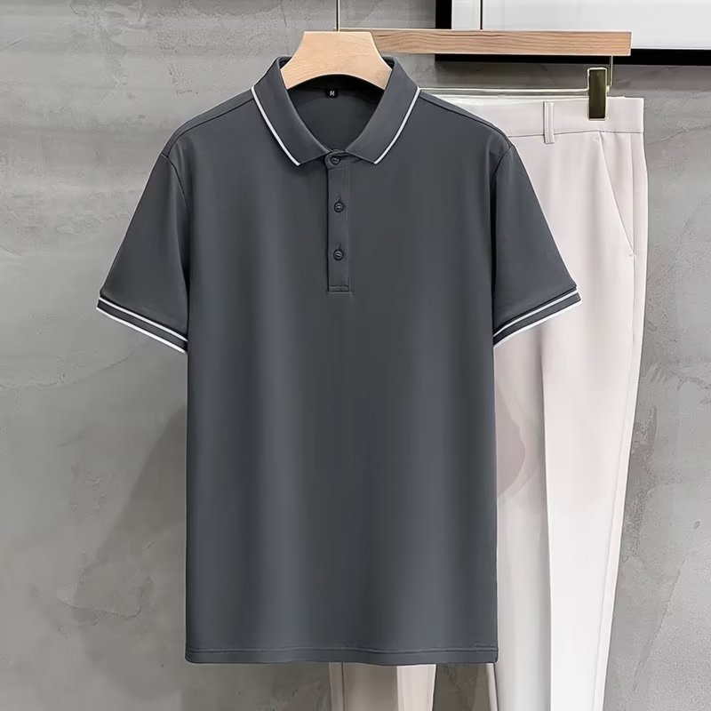 여름 아이스 실크 하이 엔드 남자 올 매치 반팔 탑 얇은 라인 스트라이프 패션 캐주얼 옷깃 티셔츠베이스 폴로 셔츠