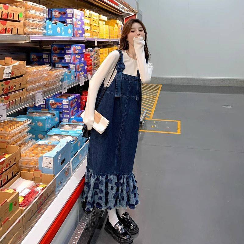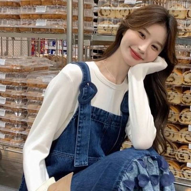 한국식 데님 스트랩 원피스 2025 봄과 가을 여름 새로운 학술 스타일 꽃잎 투피스 세트 슬림 원피스스토어 가기