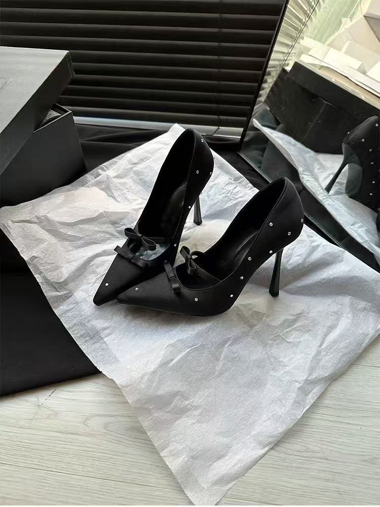 고급 감각 프랑스 기질 싱글 레이어 신발 2025 봄과 여름 활 뾰족한 하이힐 여성용 모조 다이아몬드 블랙 싱글 레이어 신발스토어 가기
