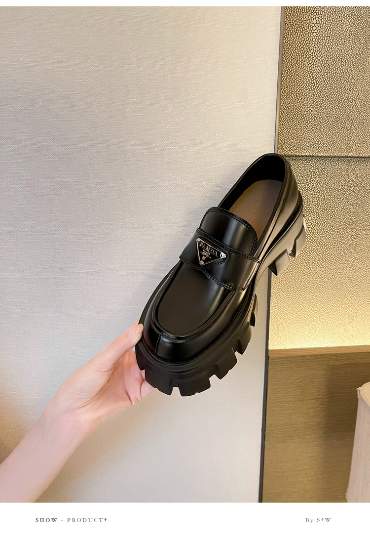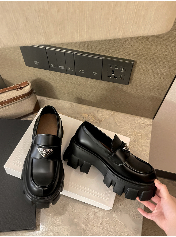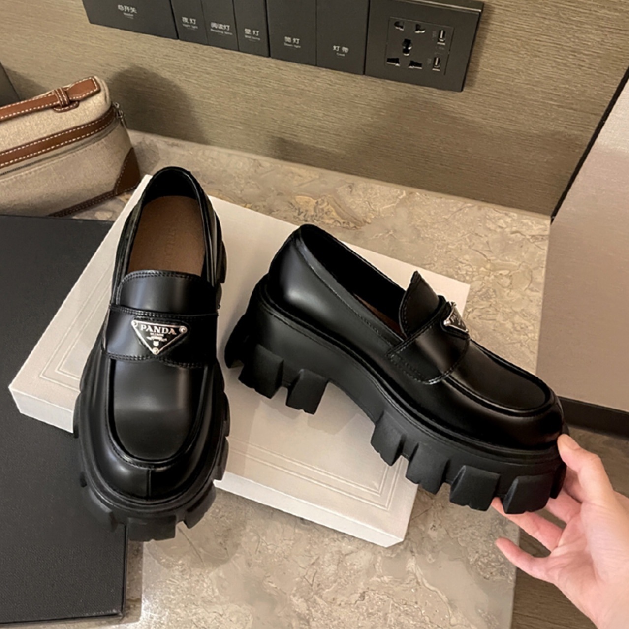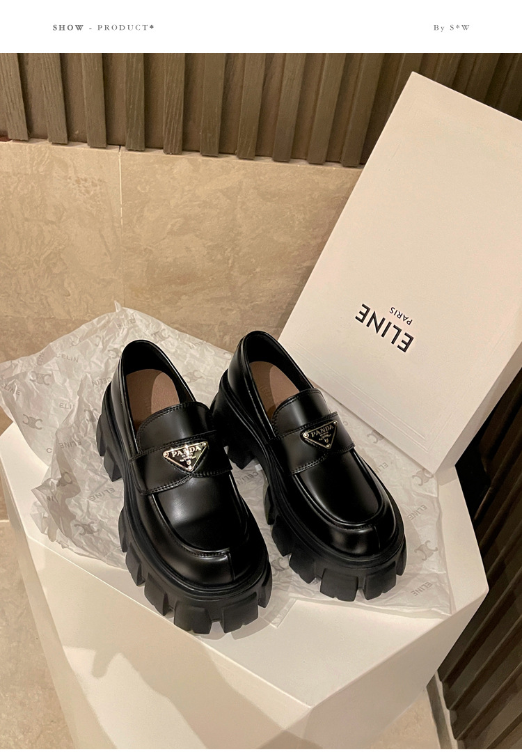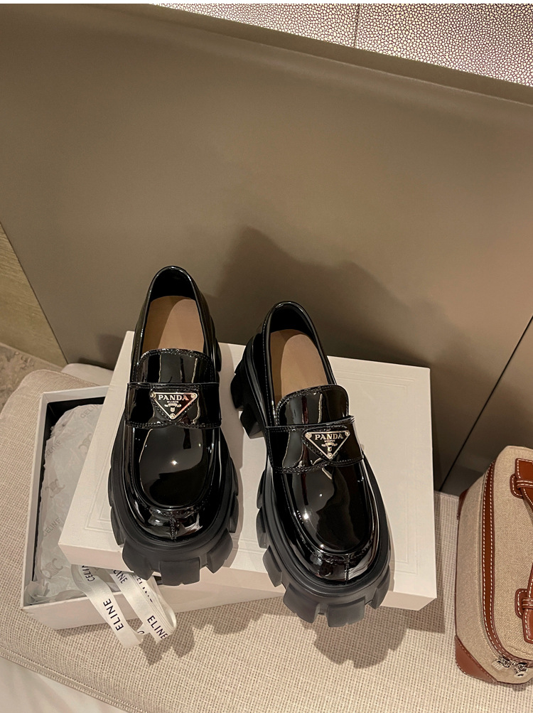 경량 럭셔리 여성 신발 삼각 로고 두꺼운 밑창 로퍼 2024 신상 가을 여름 영국 스타일 블랙 가죽 신발스토어 가기
