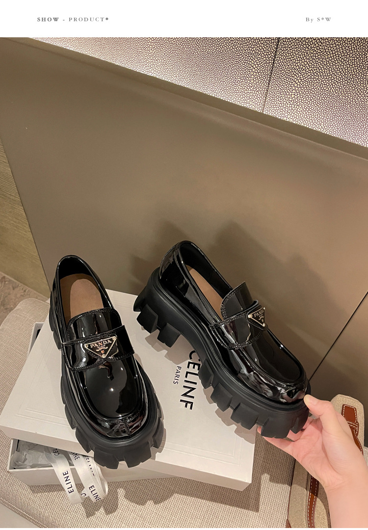 경량 럭셔리 여성 신발 삼각 로고 두꺼운 밑창 로퍼 2024 신상 가을 여름 영국 스타일 블랙 가죽 신발