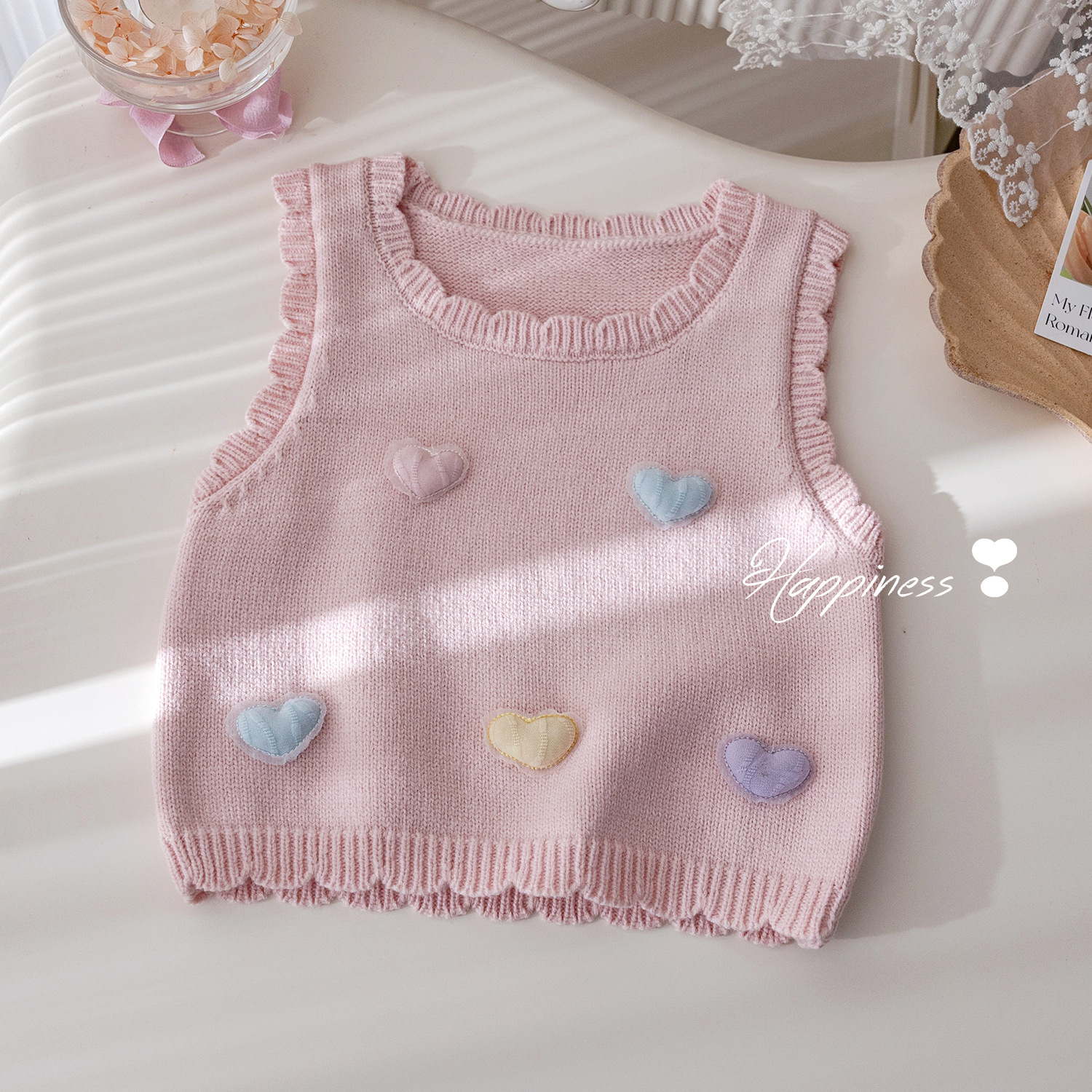 소녀 니트 조끼 2025 봄과 가을 새로운 한국 스타일 외국 스타일 어린이를위한 3 차원 사랑 스웨터 조끼스토어 가기