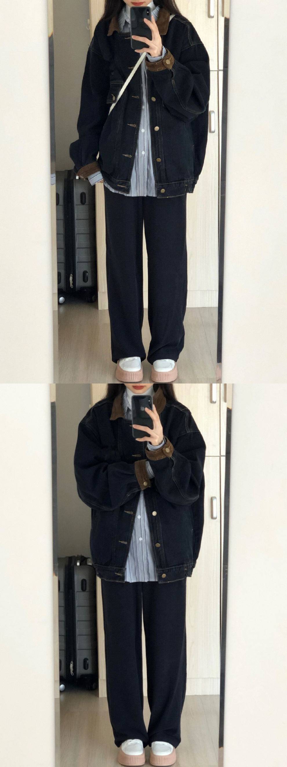 블랙 데님 코트 여자 봄 2025 새로운 도착 레트로 홍콩 스타일 디자인 틈새 한국 루즈 재킷 탑스토어 가기