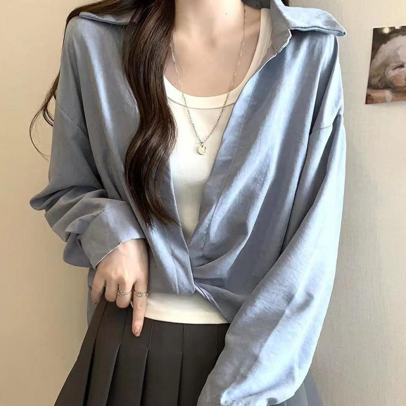 가을 새로운 적층 내부 프랑스 디자인 탑 블루 코튼 셔츠 여성용 틈새 셔츠