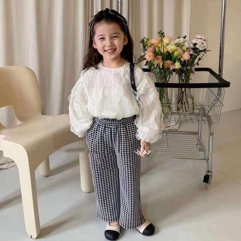 소녀 세트 레이스 메쉬 슈퍼 요정 탑 격자 무늬 높은 허리 바지 25 가을 새로운 대외 무역 아동복스토어 가기
