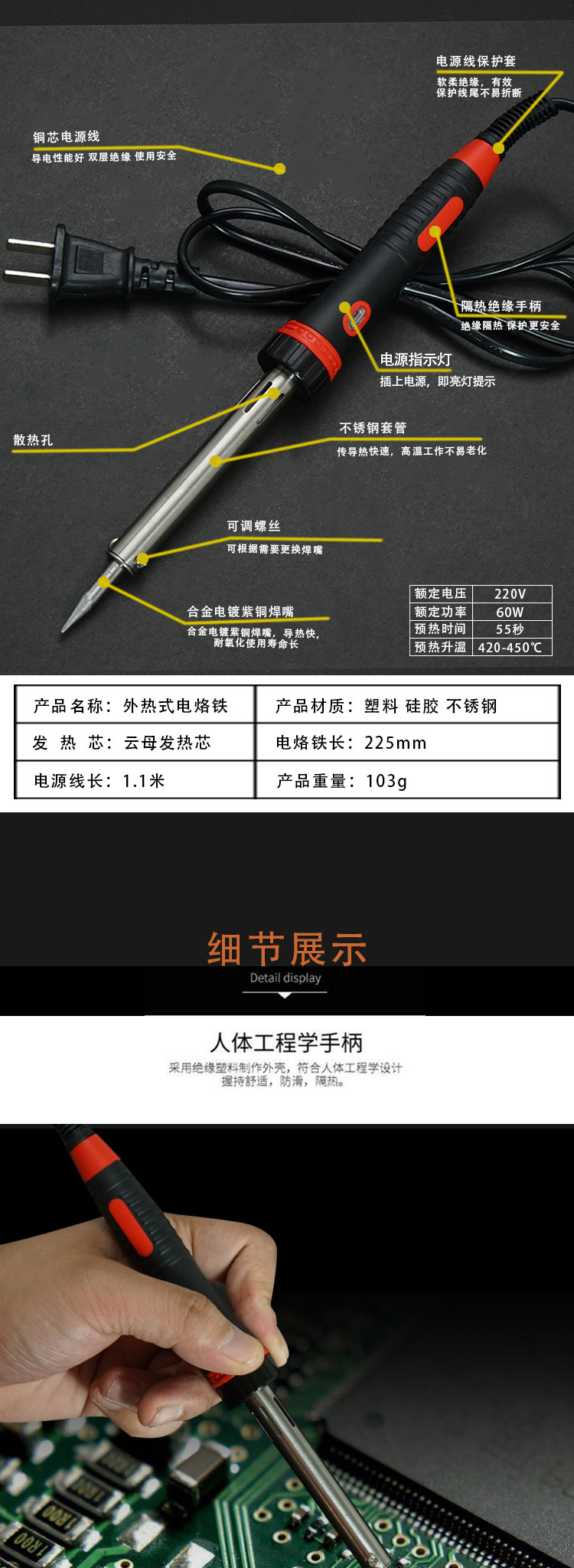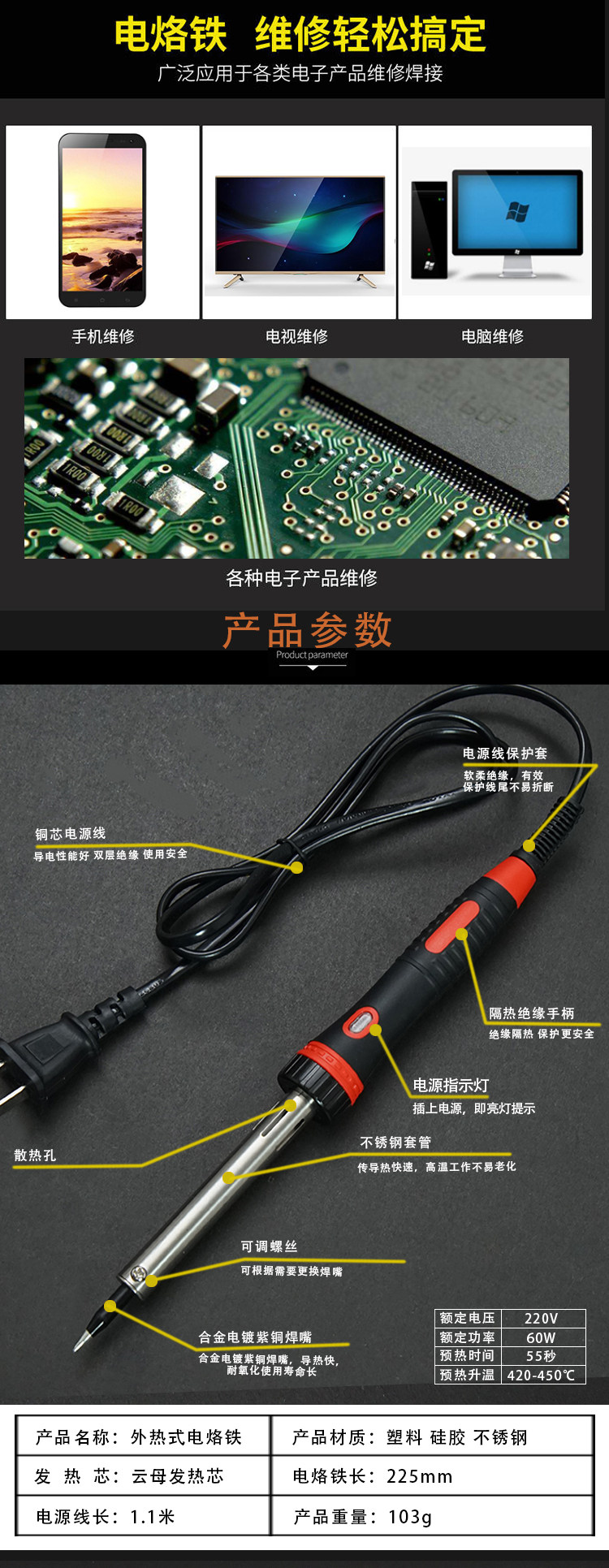• 60W 블랙 다이아몬드 전기 납땜 인두 단일 핸들