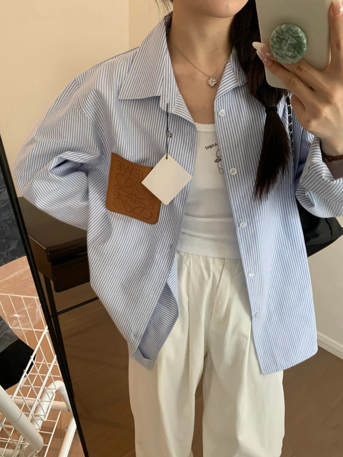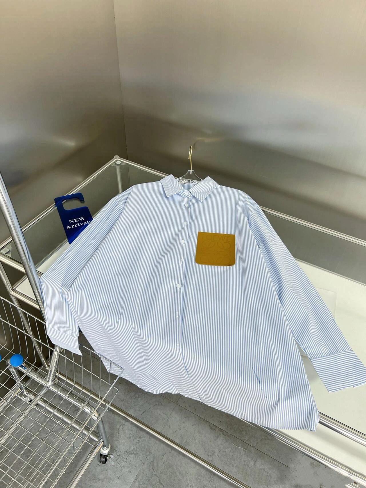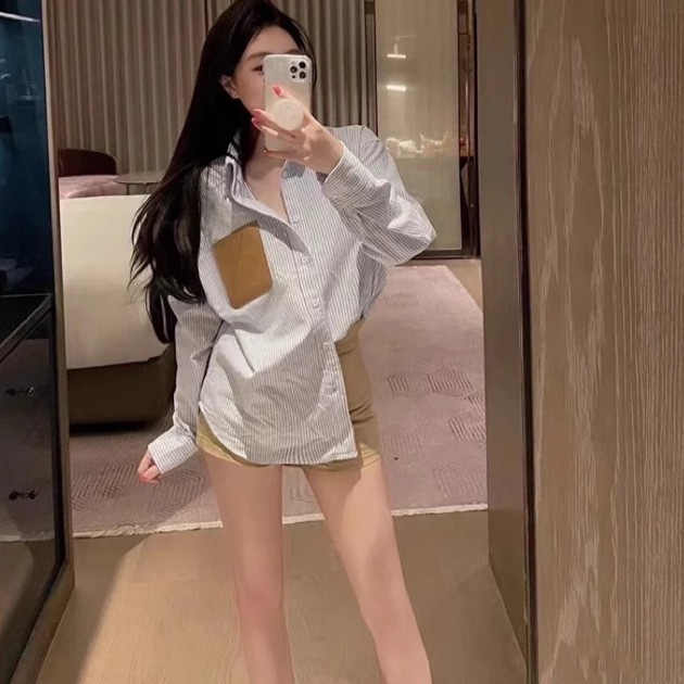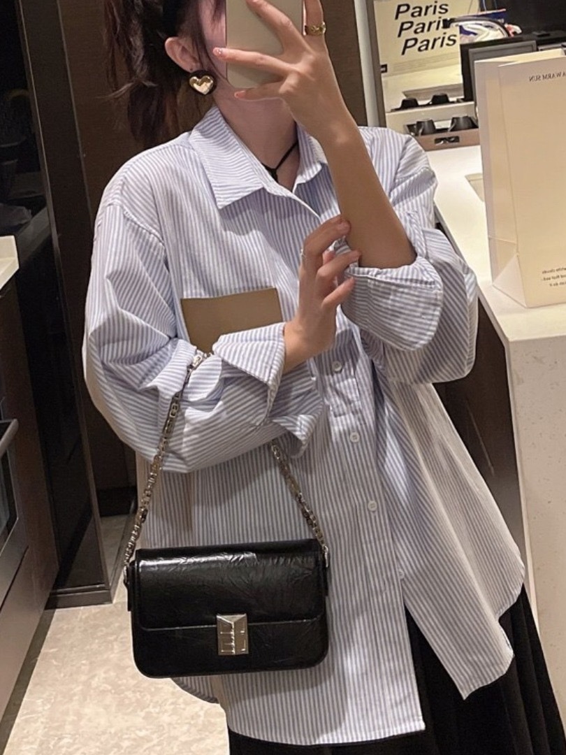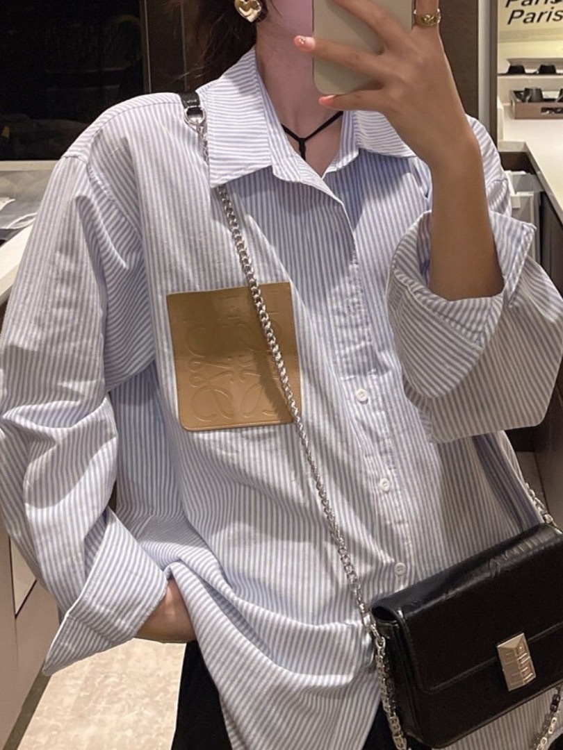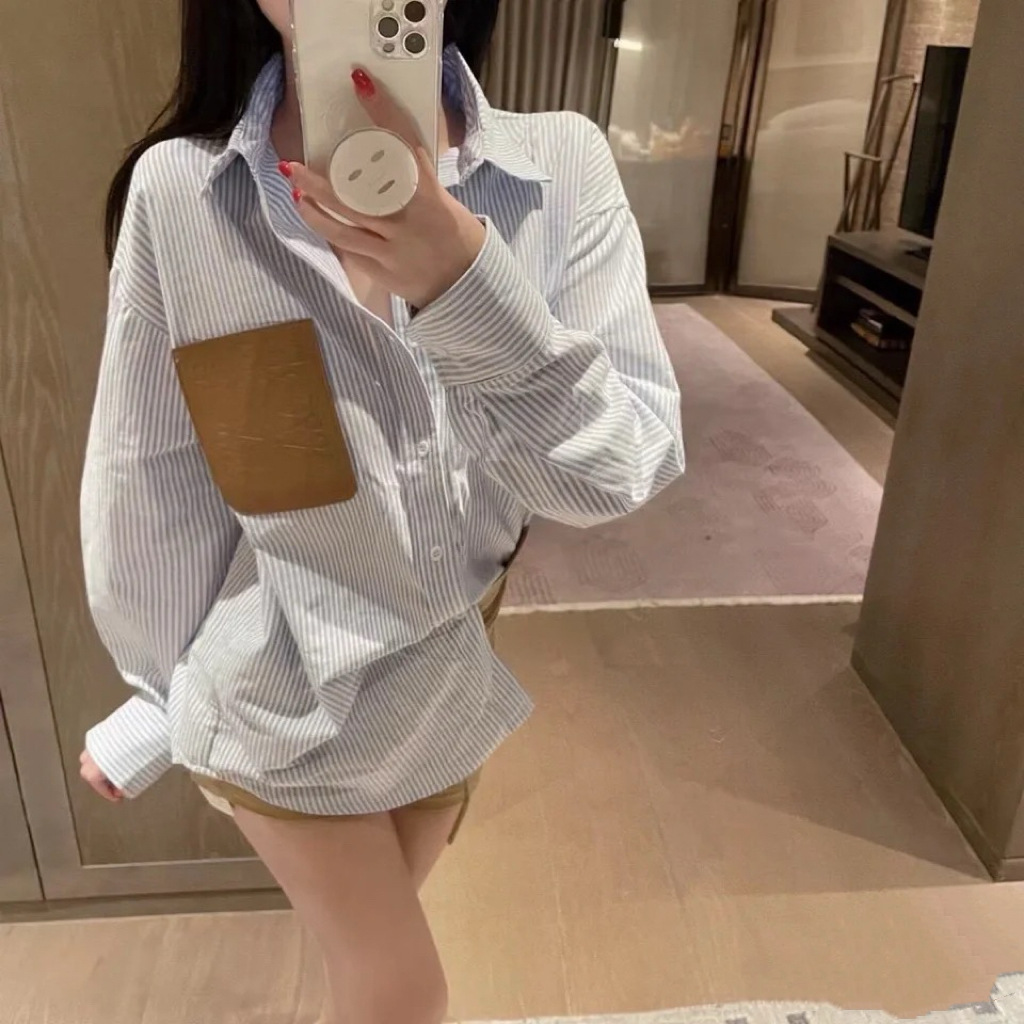 LOWE 가죽 포켓 스트라이프 긴팔 셔츠 여성 캐주얼 루즈핏 탑 일본 및 한국 스타일 패션 다용도 루즈핏스토어 가기