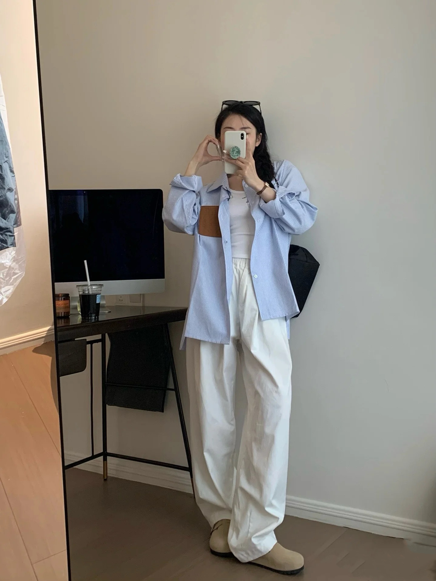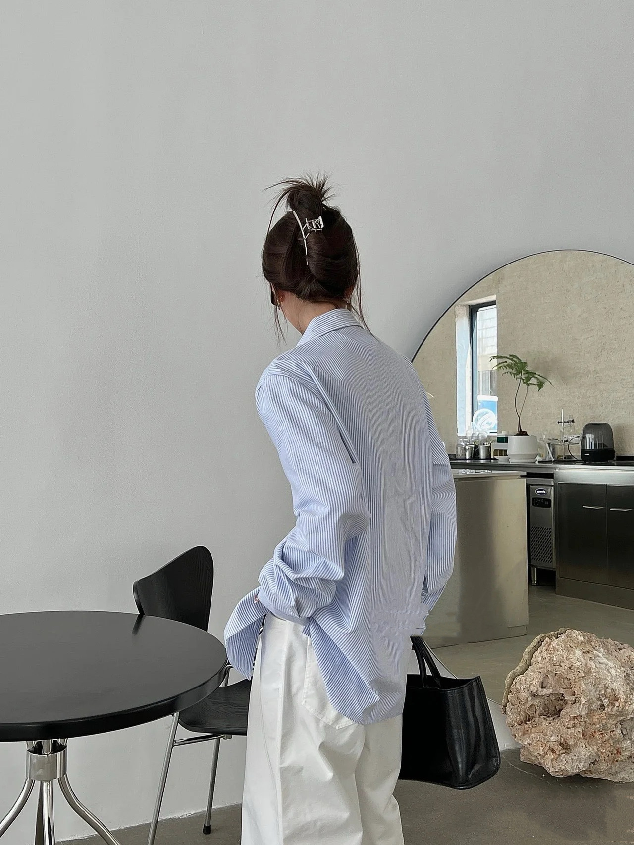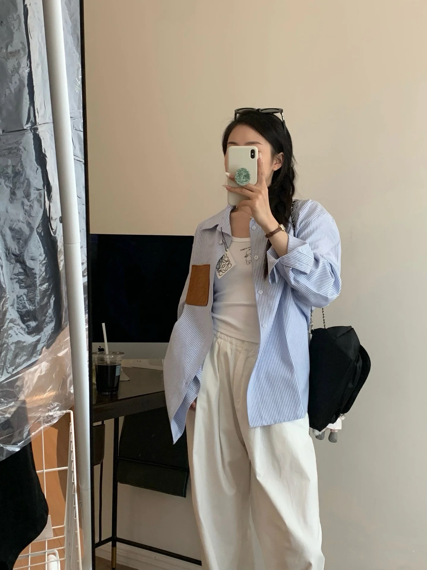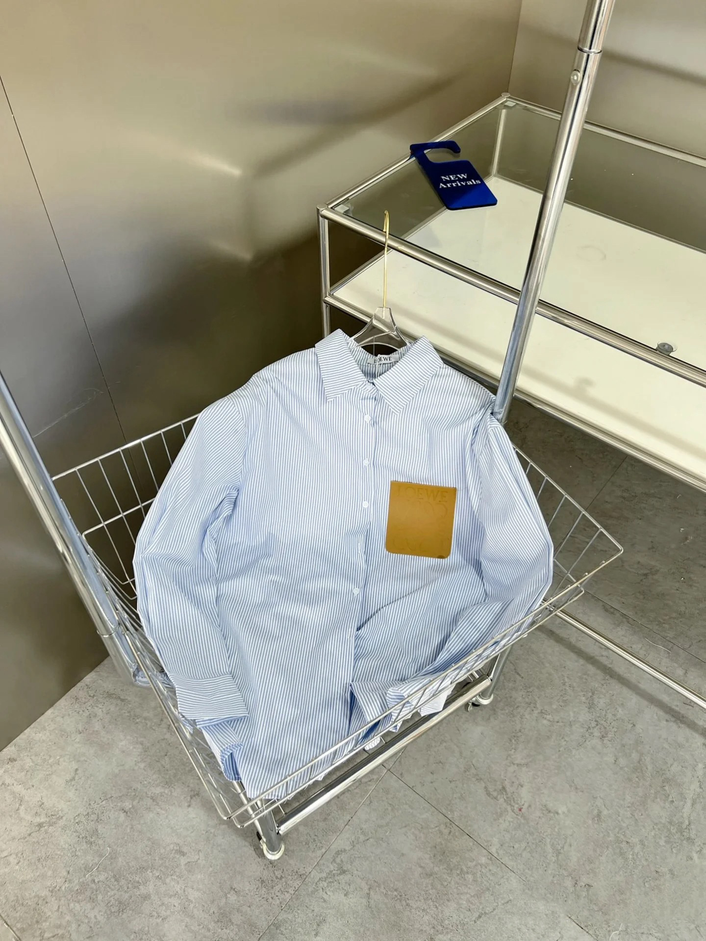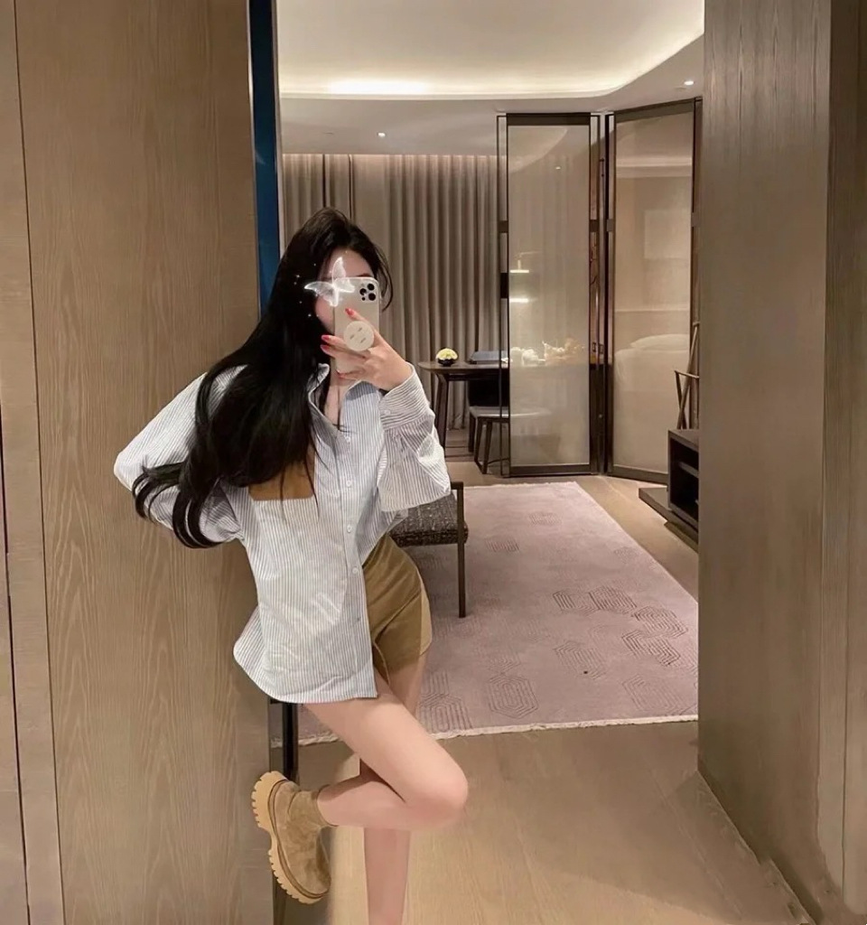 LOWE 가죽 포켓 스트라이프 긴팔 셔츠 여성 캐주얼 루즈핏 탑 일본 및 한국 스타일 패션 다용도 루즈핏스토어 가기